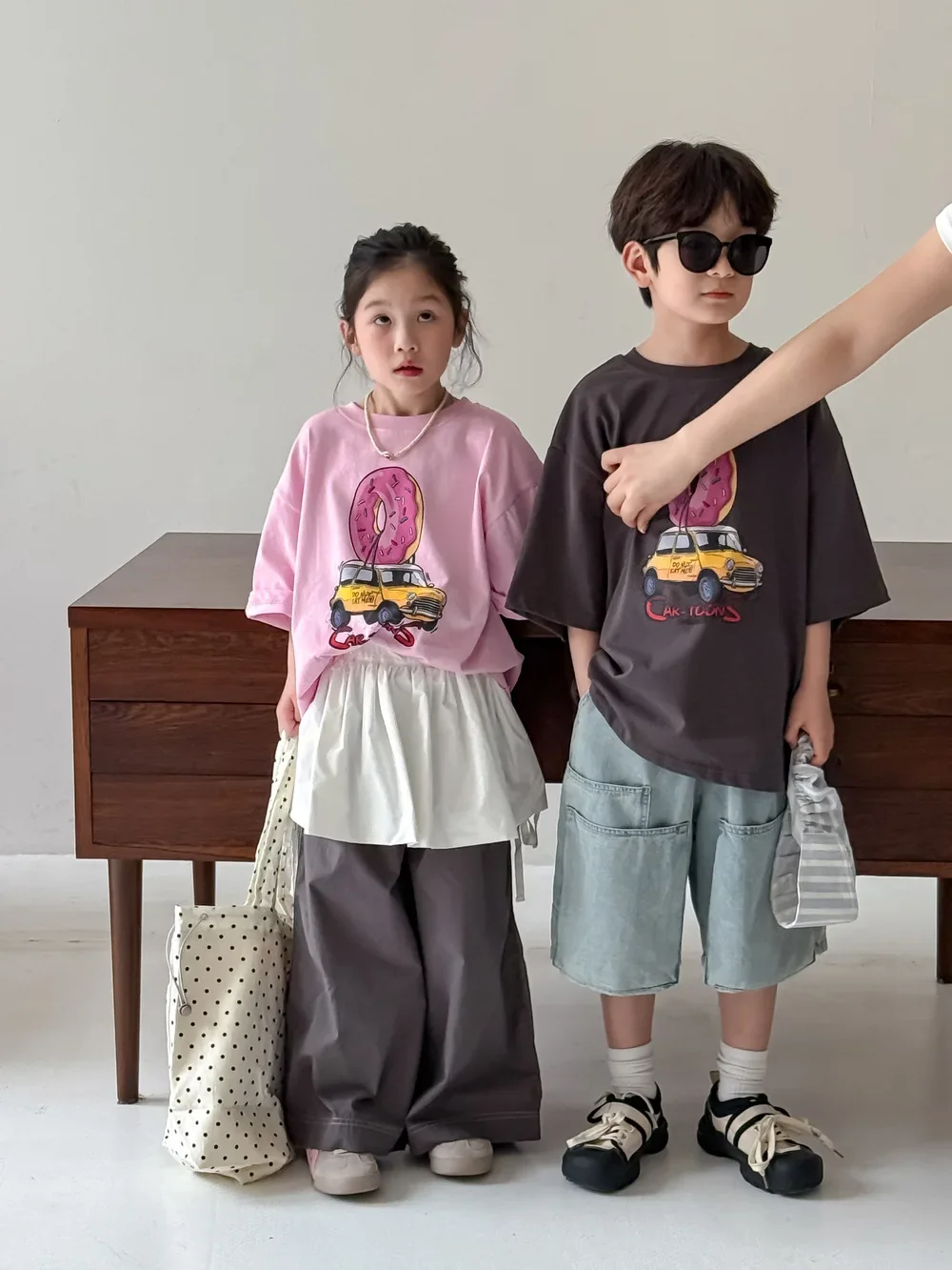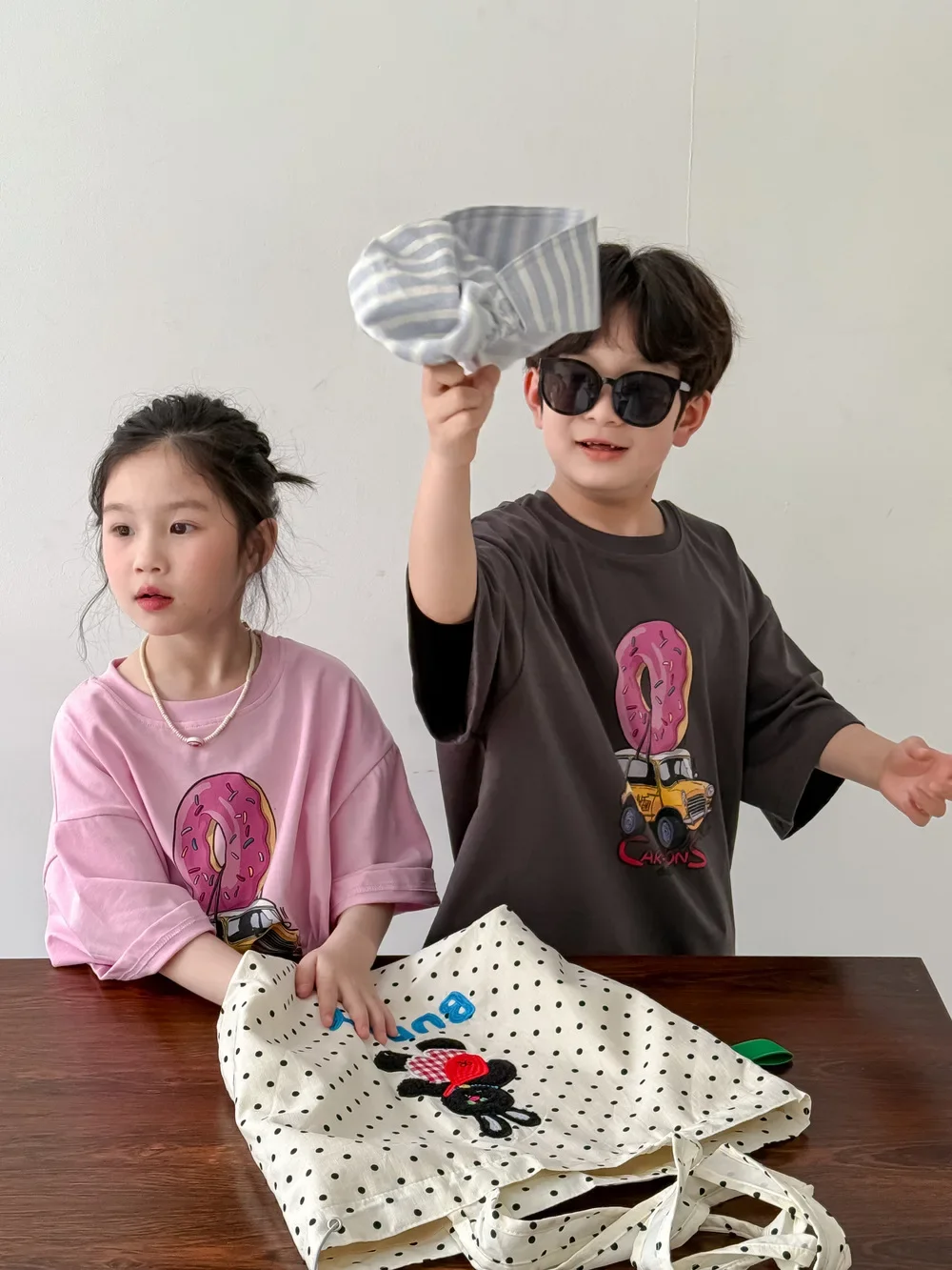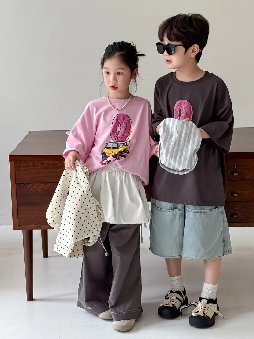 ドーナツと車が組み合わさった、ユニークなドーナツカープリント半袖Tシャツです。お子さんが大好きなモチーフが可愛らしいカートゥーン調で描かれており、見ているだけで楽しくなります。