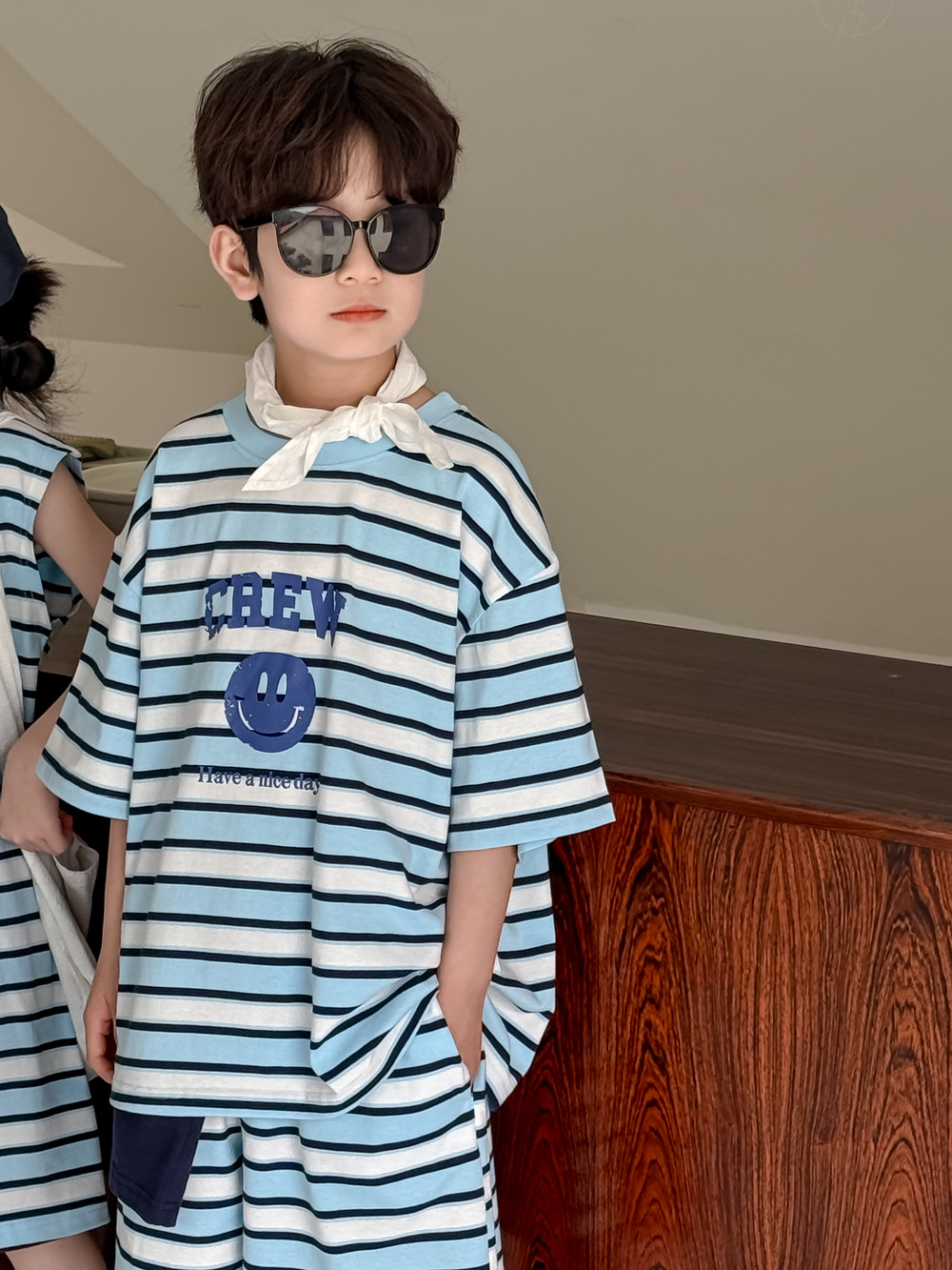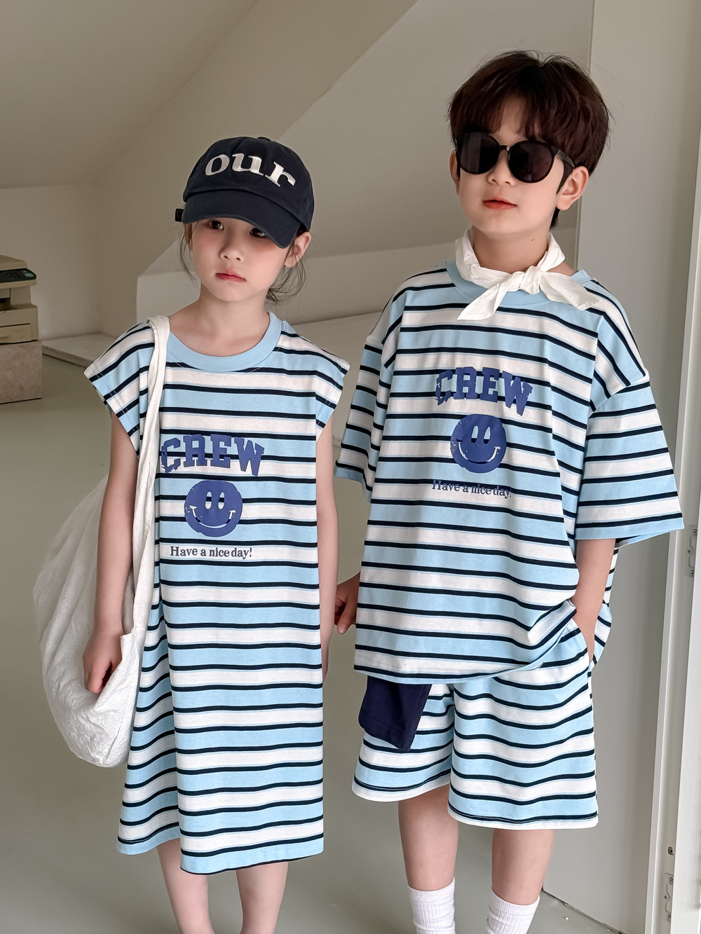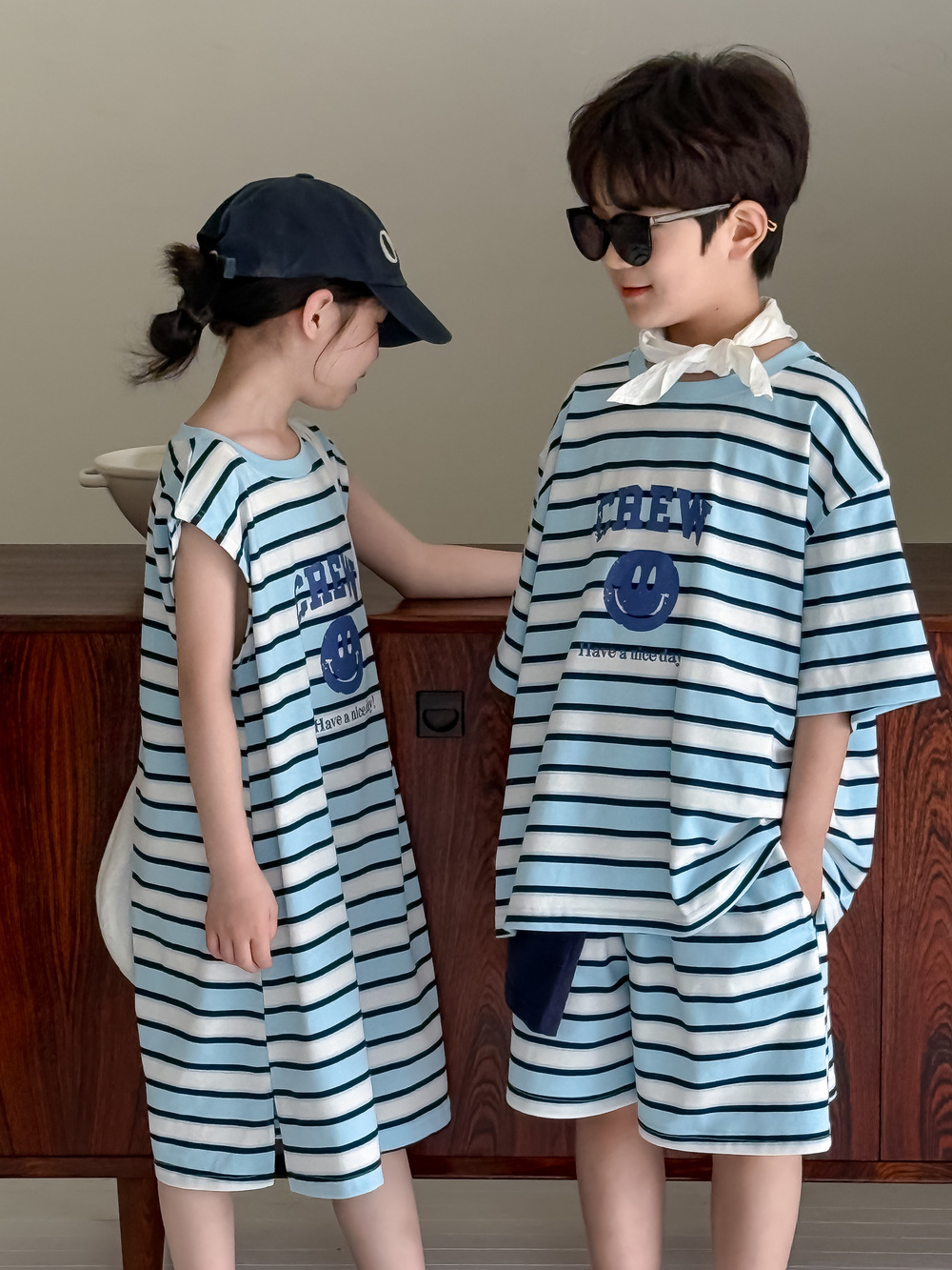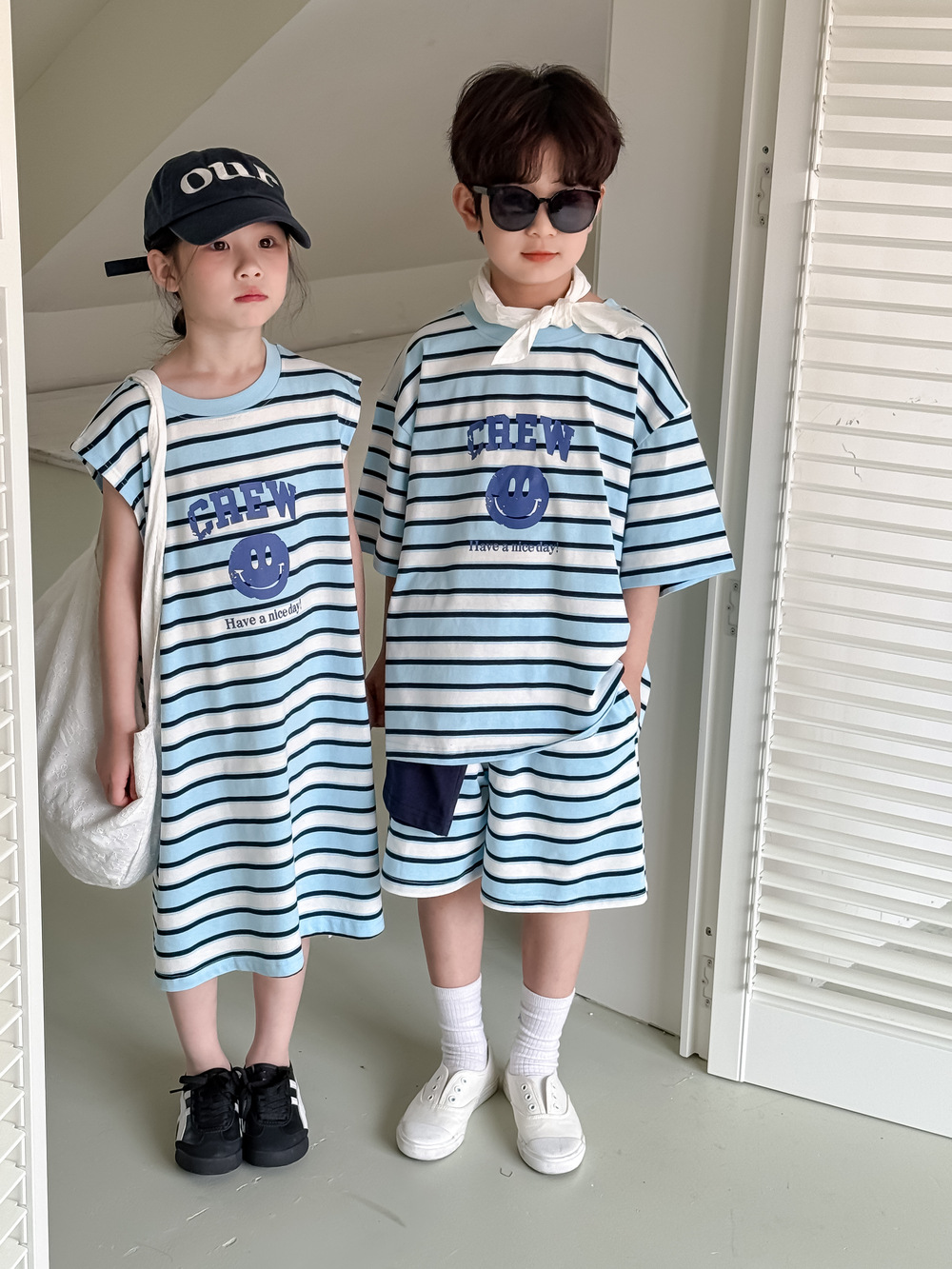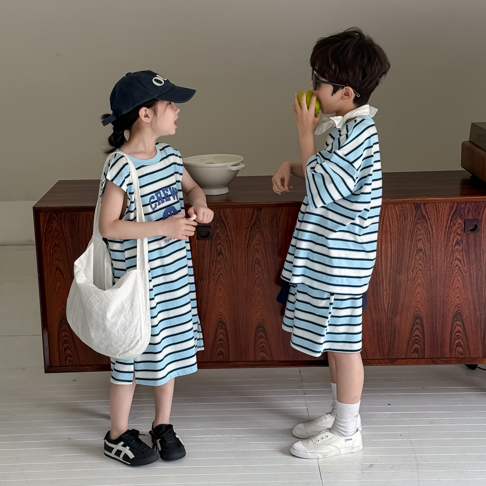半袖Tシャツとショートパンツのセットは、アルファベットとボーダー柄の組み合わせが特徴。ゆったりとした半袖Tシャツと動きやすいショートパンツで、活発に動き回るお子さんも快適に過ごせます。男の子にも女の子にも似合うユニセックスデザインなので、普段使いはもちろん、ちょっとしたお出かけにもおすすめです。兄弟姉妹でのお揃いコーデも楽しめます。