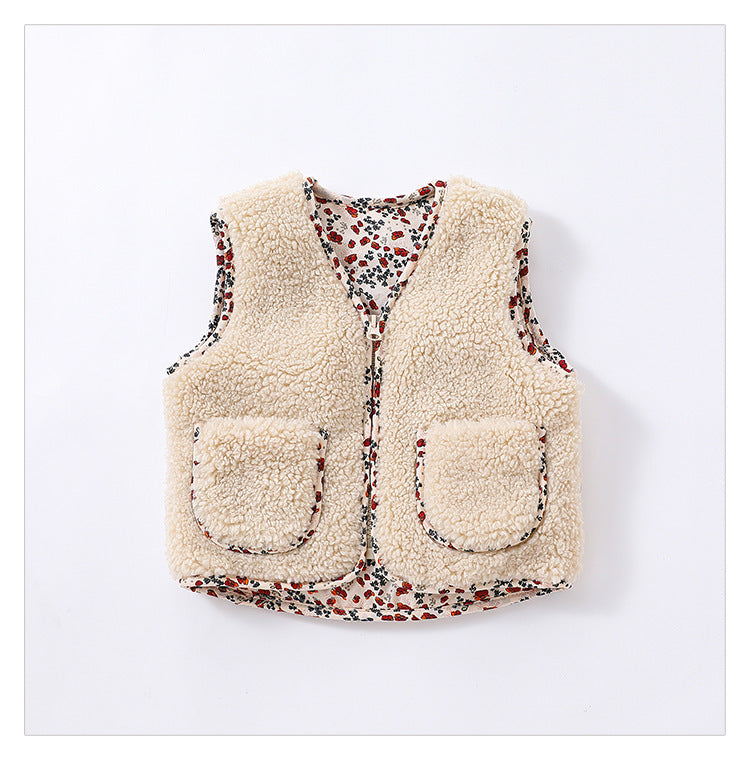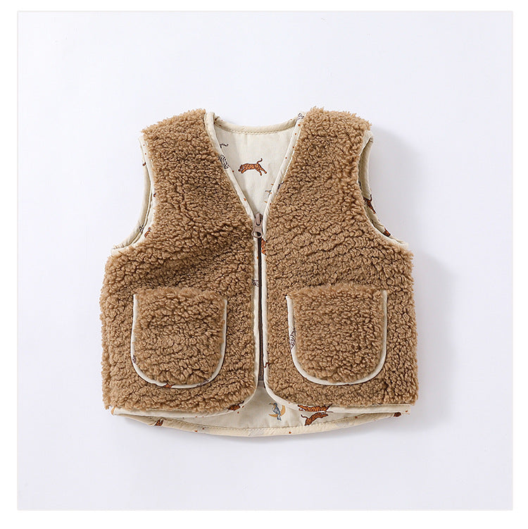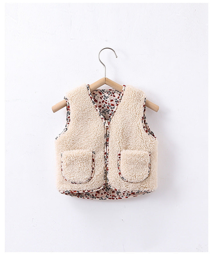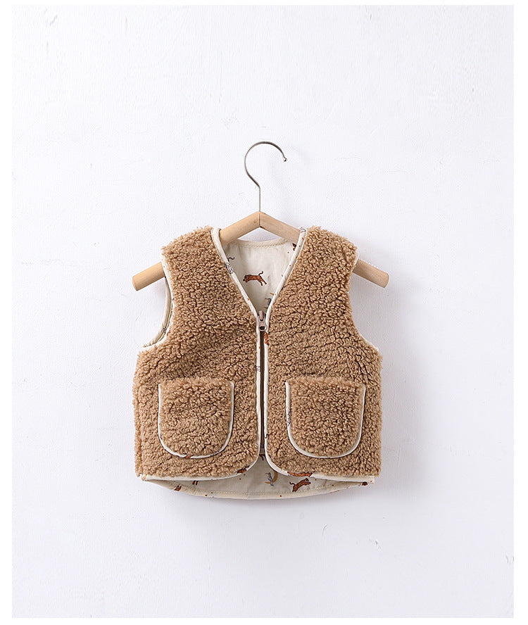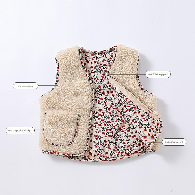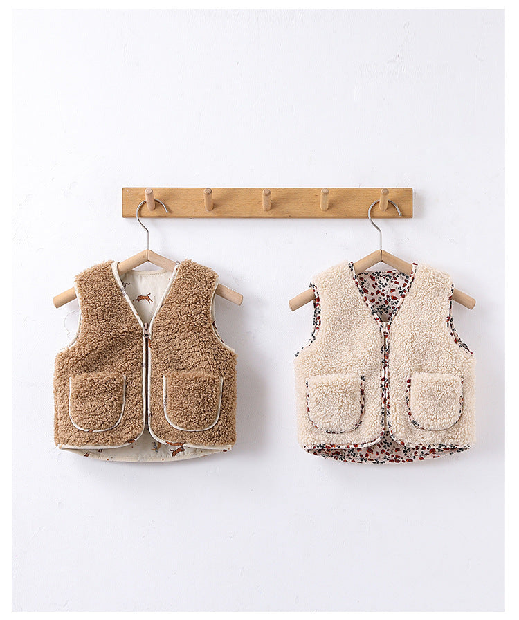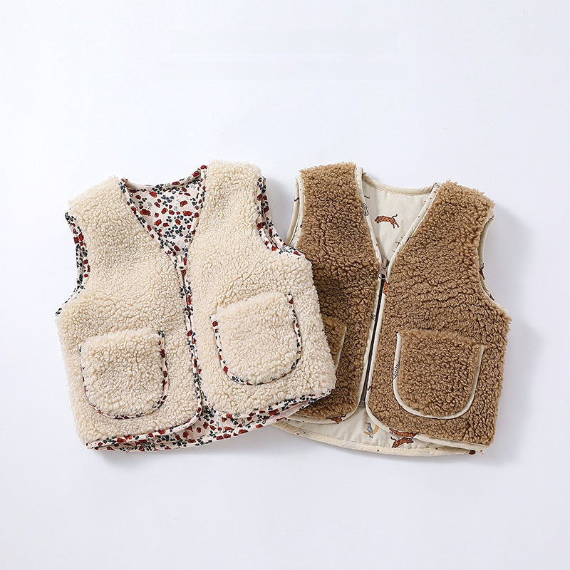 もこもことしたボア素材と、中綿入りの厚手なキルティング面を両方楽しめるリバーシブル仕様のベビー用ベストです。異なる表情を持つデザインは、その日の気分やインナーに合わせてカジュアルな着こなしの幅を広げます。保温性に優れたこのアウターは、体温調節が難しいベビーを優しく暖め、トップスやワンピースに重ねるだけでおしゃれな子ども服スタイルが完成します。