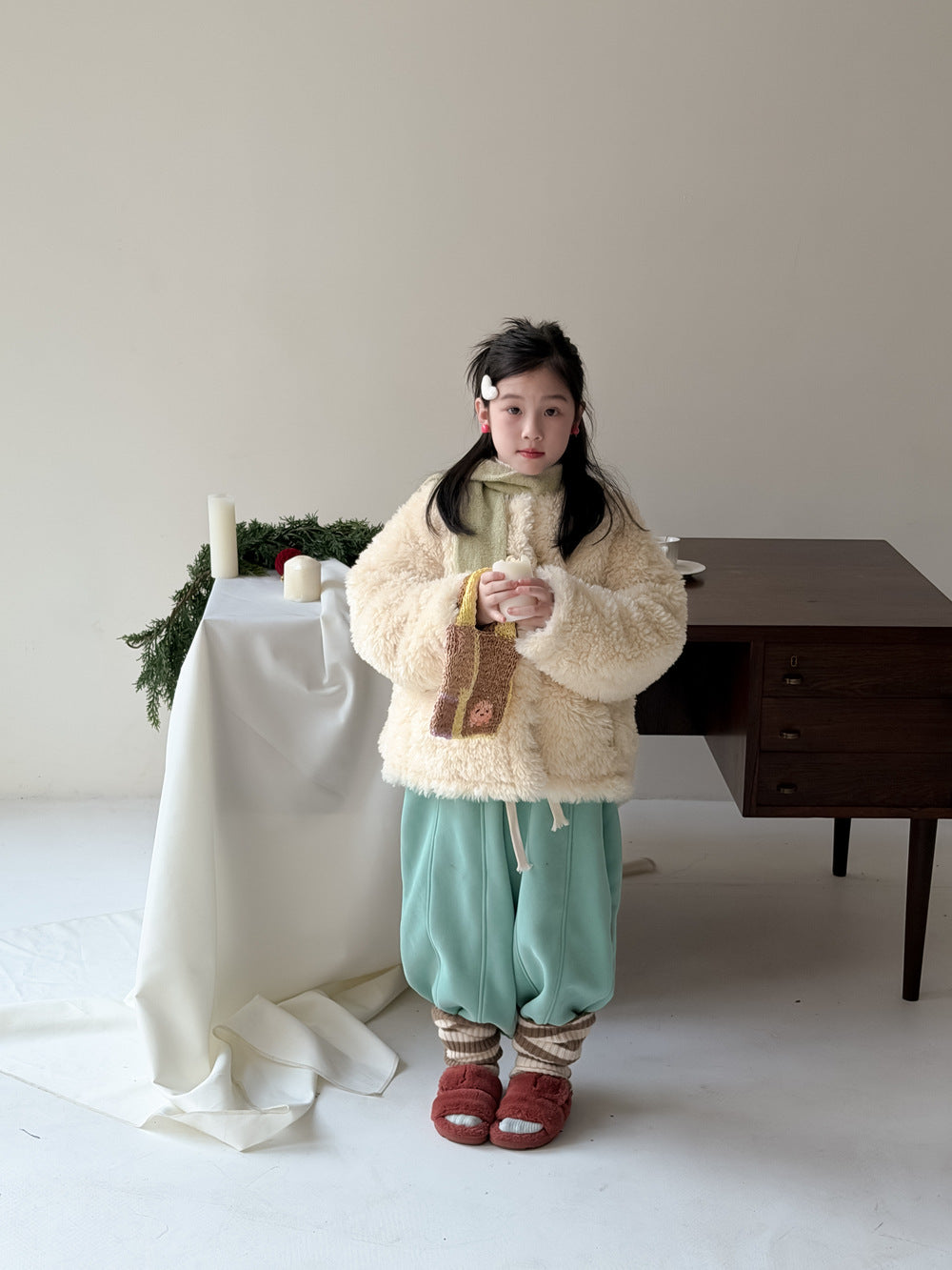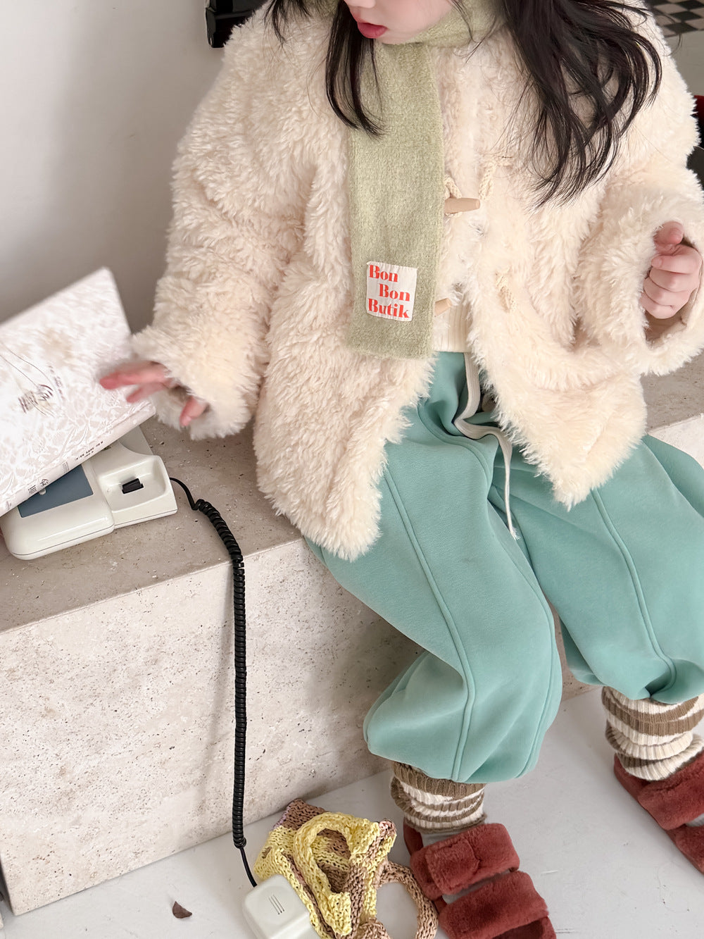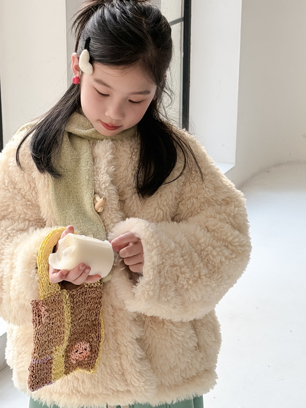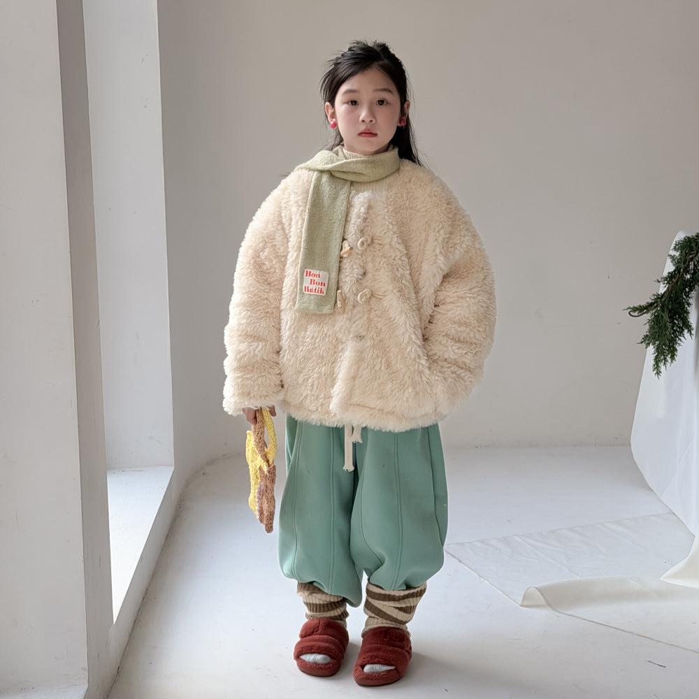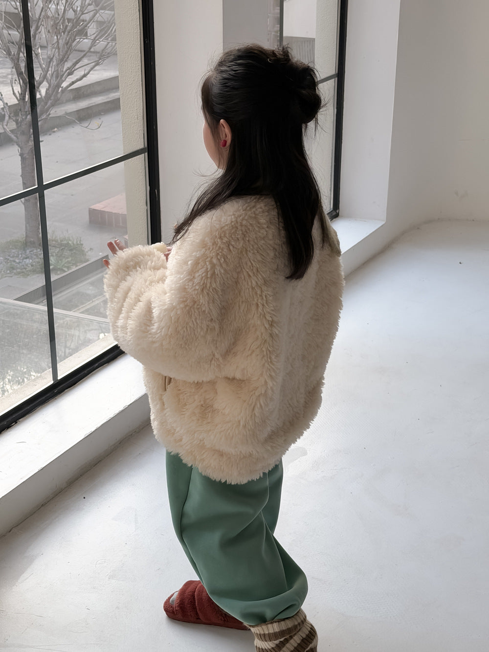 ふんわりとしたファーフリース素材が目を引くダッフルジャケットは、柔らかな質感が魅力的なアウターです。クラシカルなトグルボタンがアクセントとなり、お子さまの上品で愛らしい雰囲気を演出するデザインに仕上がっています。軽やかな着心地と優れた保温性を両立させた子供服は、日常のコーディネートをスタイリッシュに格上げする子ども服です。
