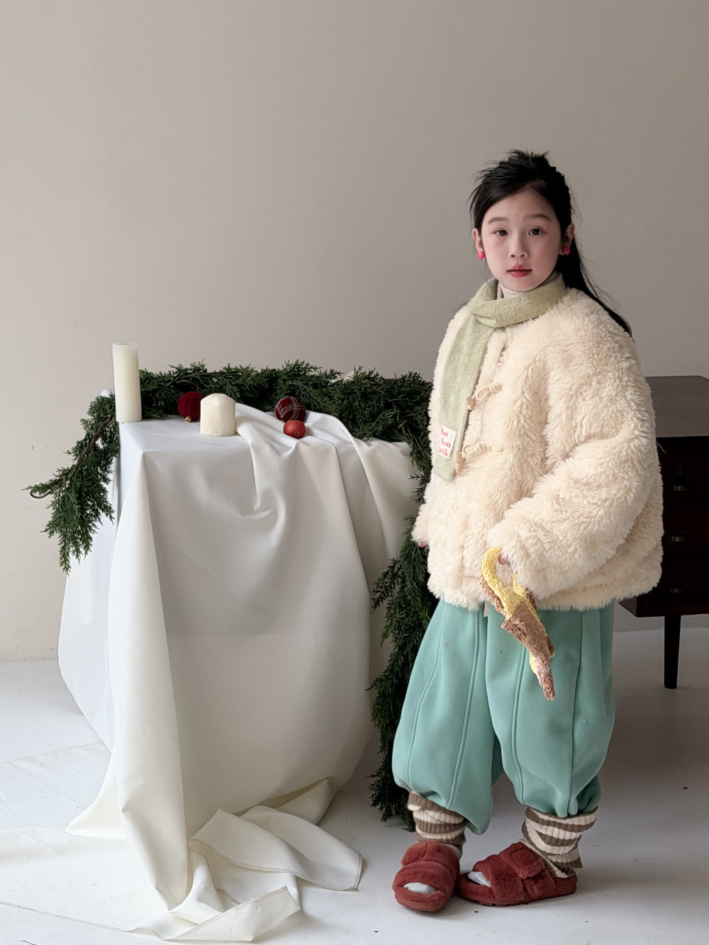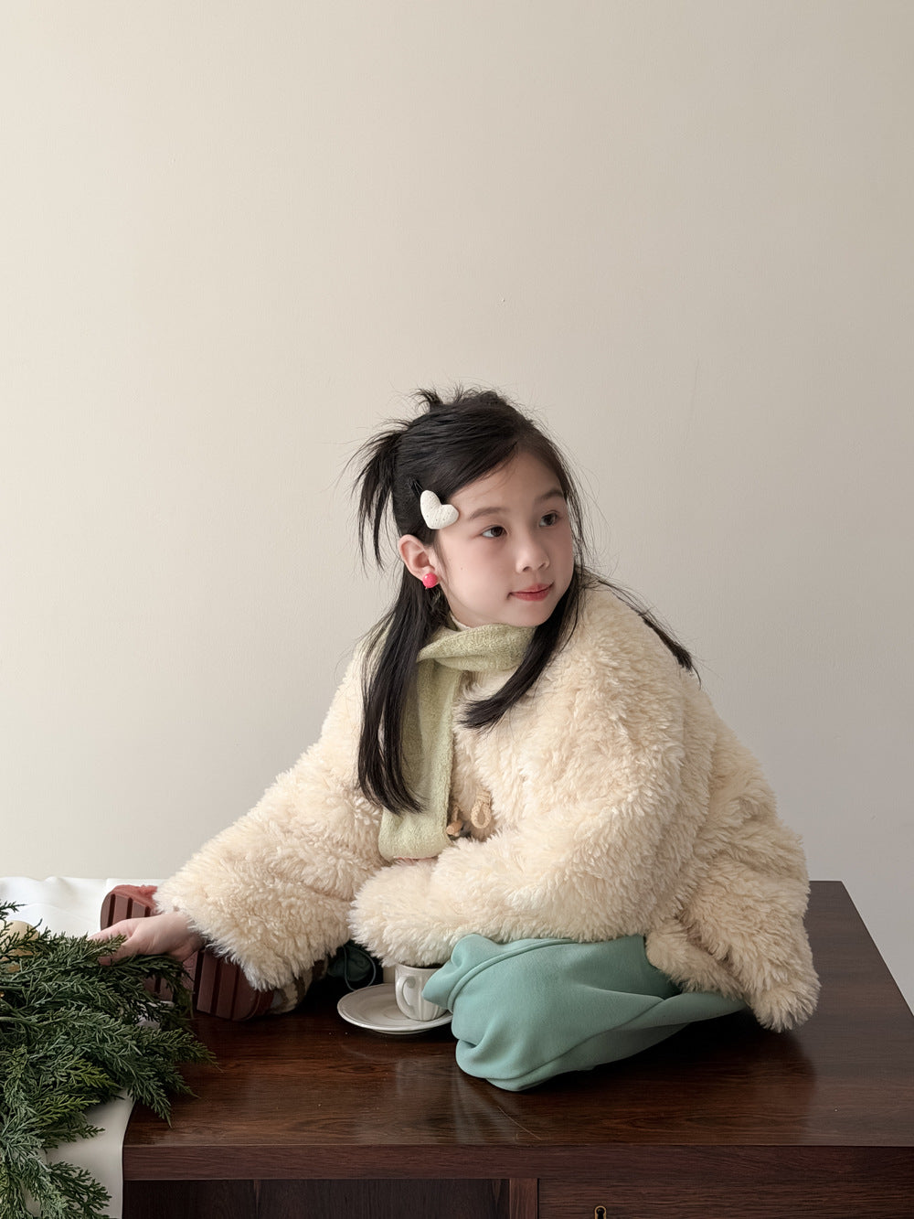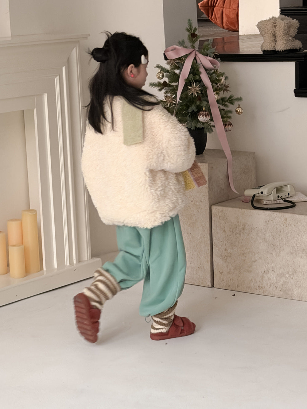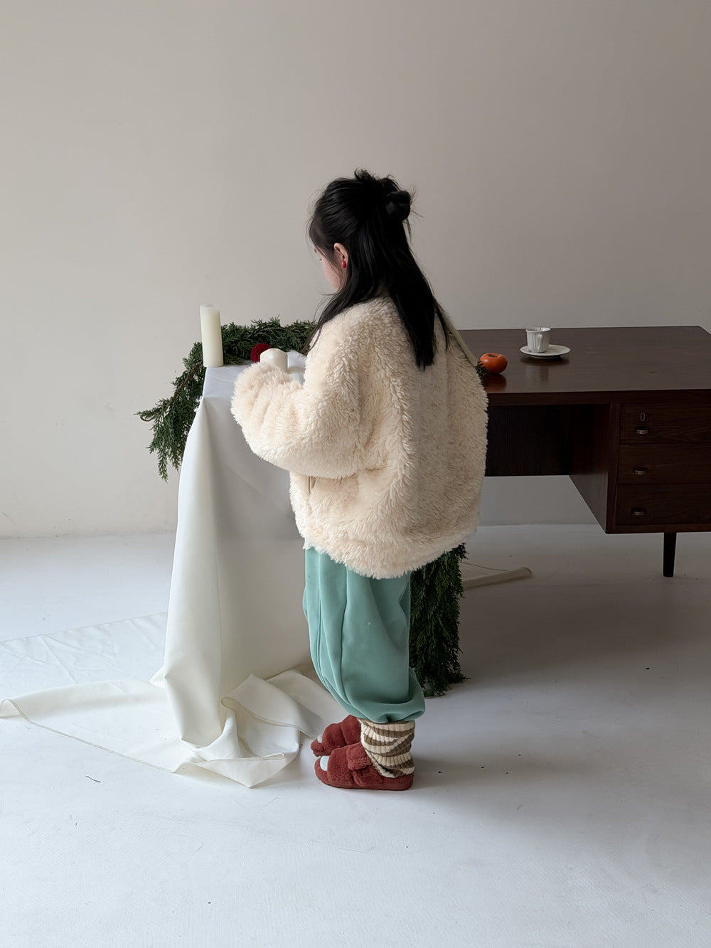 ふんわりとしたファーフリース素材が目を引くダッフルジャケットは、柔らかな質感が魅力的なアウターです。クラシカルなトグルボタンがアクセントとなり、お子さまの上品で愛らしい雰囲気を演出するデザインに仕上がっています。軽やかな着心地と優れた保温性を両立させた子供服は、日常のコーディネートをスタイリッシュに格上げする子ども服です。