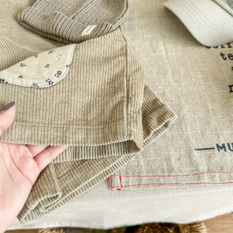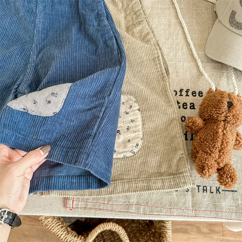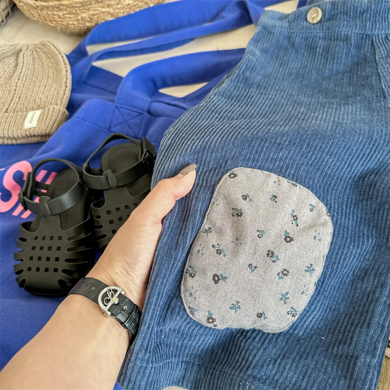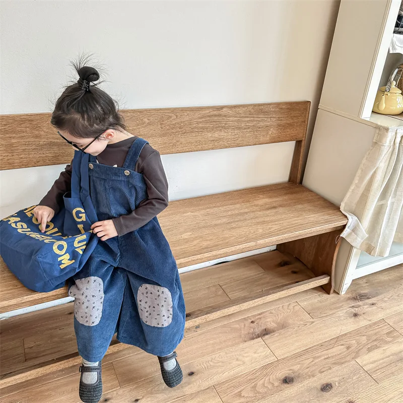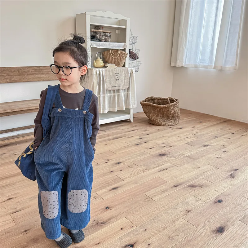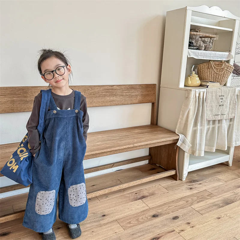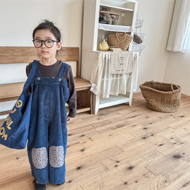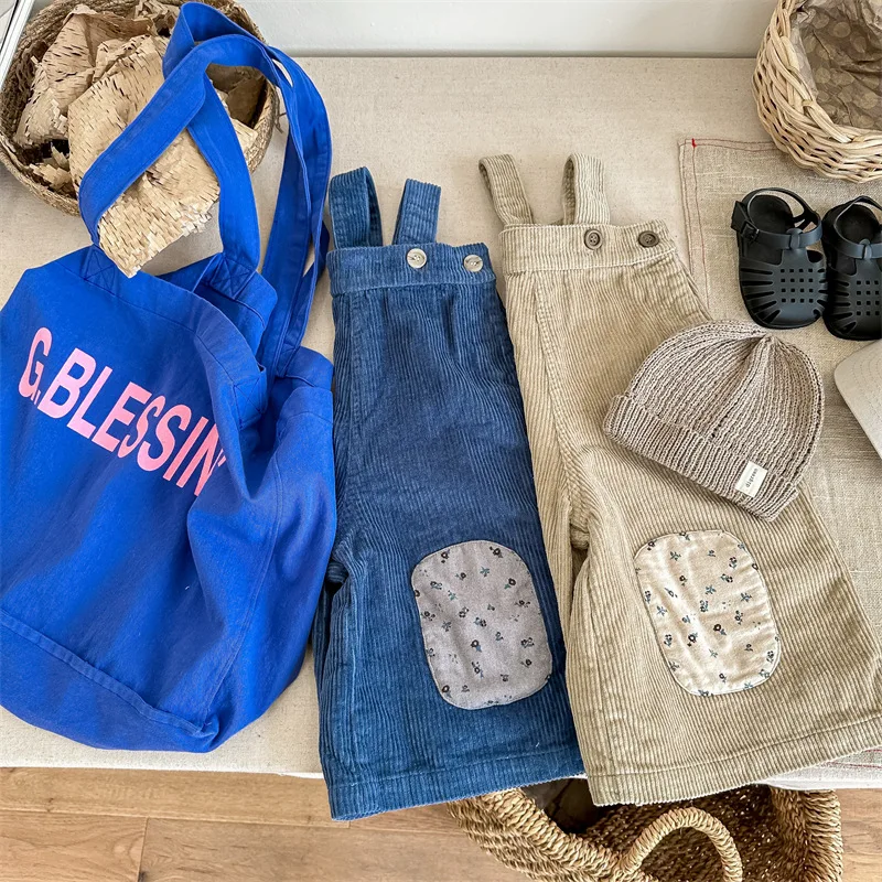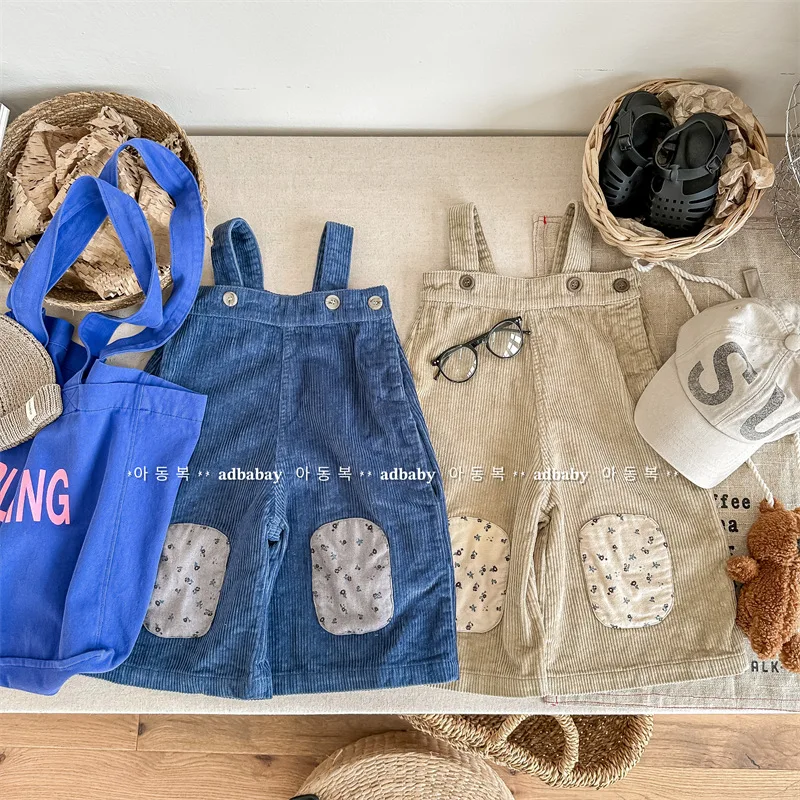 キッズ コーデュロイ フラワー 膝パッチ サスペンダーパンツ サロペット パンツ ガールズ