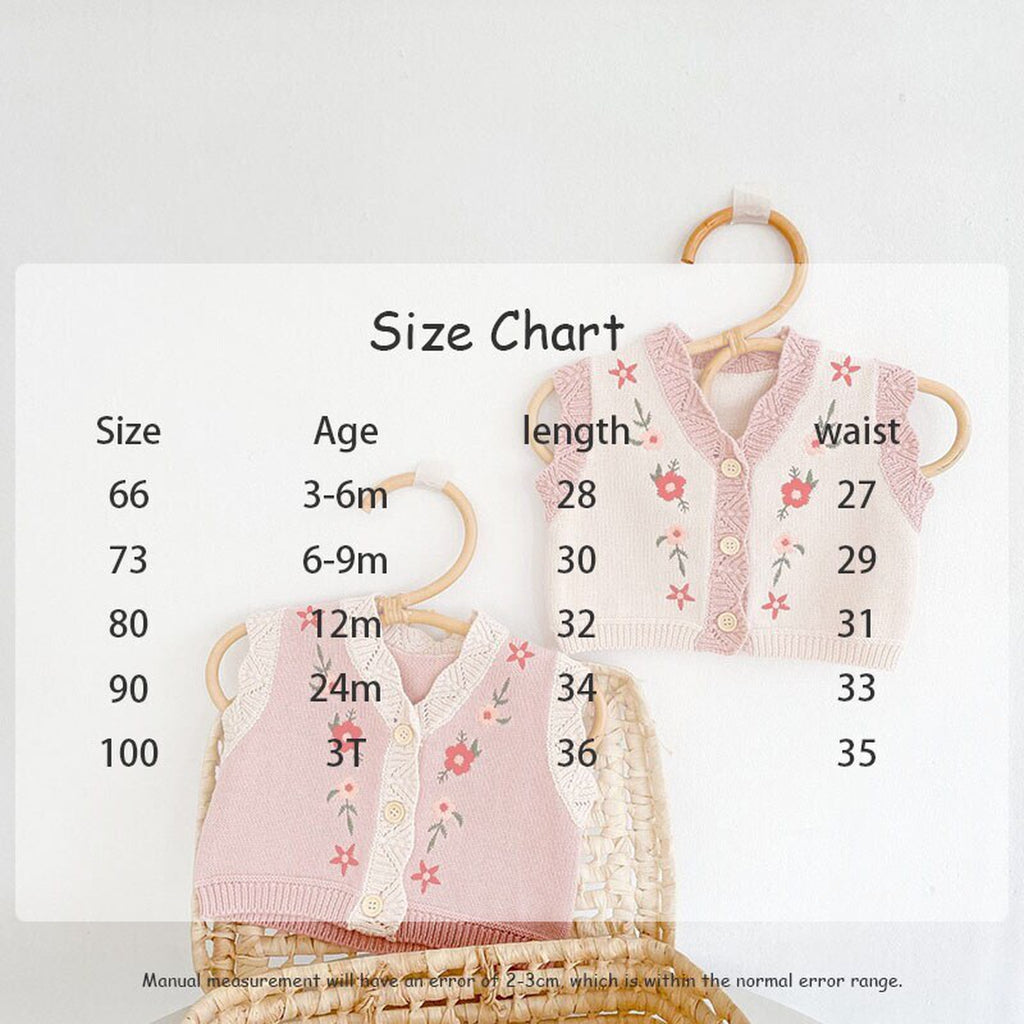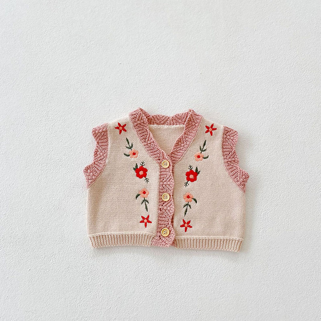 このかわいいベビー用のニットベストは、華やかなフラワーの刺繍が施されており、赤ちゃんのファッションスタイルを引き立てます。柔らかなニット素材で作られているので、赤ちゃんの肌に優しく、暖かく快適に着用することができます。Vネックデザインで、女の子のかわいらしいウエストコートとしてもお使いいただけます。これからの赤ちゃんにぴったりのおしゃれなアイテムです。