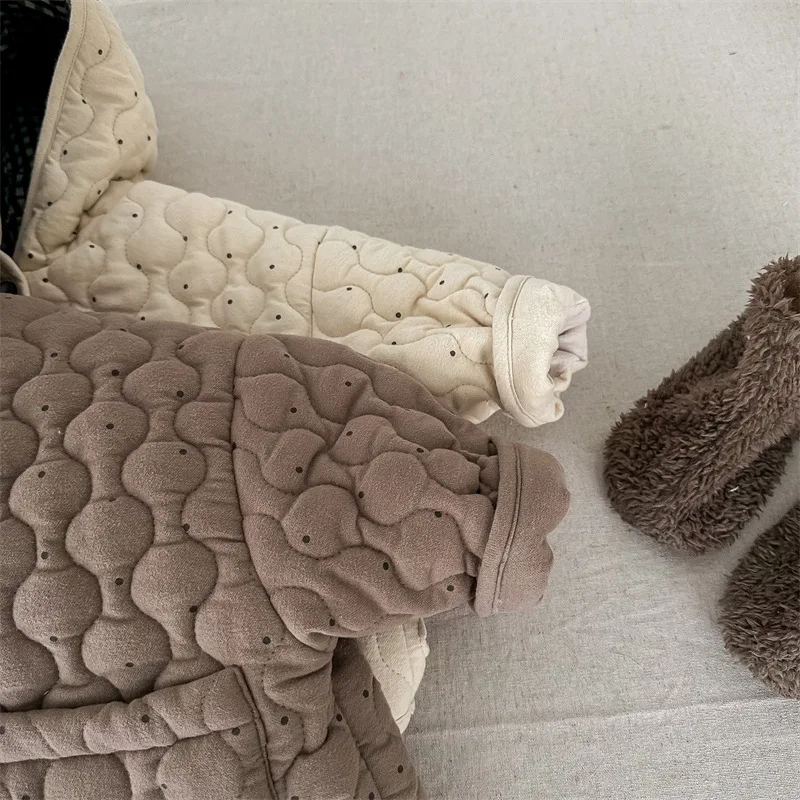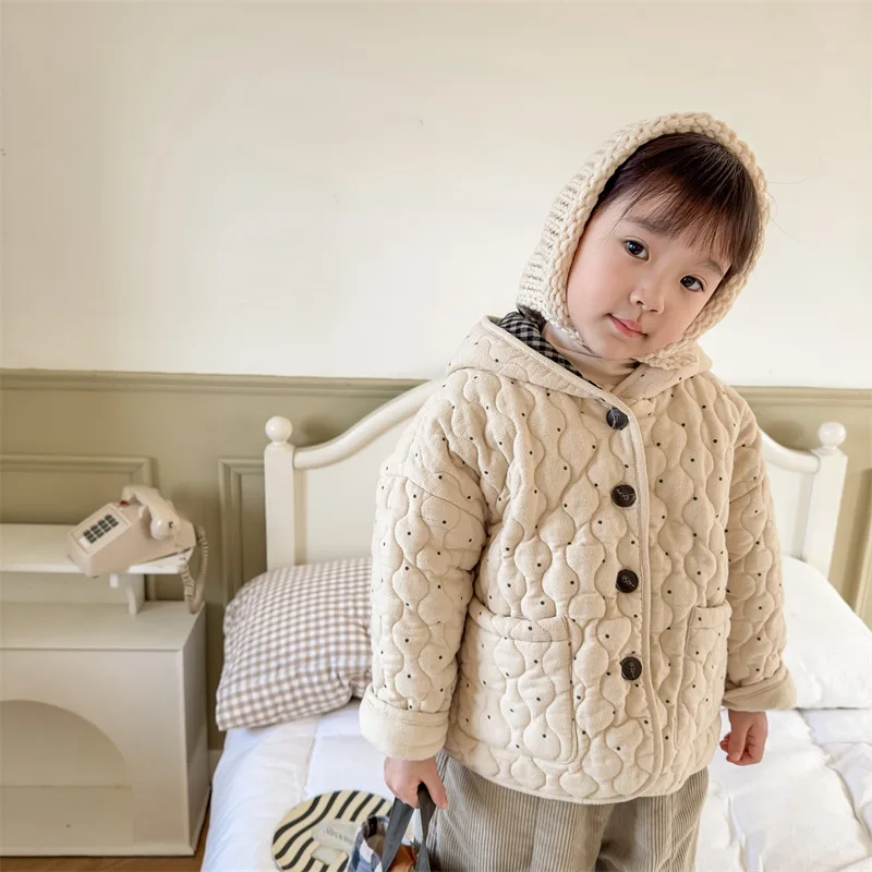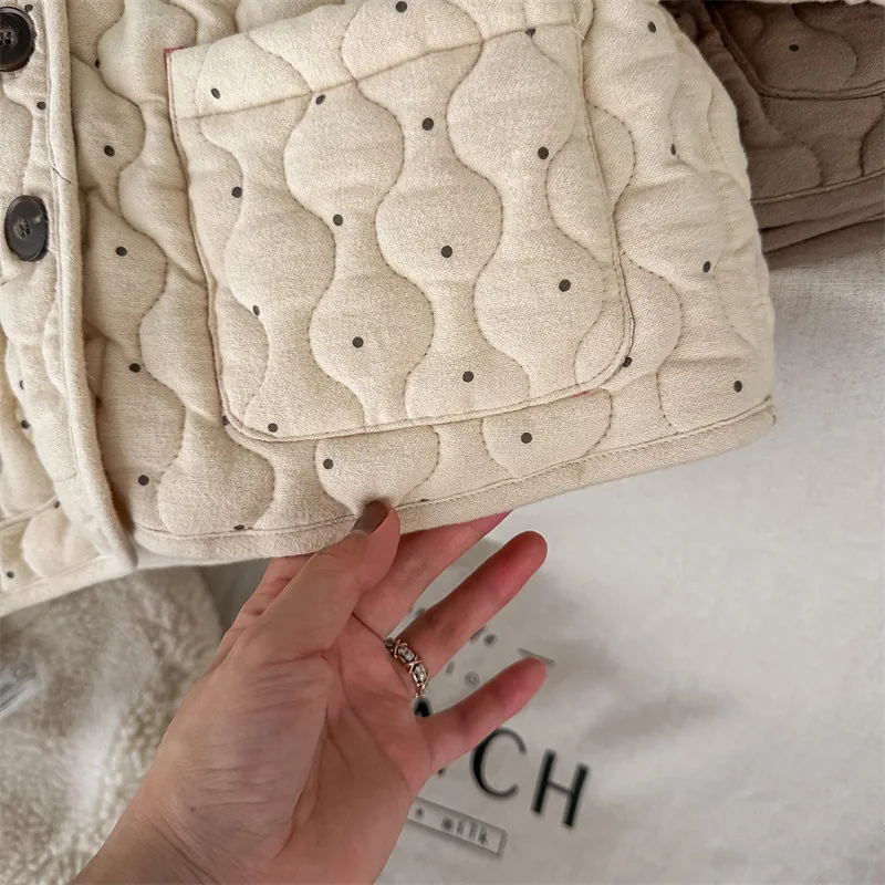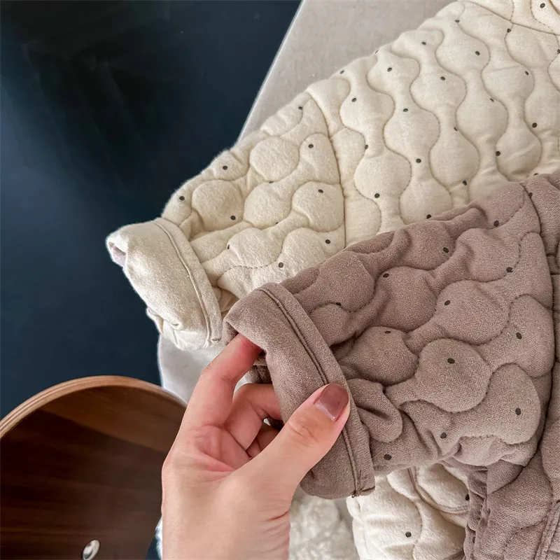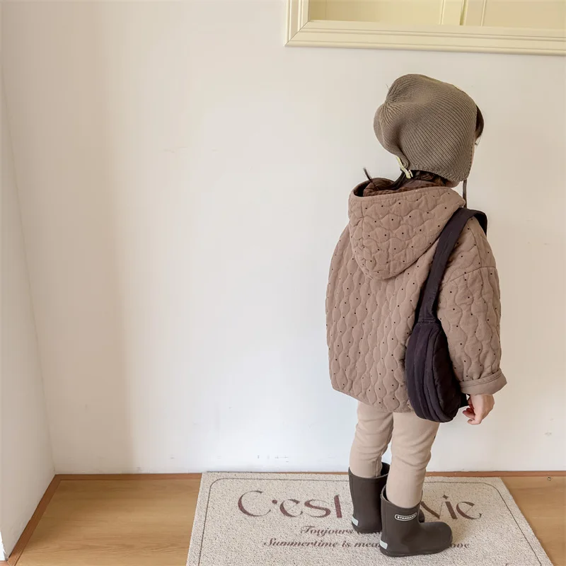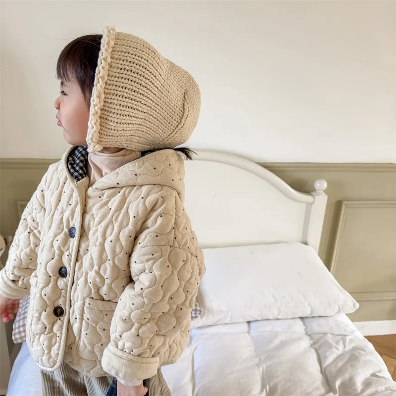 寒い季節にピッタリの、みずたま柄のキルティング裏フリースフーディジャケットです。暖かな裏フリース素材と可愛らしいみずたま柄が特徴で、お子様が寒さから守られながらおしゃれに過ごせます。フード付きで風や寒さから頭もしっかり守ってくれます。