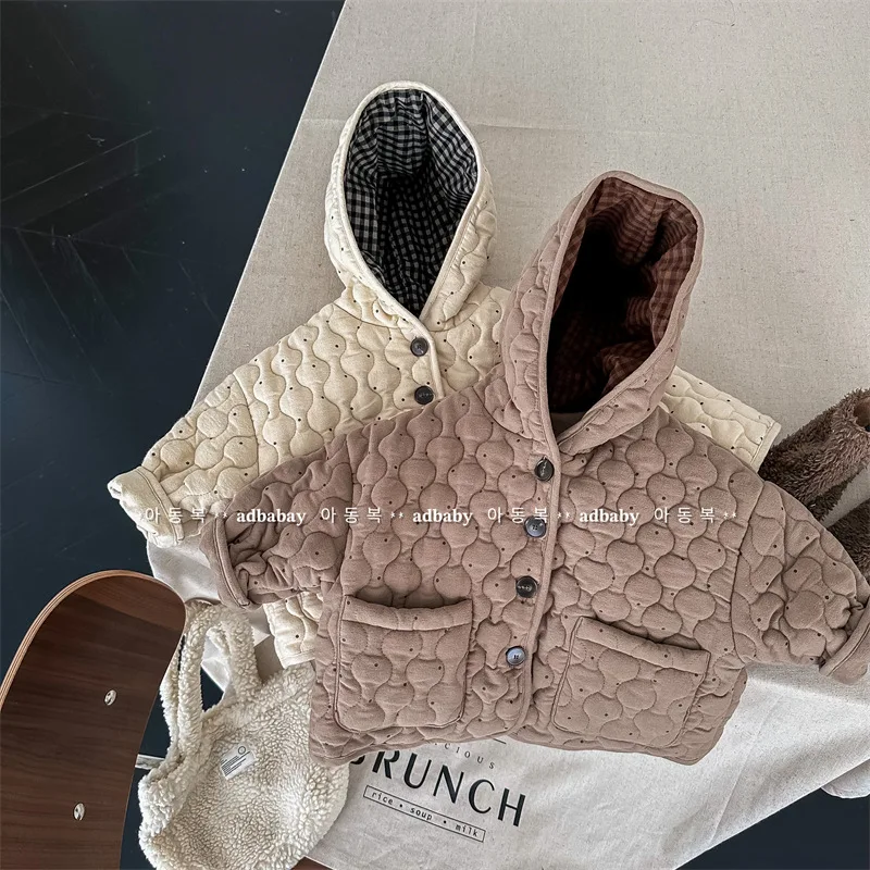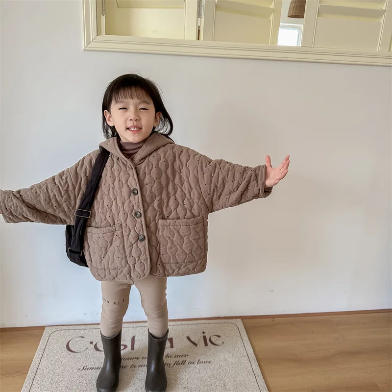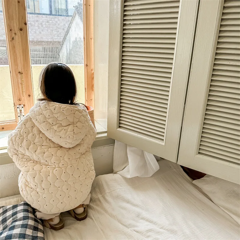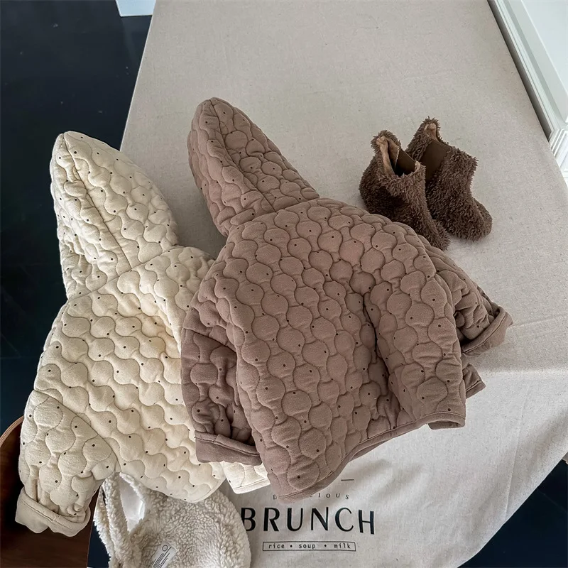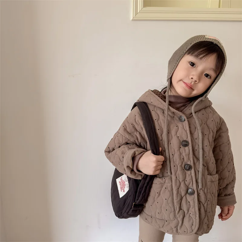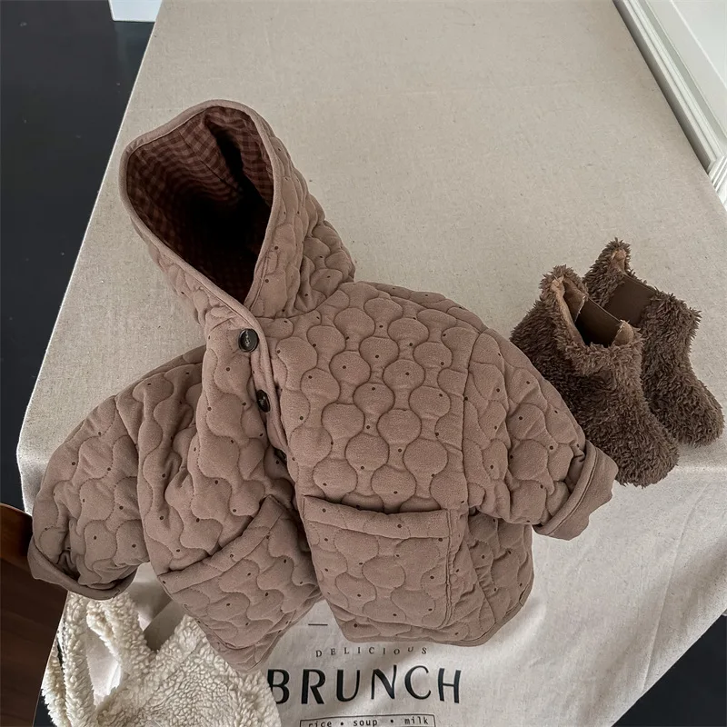 寒い季節にピッタリの、みずたま柄のキルティング裏フリースフーディジャケットです。暖かな裏フリース素材と可愛らしいみずたま柄が特徴で、お子様が寒さから守られながらおしゃれに過ごせます。フード付きで風や寒さから頭もしっかり守ってくれます。
