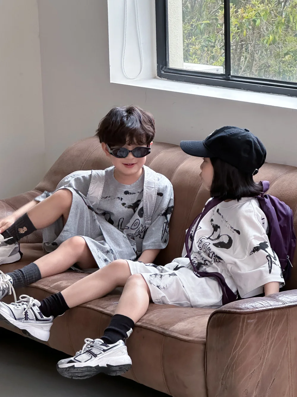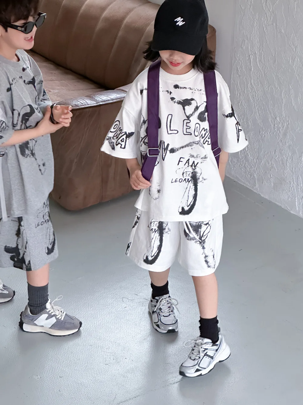 キッズセットアップ 2点セット 半袖Tシャツ+ハーフパンツ グラフィックプリント 2カラー【mh0005284】