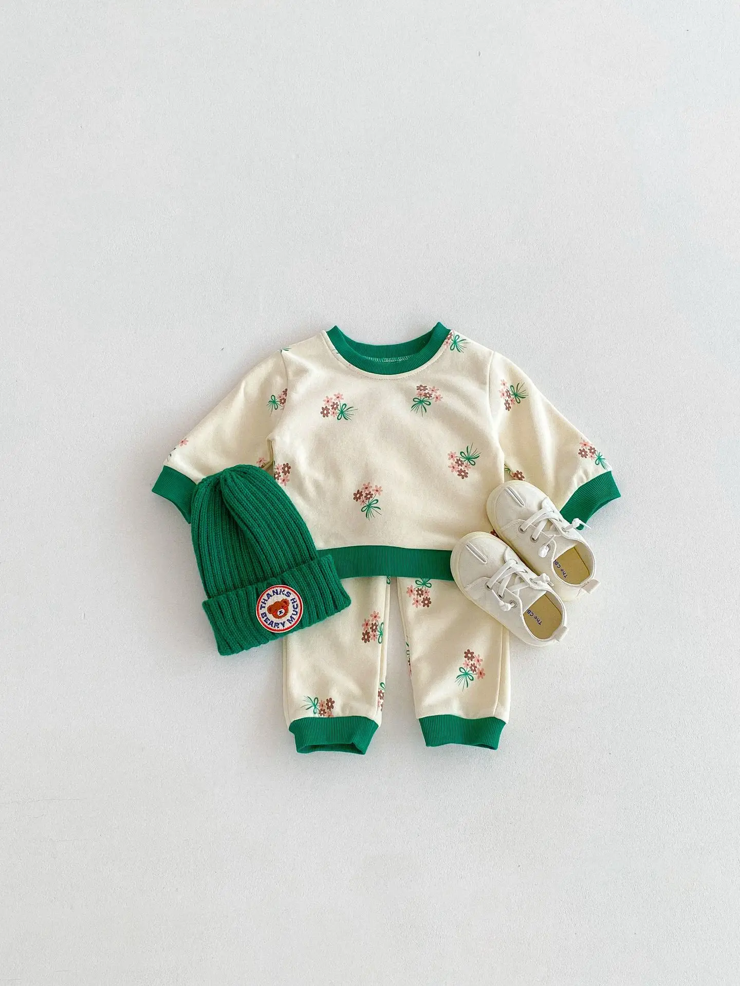 ベビーキッズセットアップ 2点セット スウェットシャツ+ロングパンツ レトロバイピング フラワープリント【mh0006438】