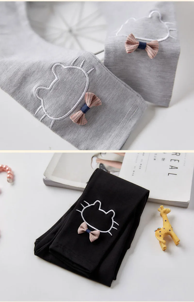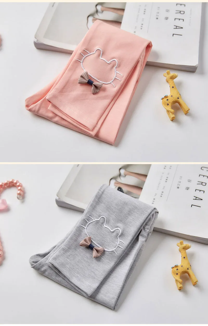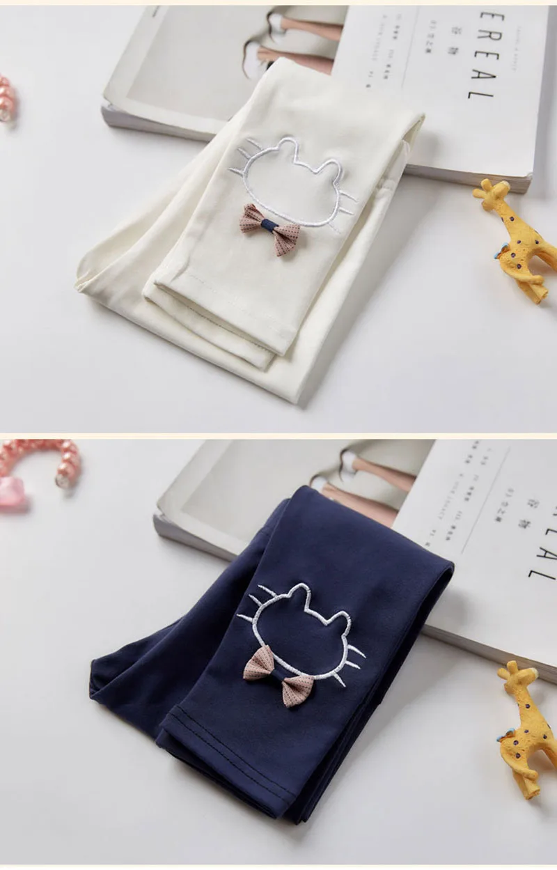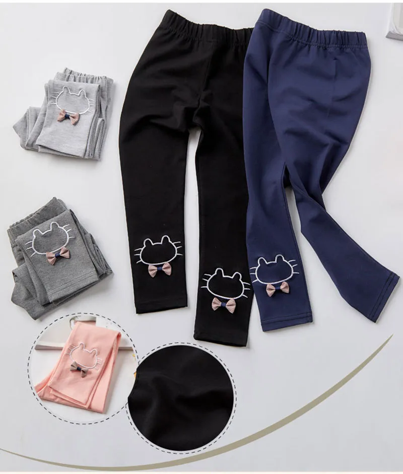 秋にぴったりの子供用レギンスパンツ。子供用アウターに最適な薄手のデザインで、かわいらしい猫とリボン刺繍が施されています。5つのカラーからお選びいただけます。