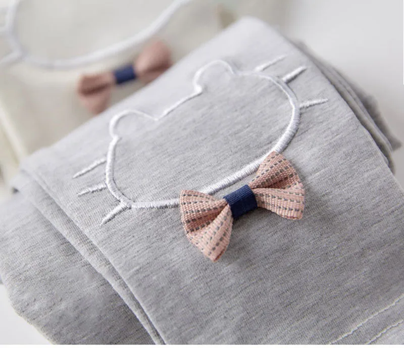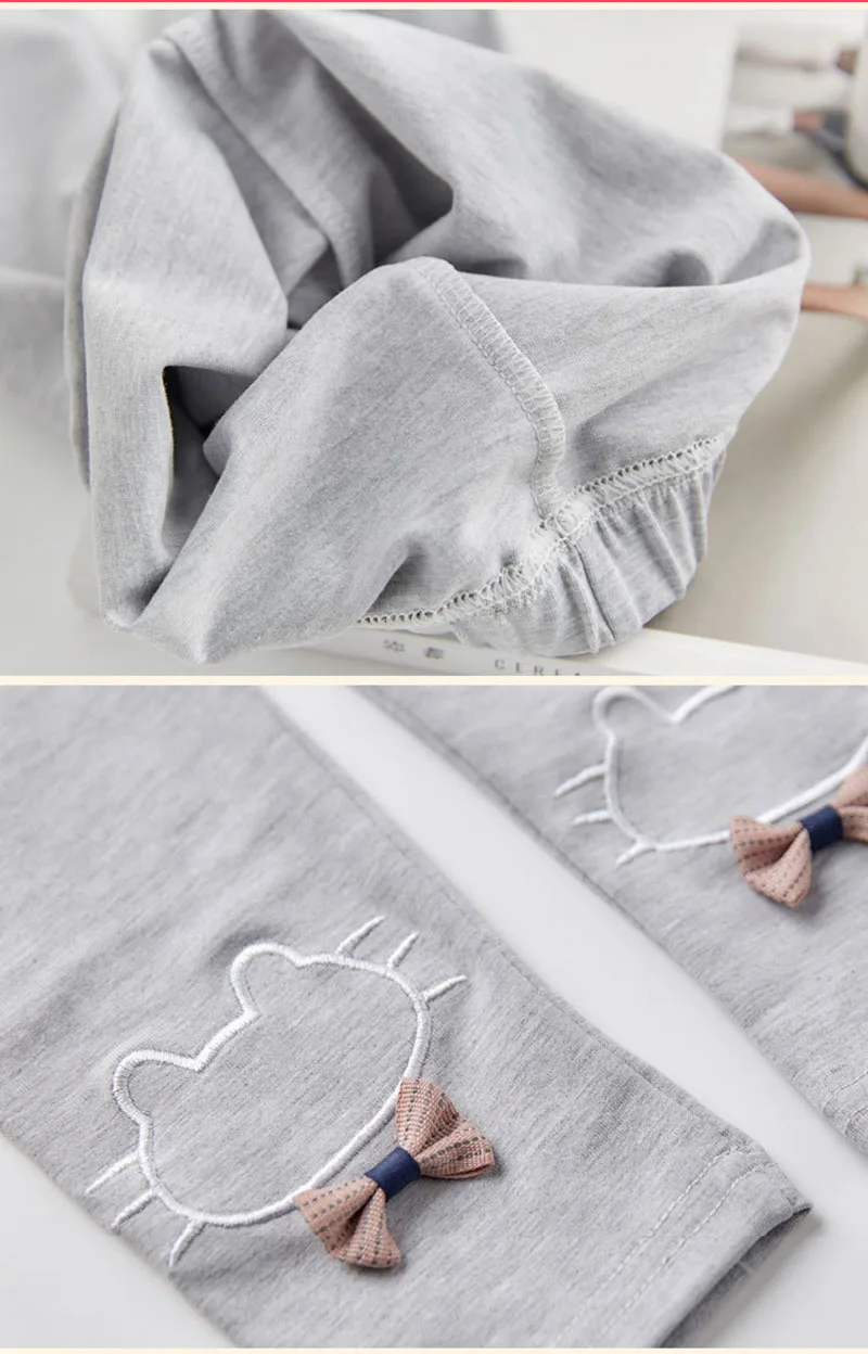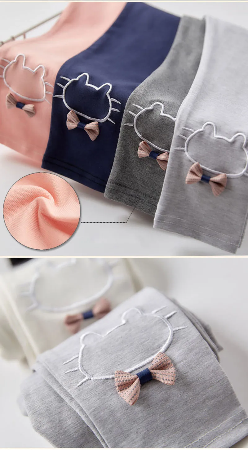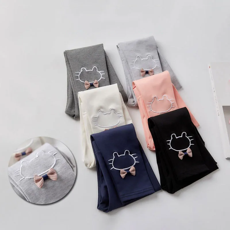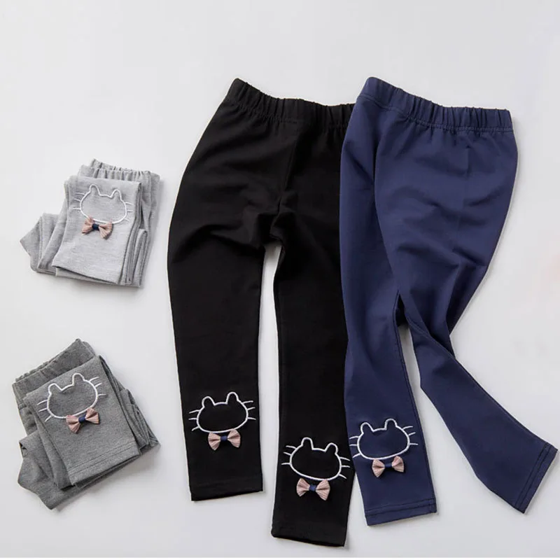 秋にぴったりの子供用レギンスパンツ。子供用アウターに最適な薄手のデザインで、かわいらしい猫とリボン刺繍が施されています。5つのカラーからお選びいただけます。