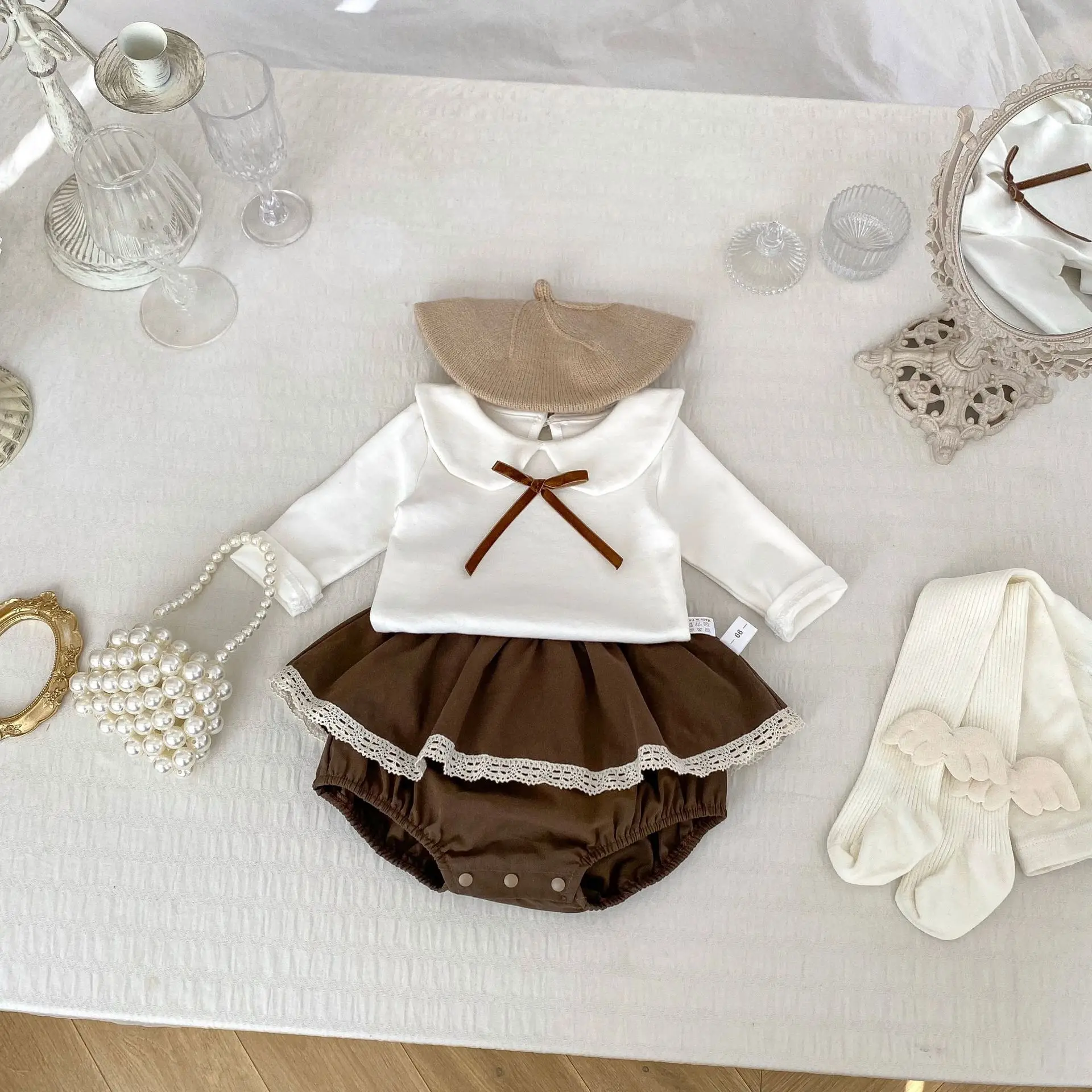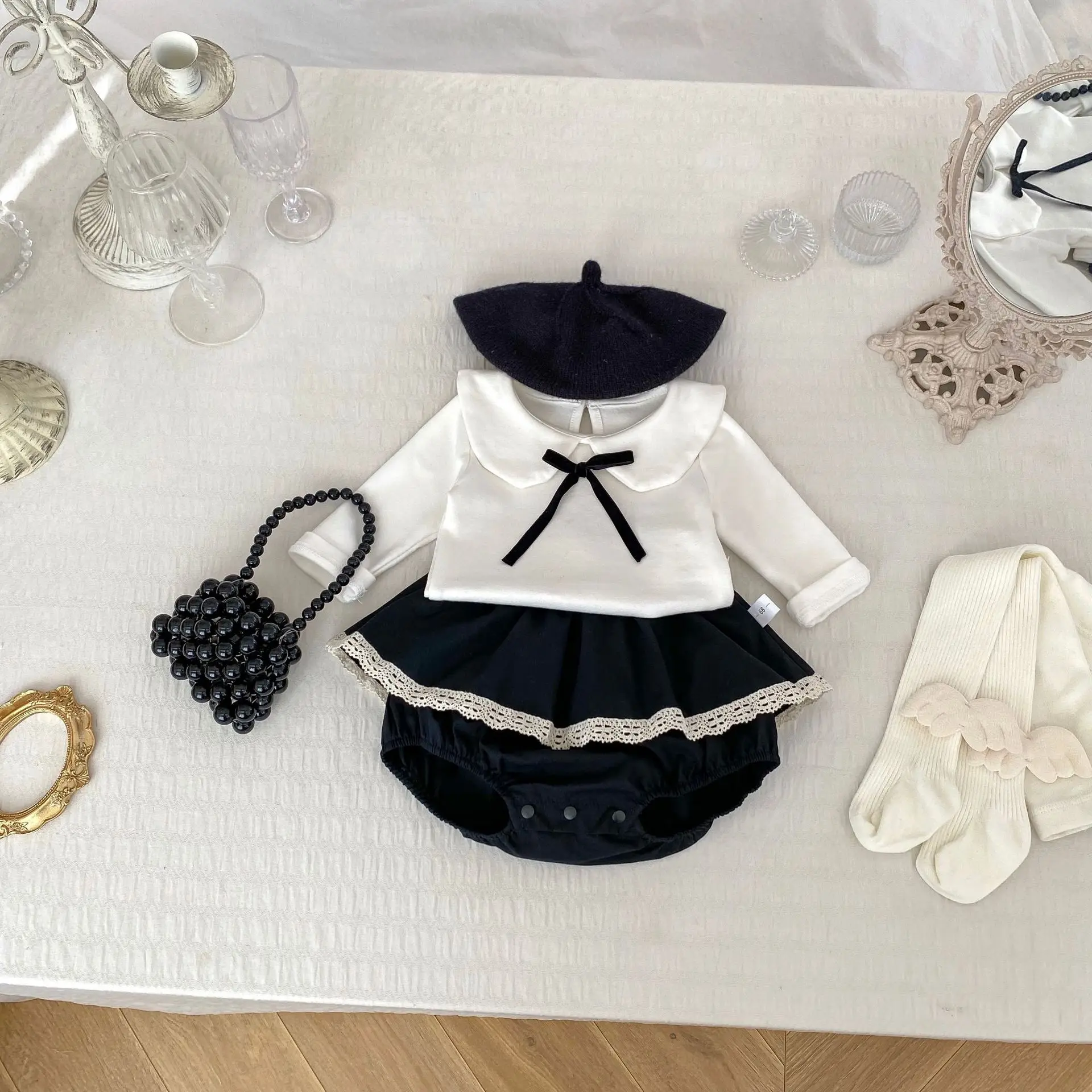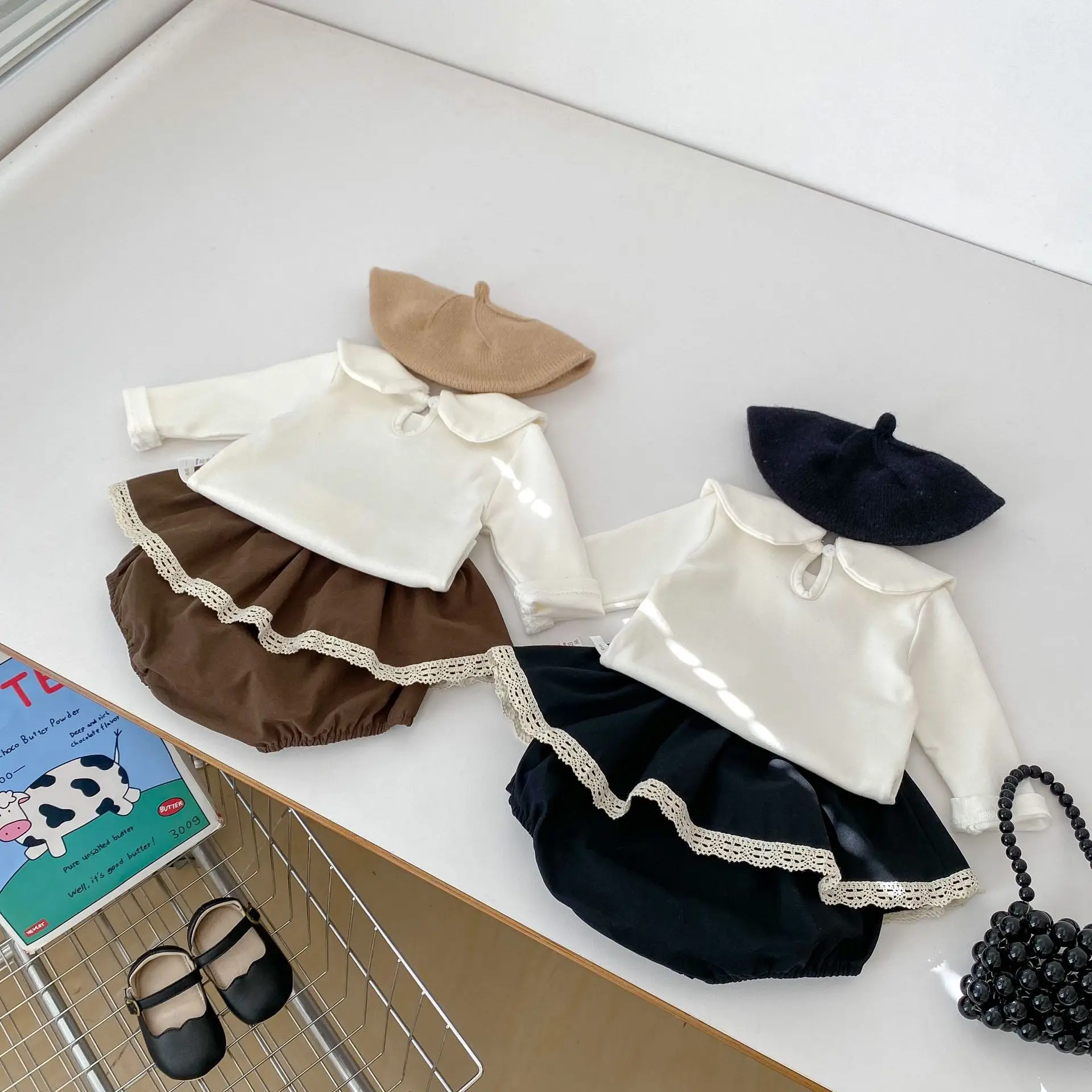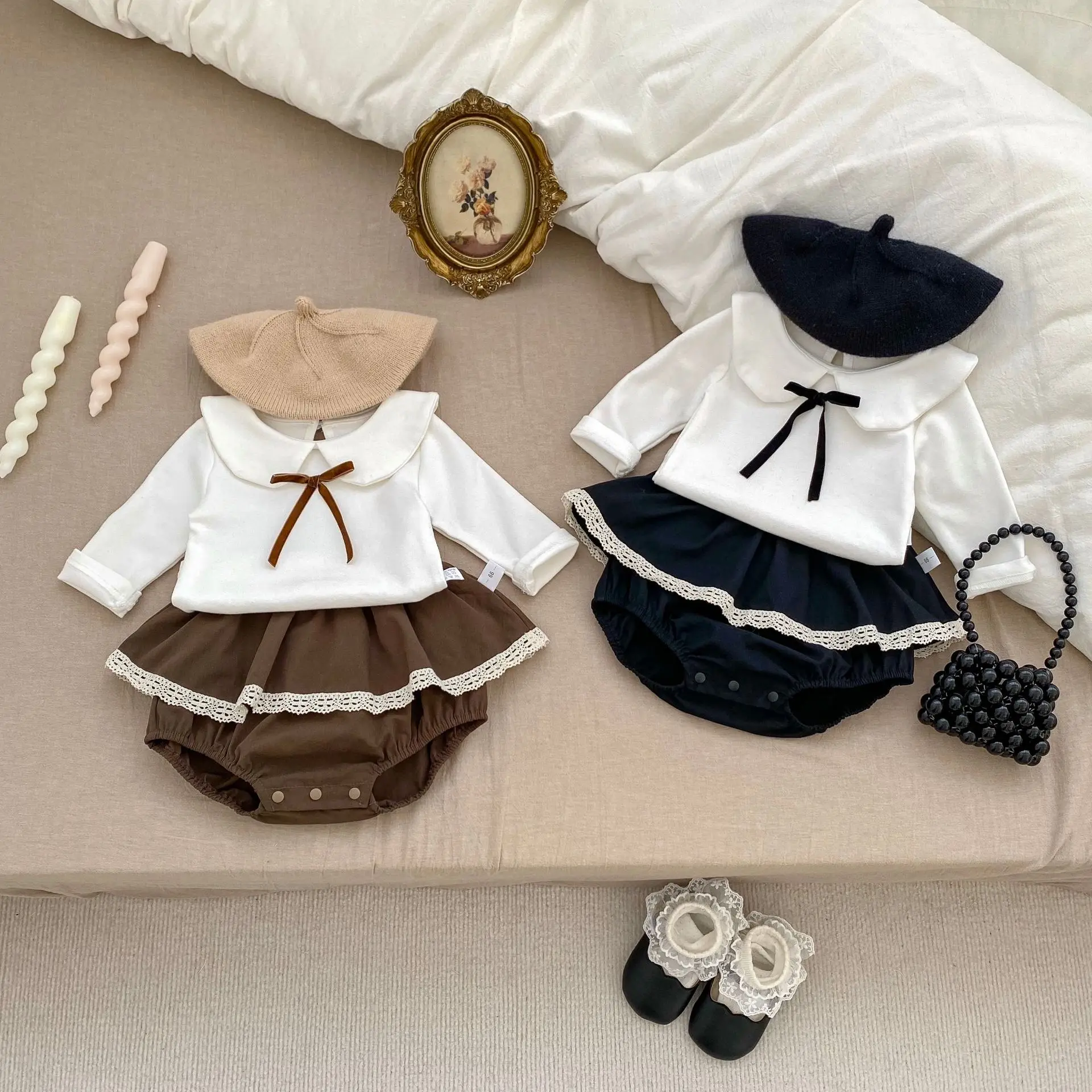 ベビートップス/ブルマ リボン丸襟長袖Tシャツブラウス/フリルレースブルマパンツ 2カラー【mh0007186】