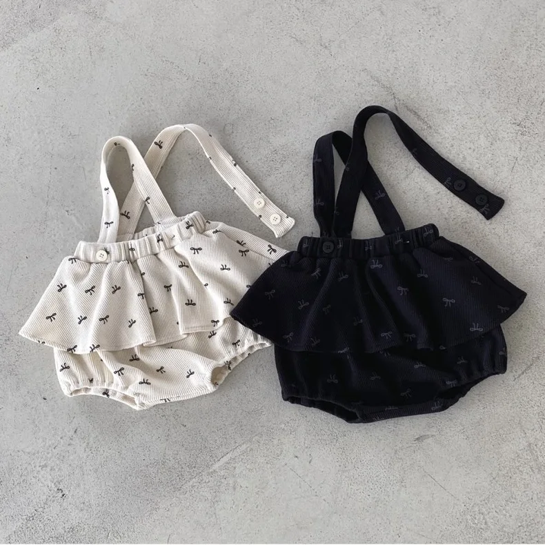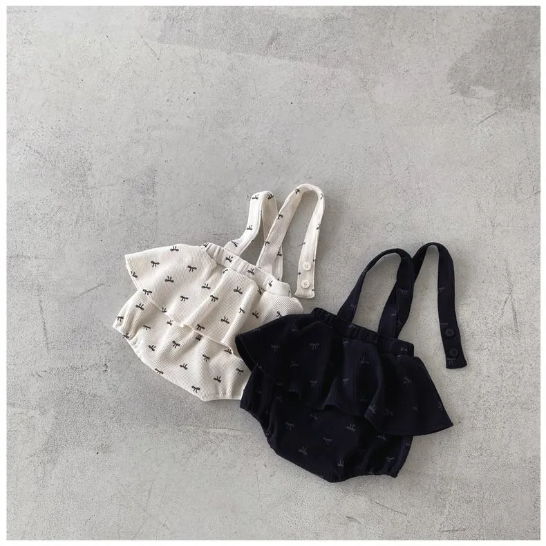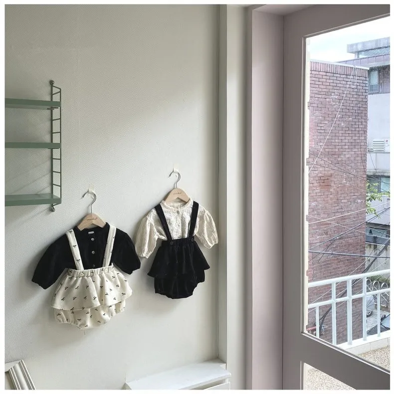 ベビートップス/パンツ レース刺繍ノーカラー長袖ブラウス/リボンプリントフリルスカートサスペンダーブルマ 2カラー【mh0007214】