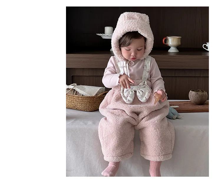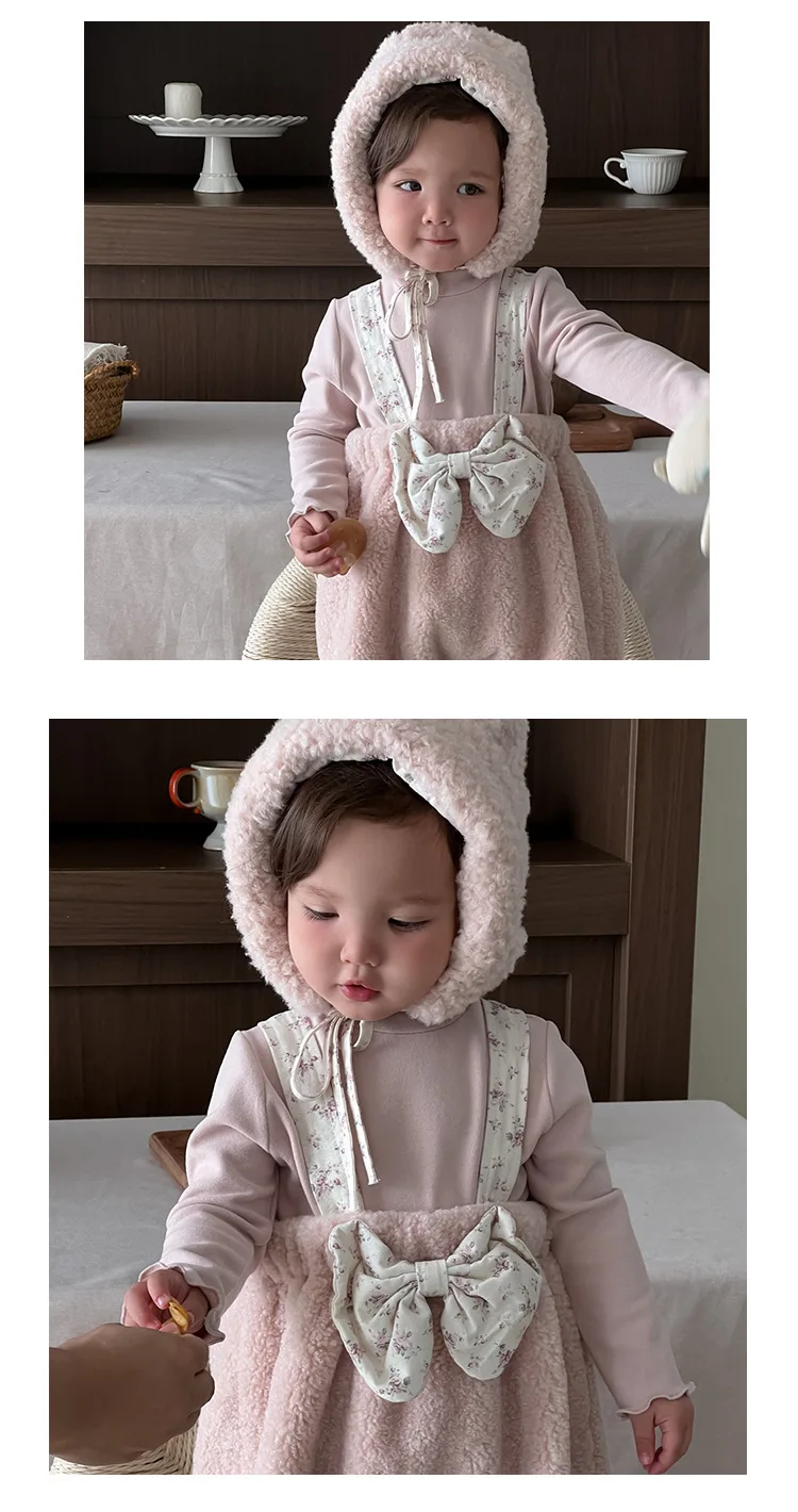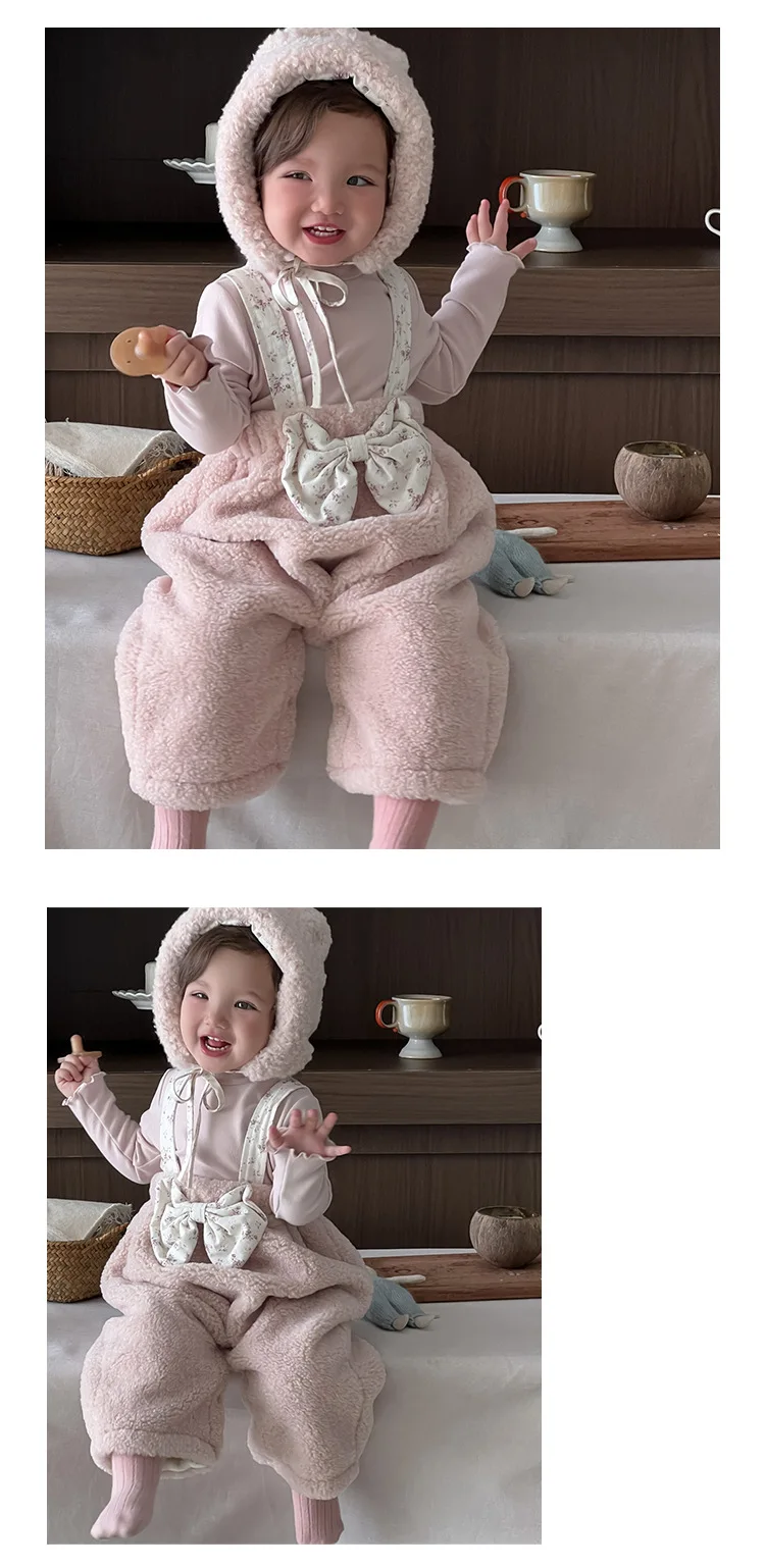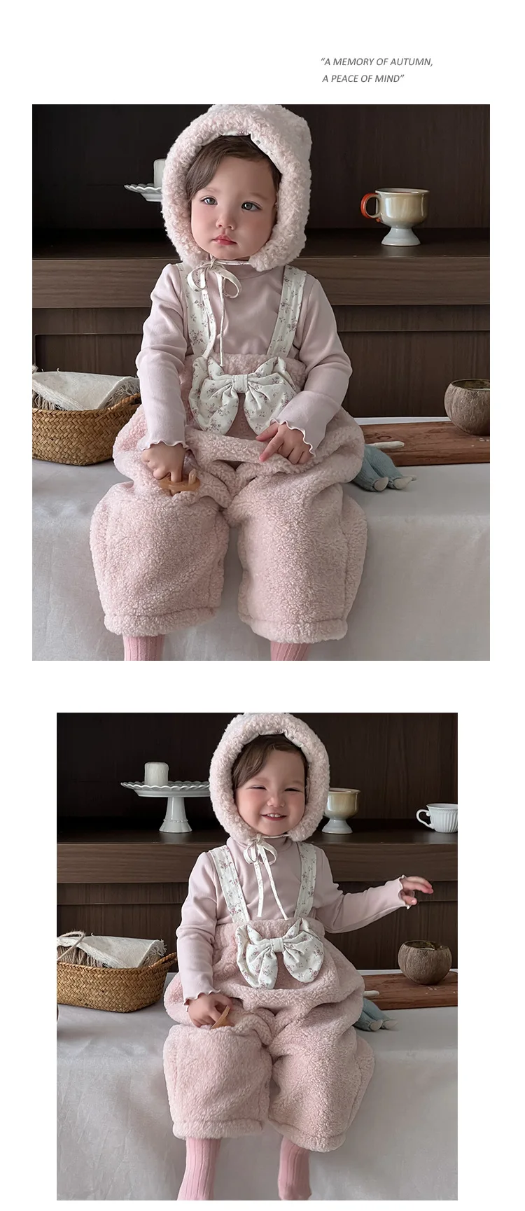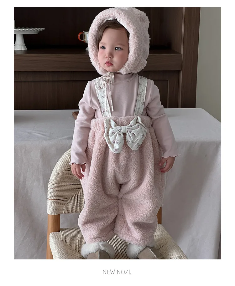 ベビーサロペット ボアフリースビッグリボンサスペンダーパンツ+ボンネット帽子セット【mh0007833】