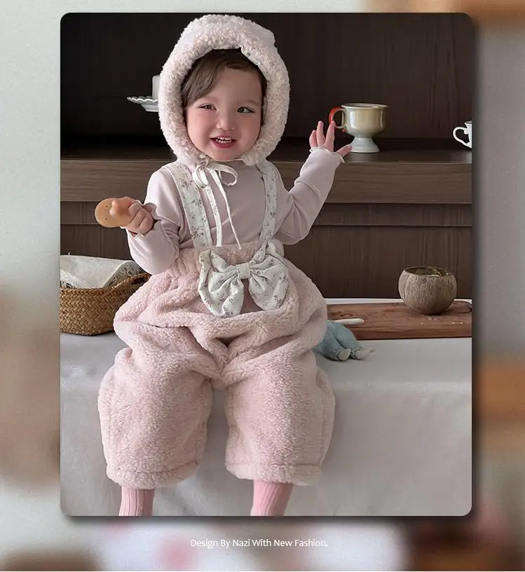 #ベビーサロペット #ボアフリース #リボンサスペンダー #ボンネット帽子 #冬の子供服 #暖かいロンパース #おしゃれベビー