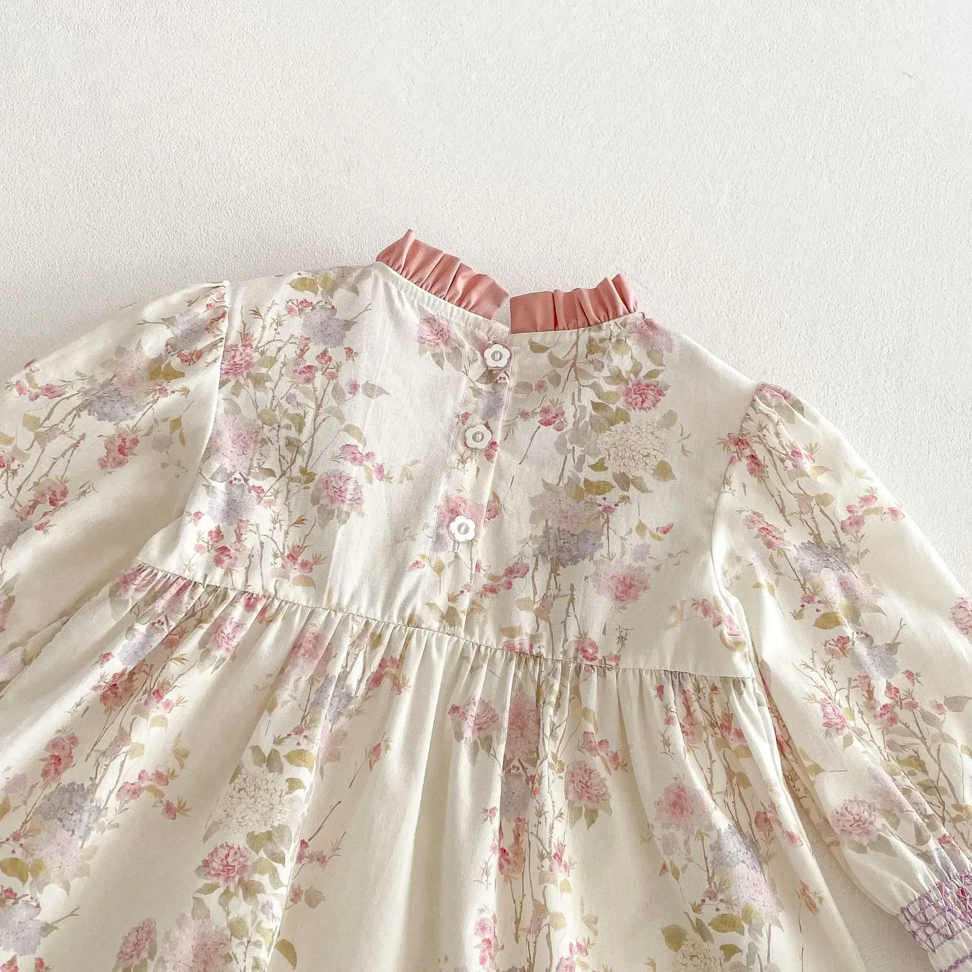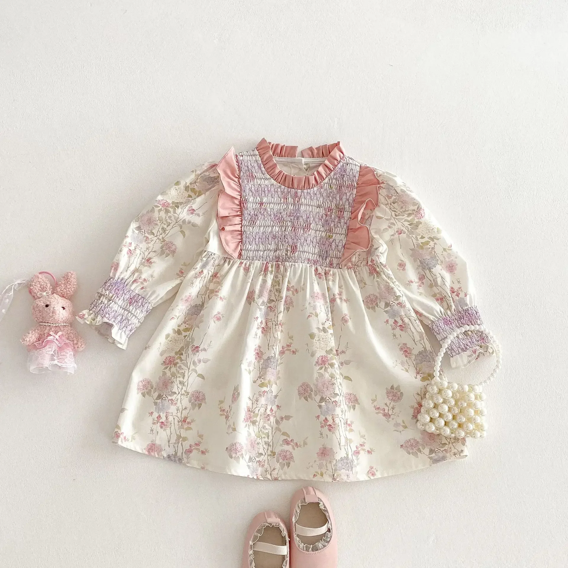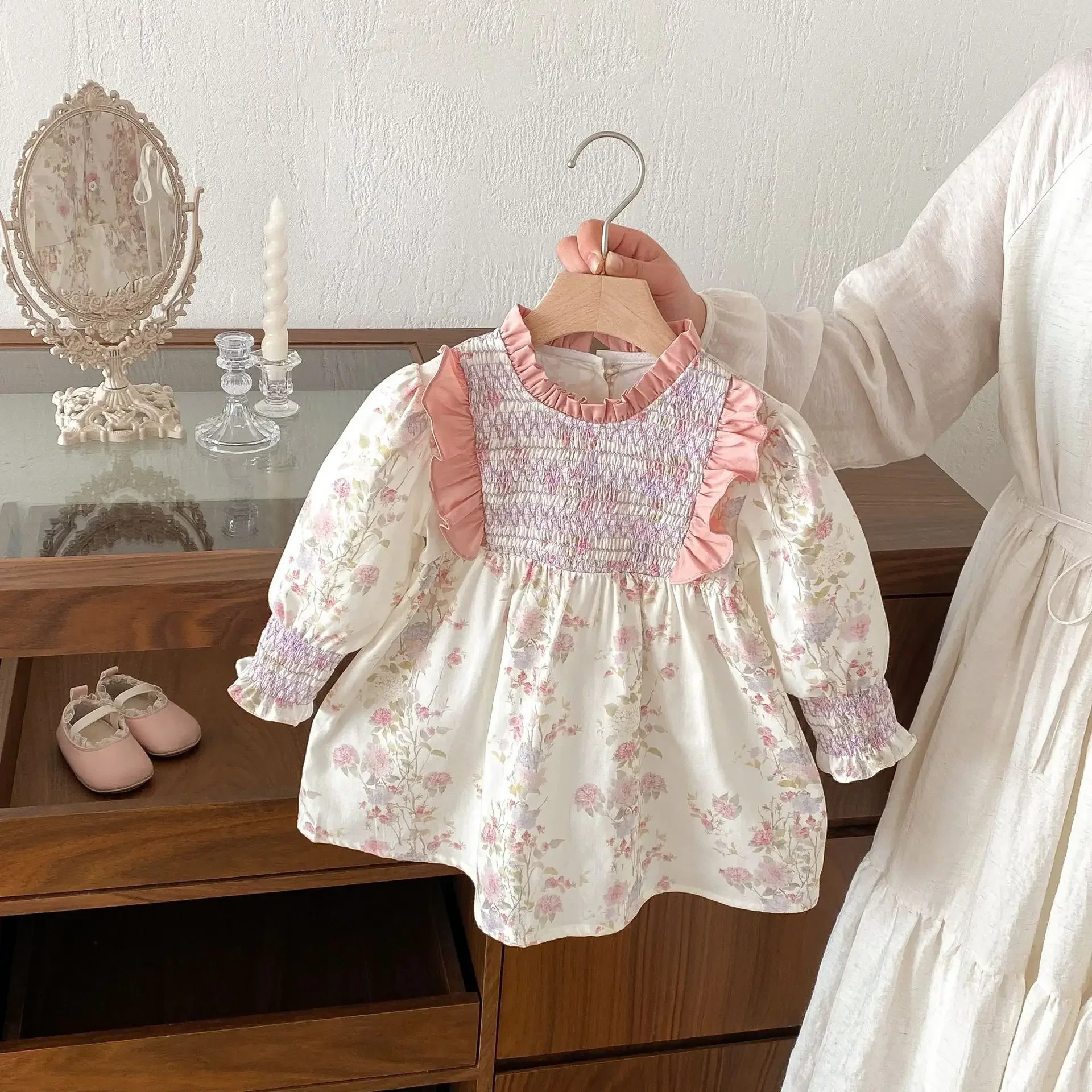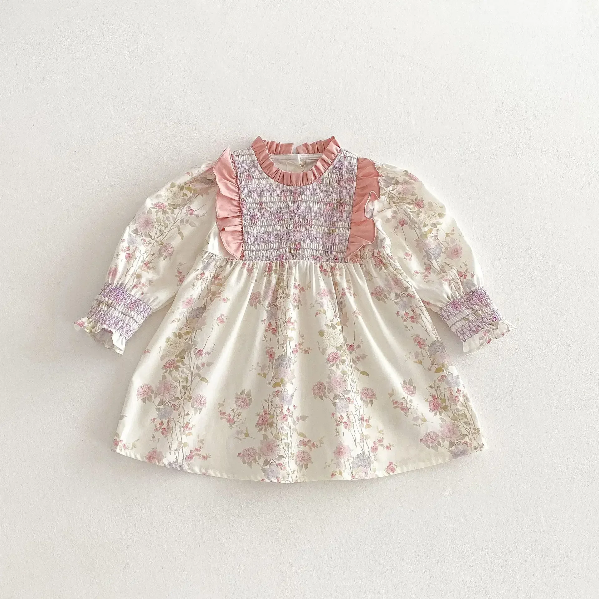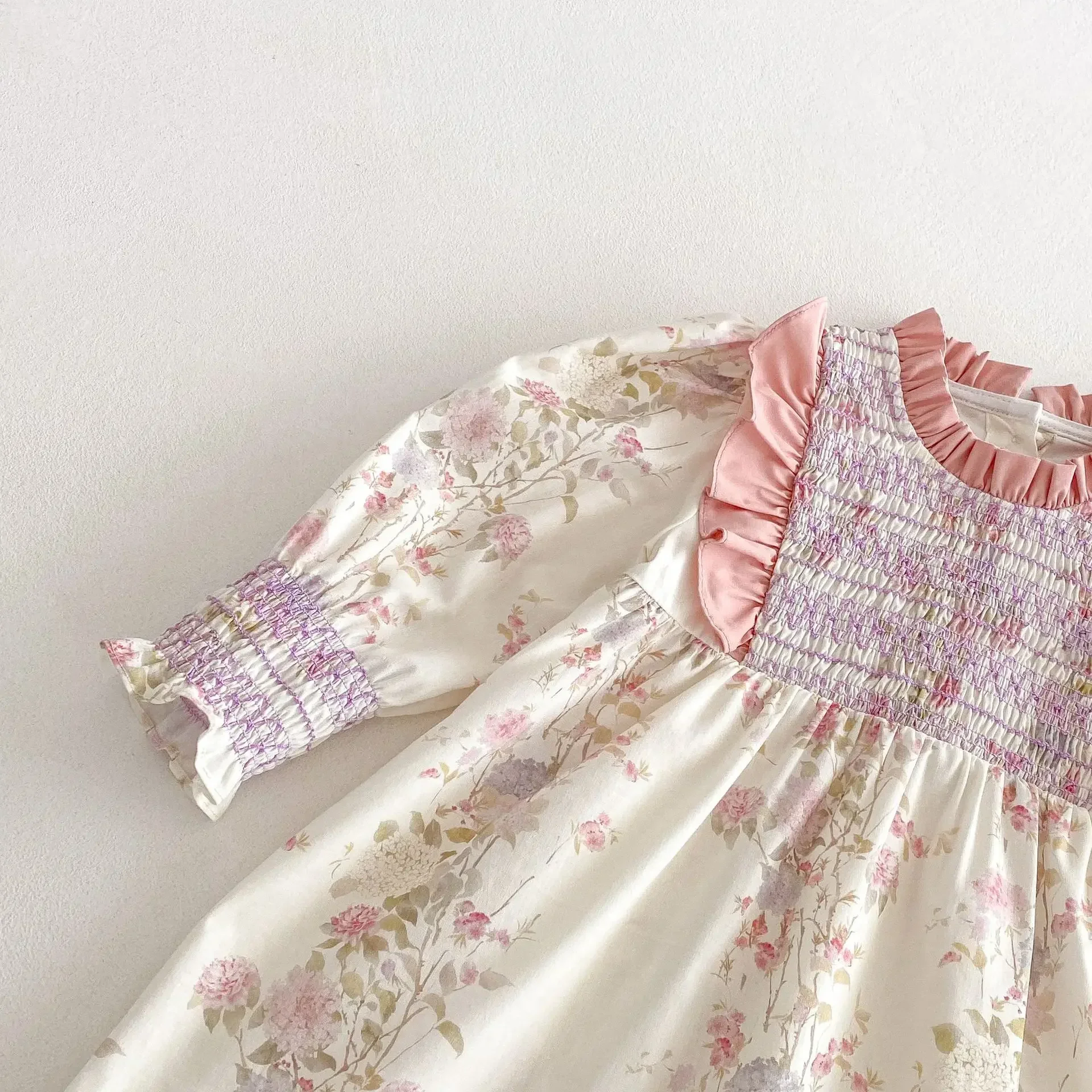 キッズワンピース フラワープリントフリルシャーリング長袖ドレスワンピース【mh0008959】