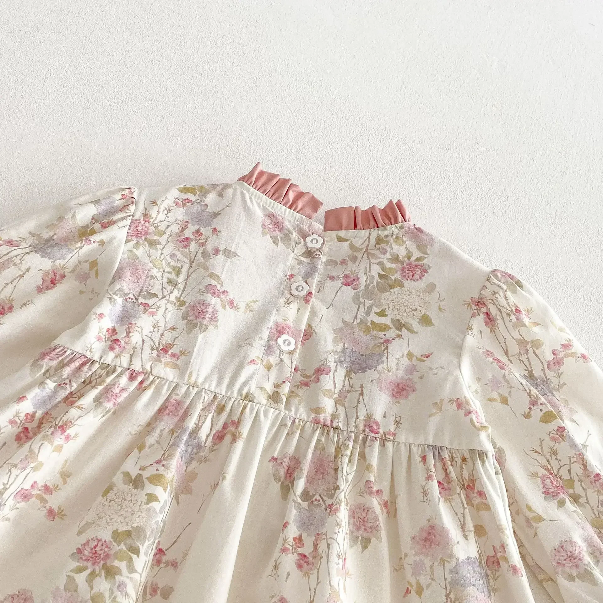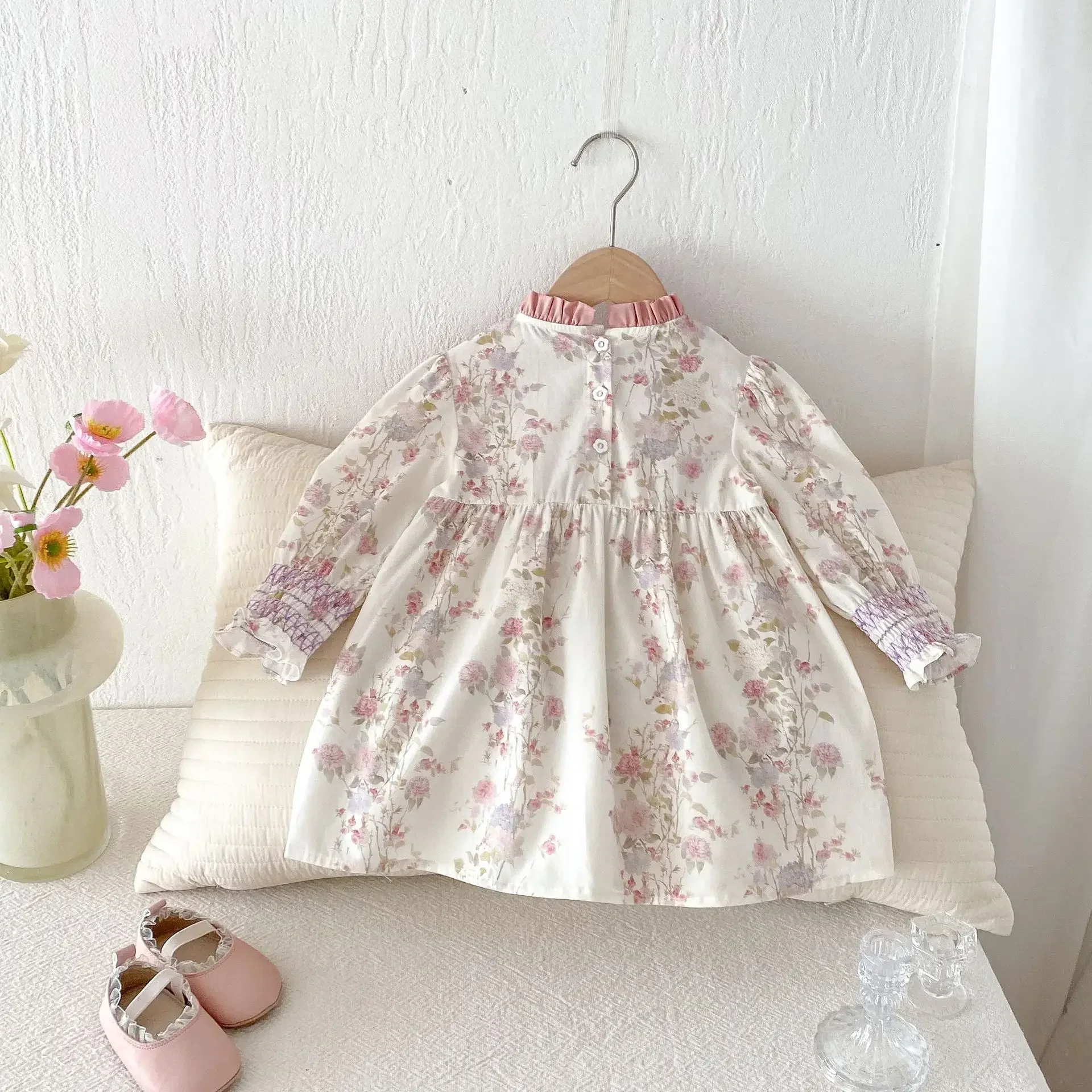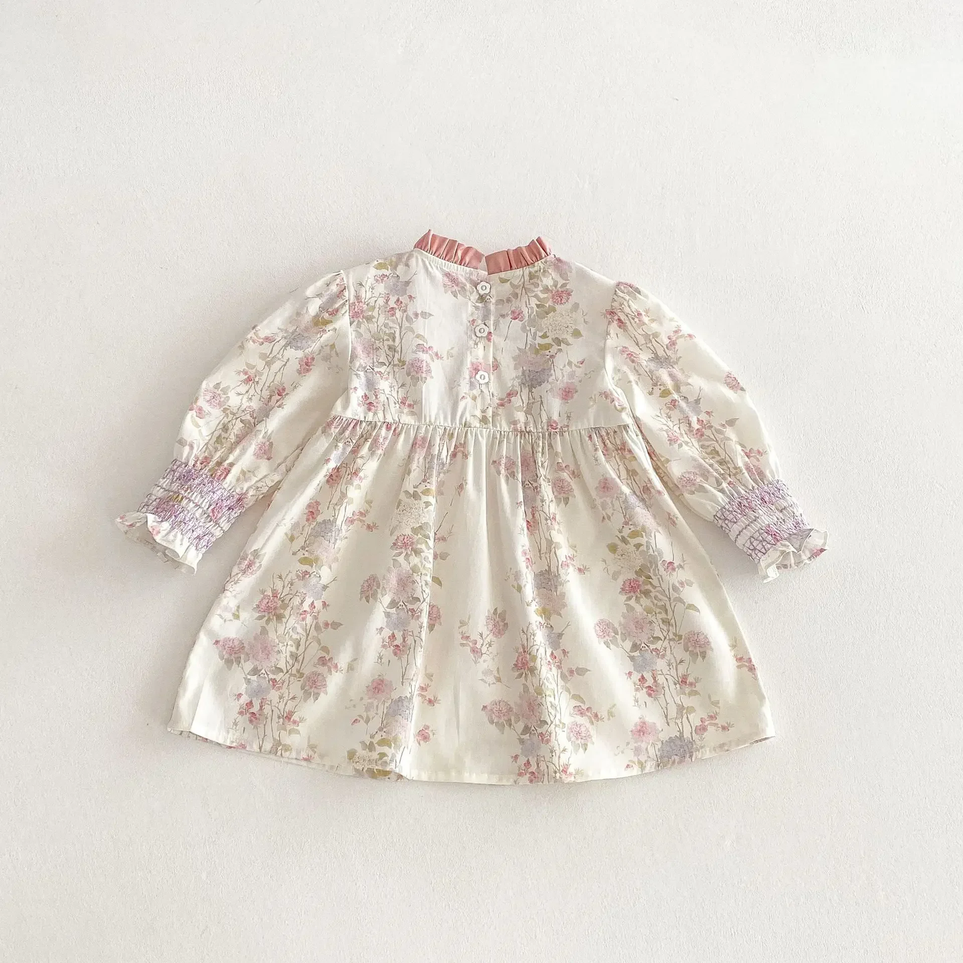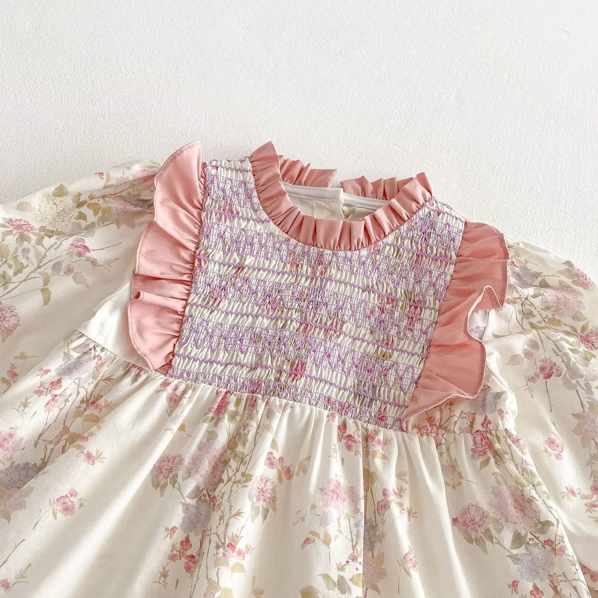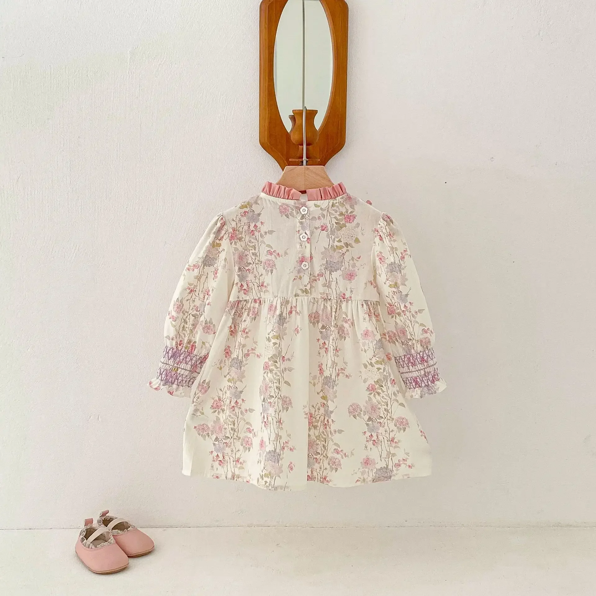キッズワンピース フラワープリントフリルシャーリング長袖ドレスワンピース【mh0008959】