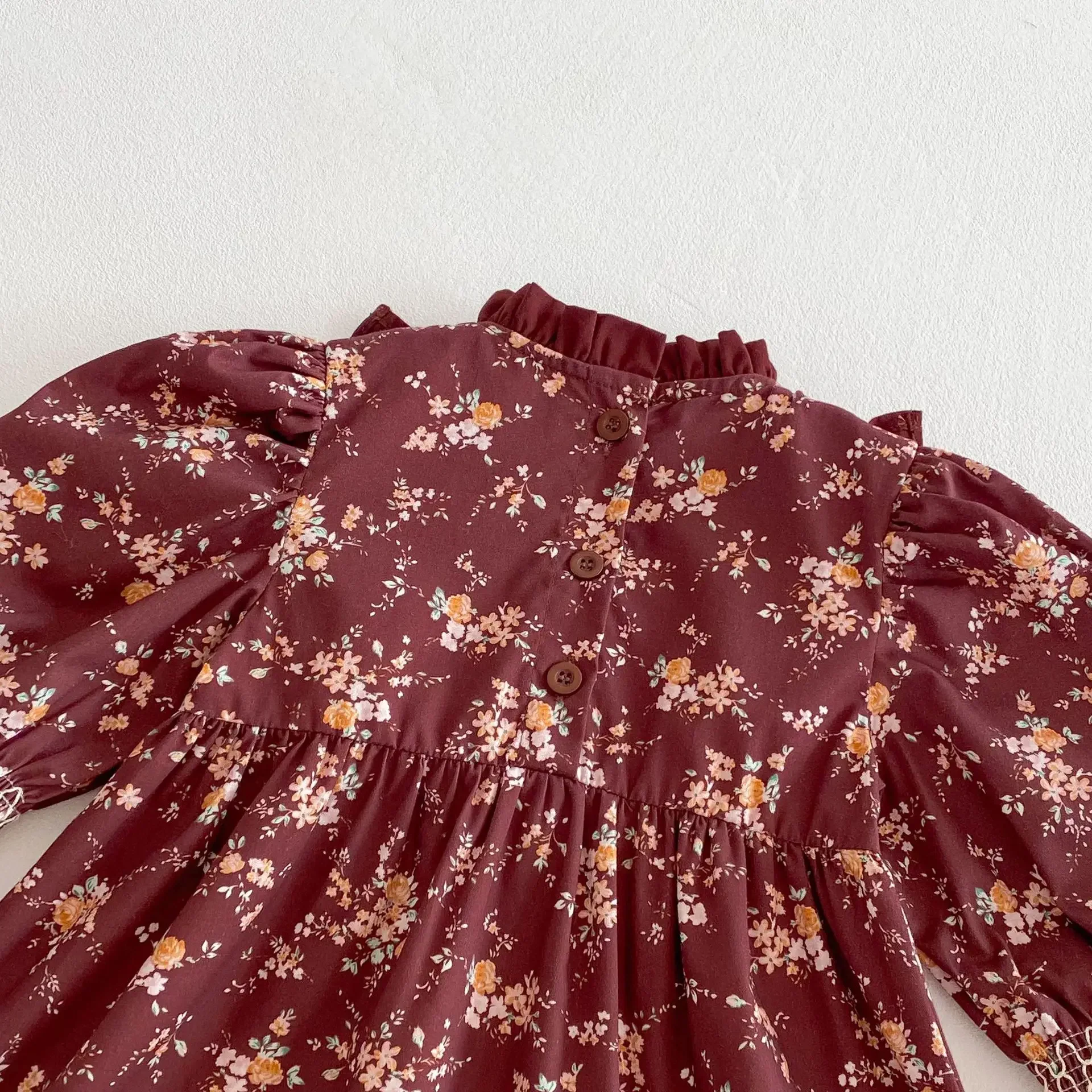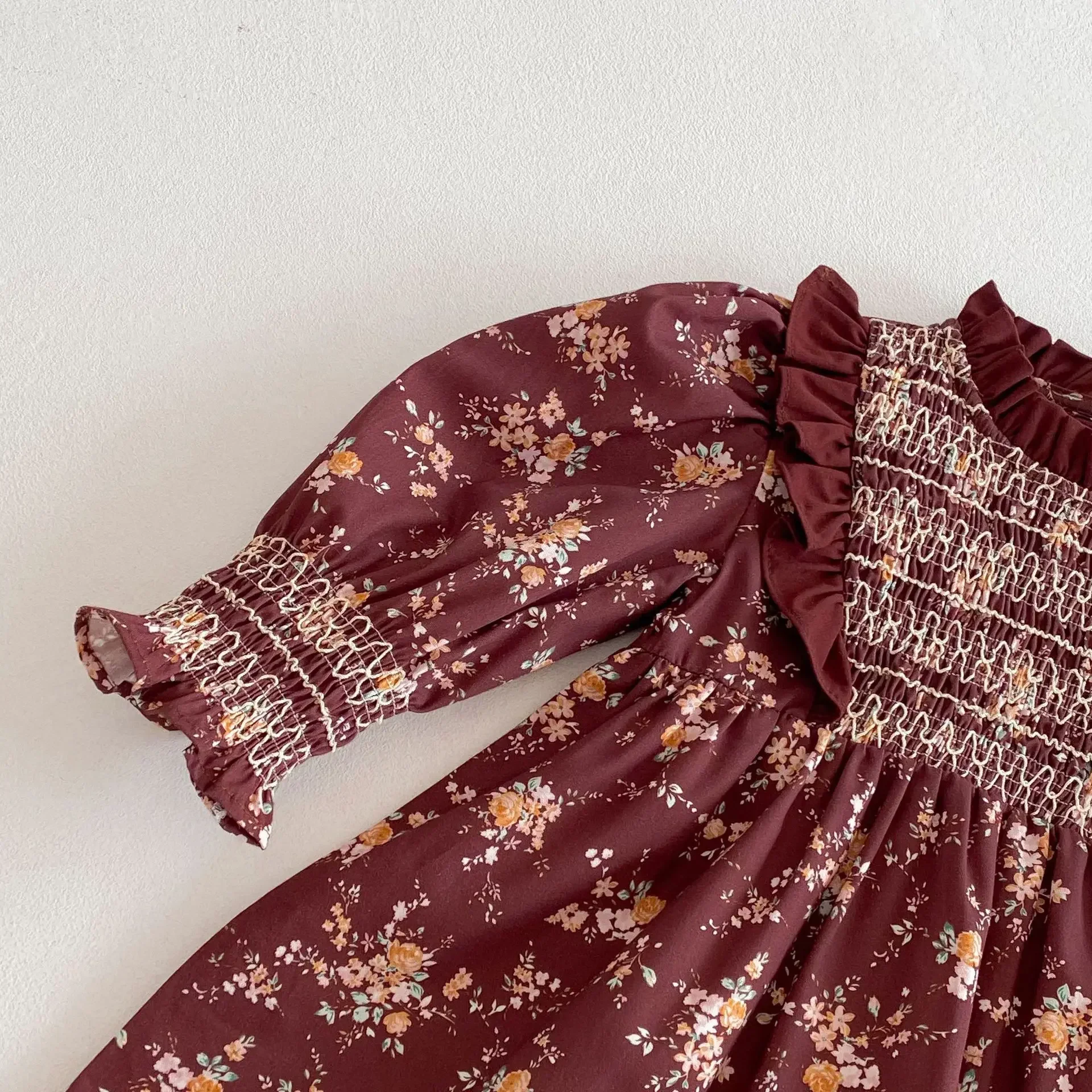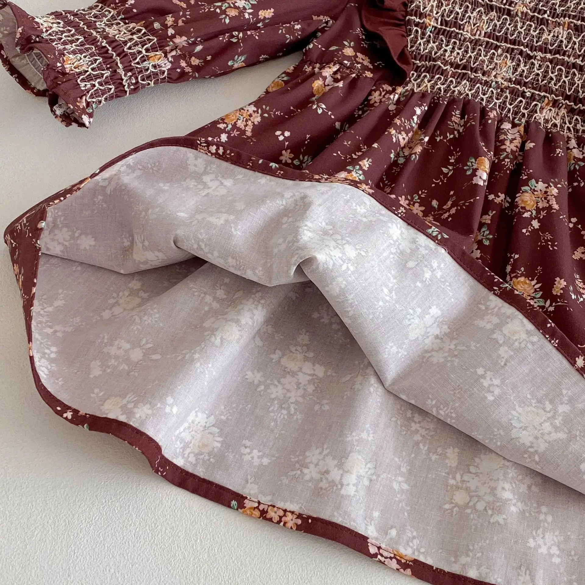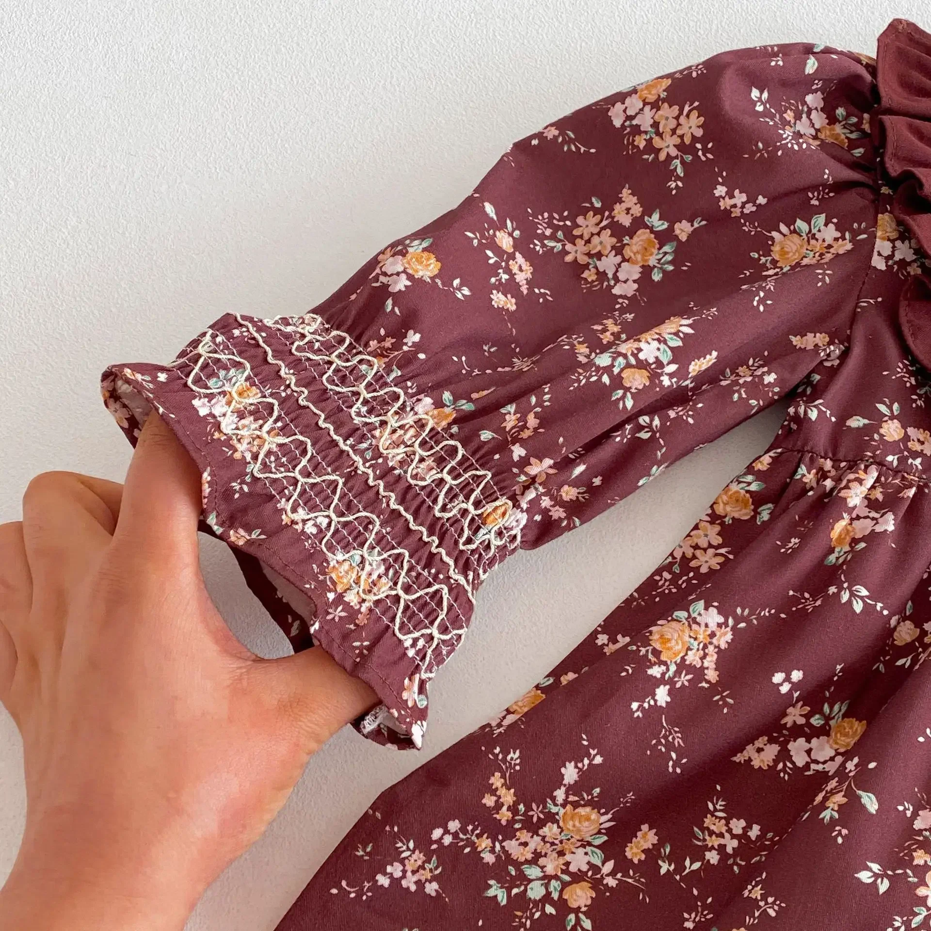 キッズワンピース フラワープリントフリルシャーリング長袖ボヘミアンワンピース【mh0008960】