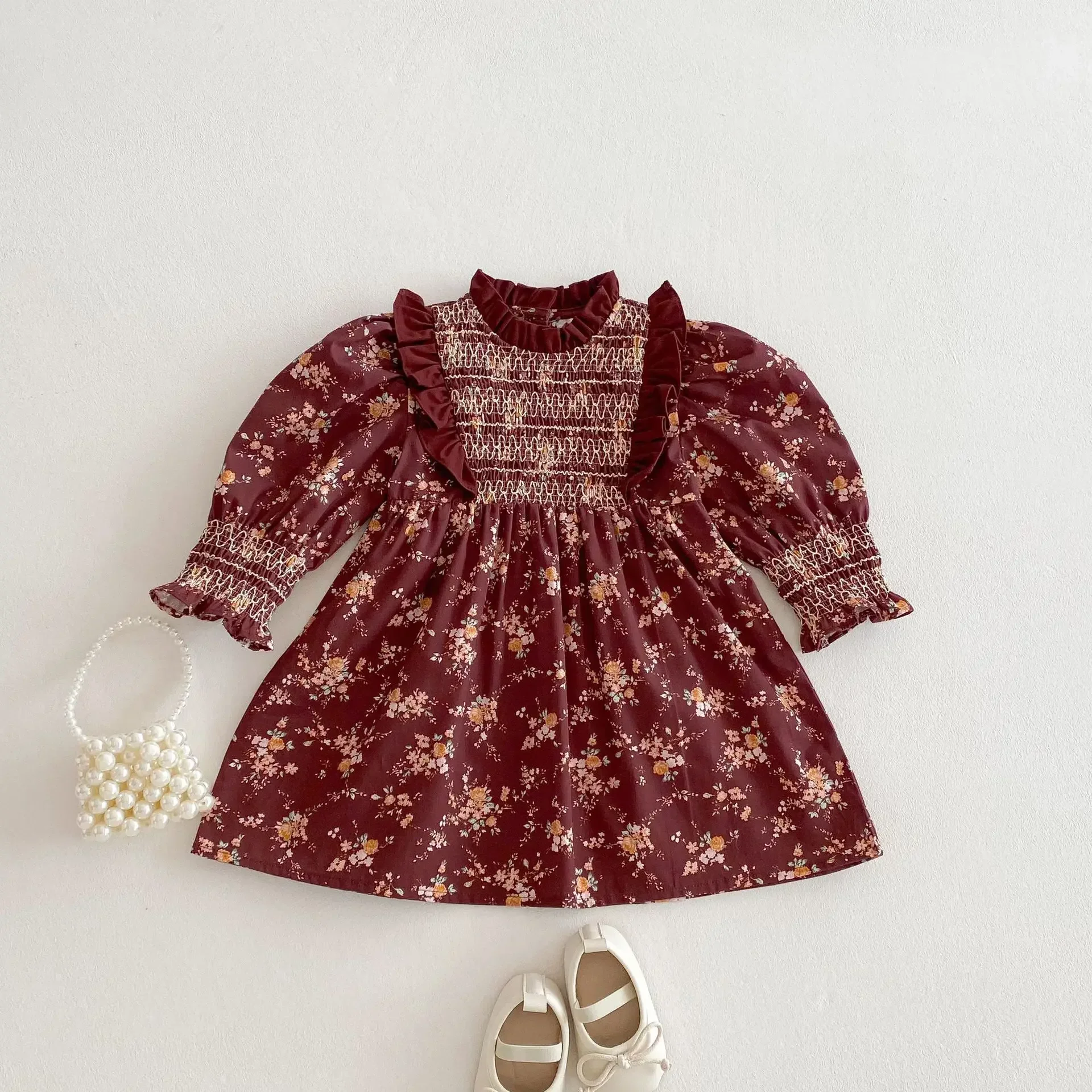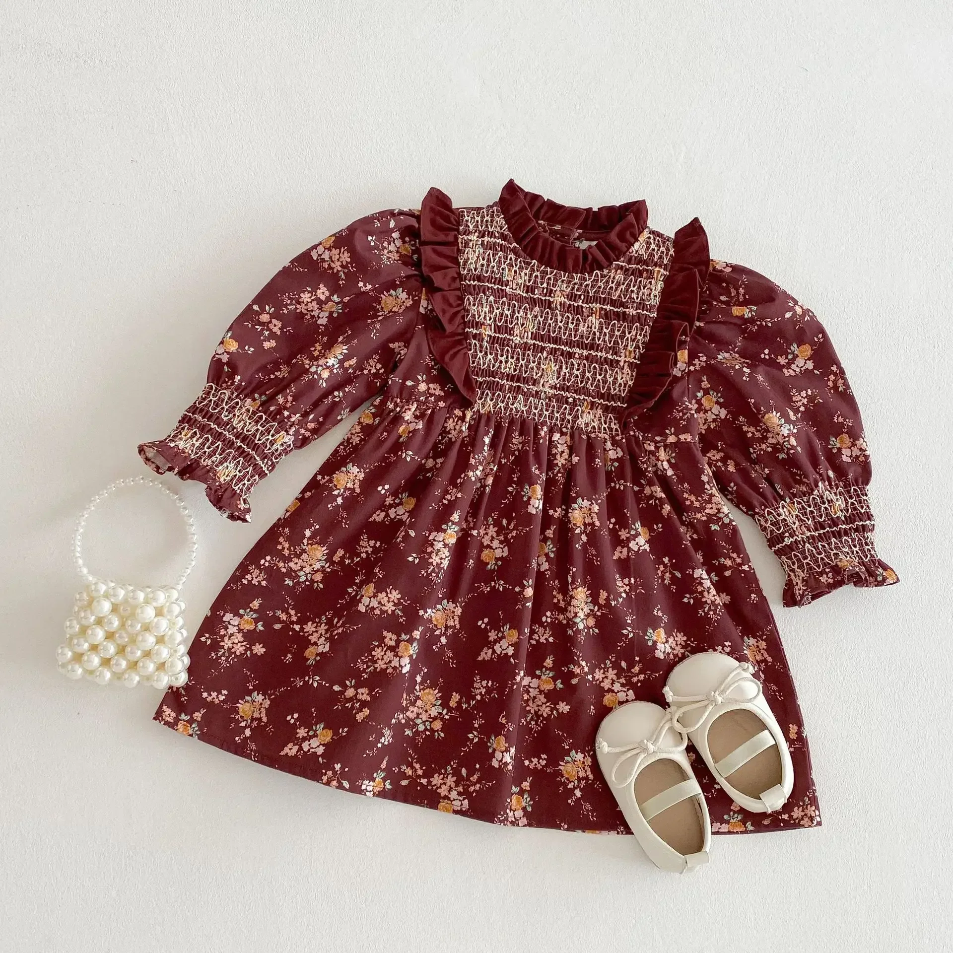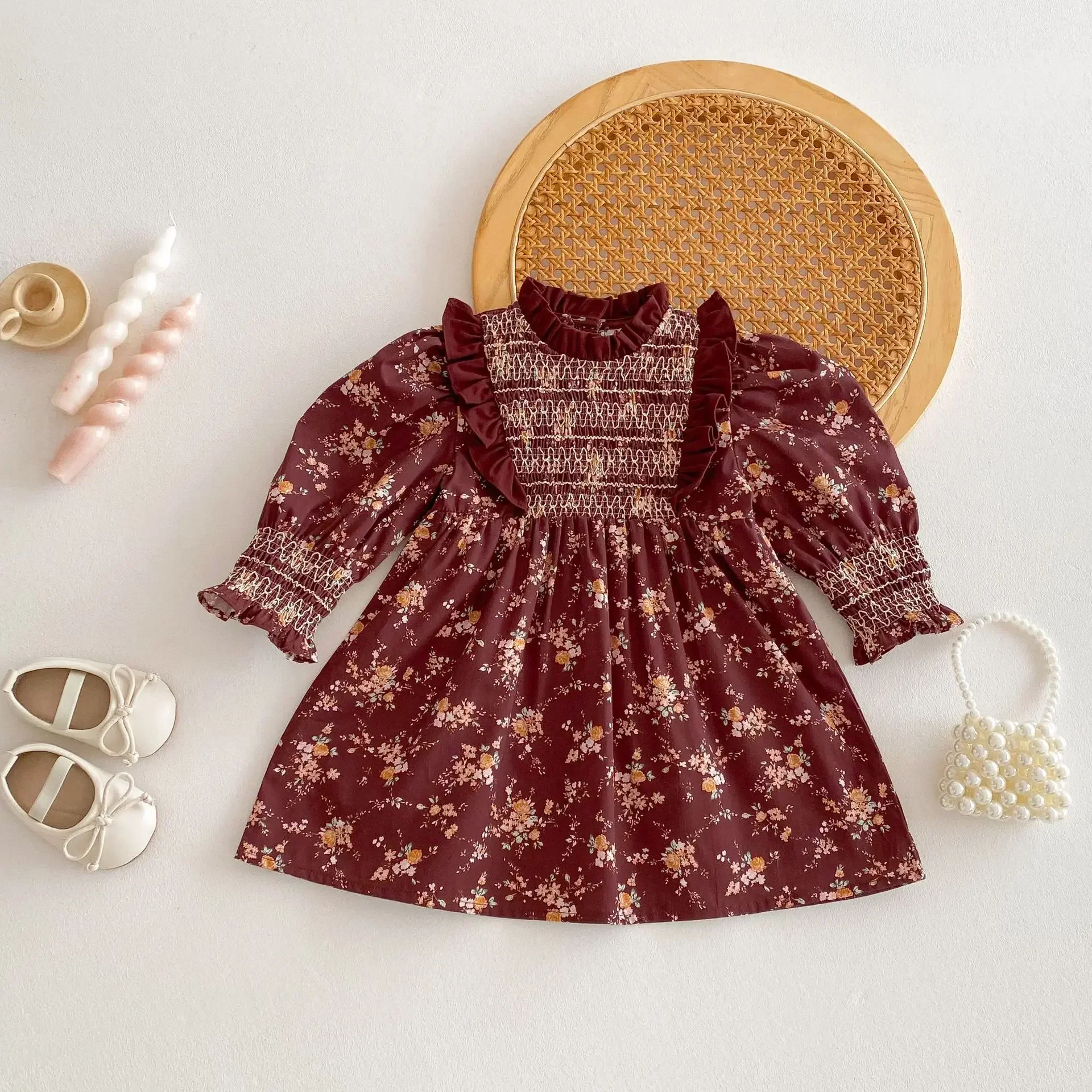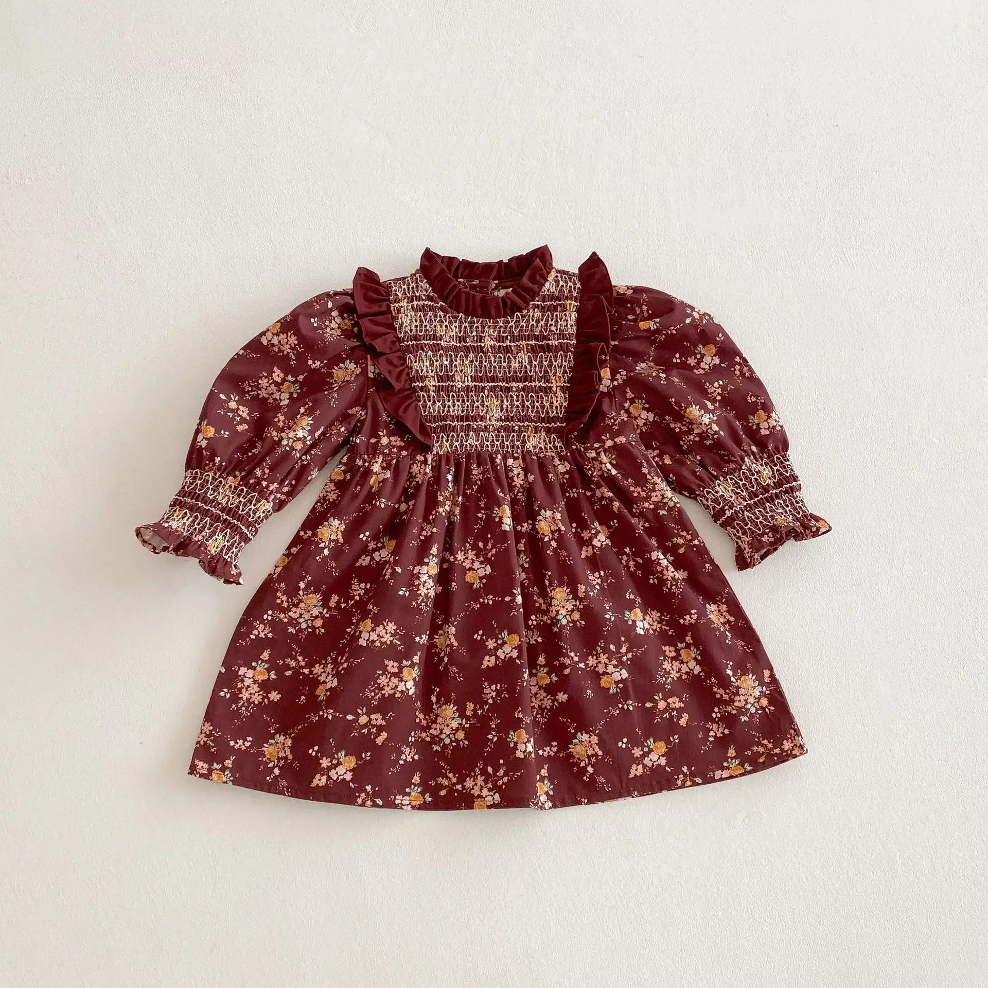 キッズワンピース フラワープリントフリルシャーリング長袖ボヘミアンワンピース【mh0008960】