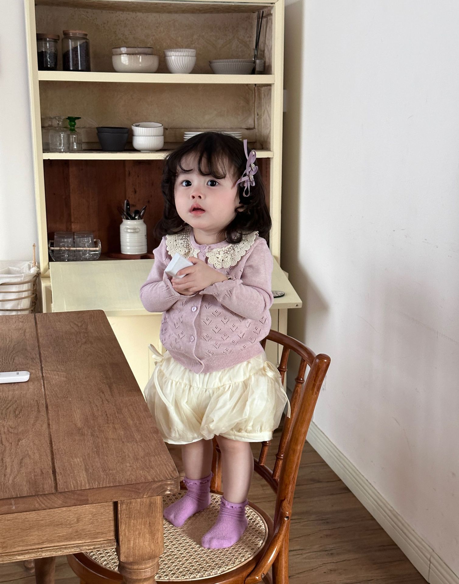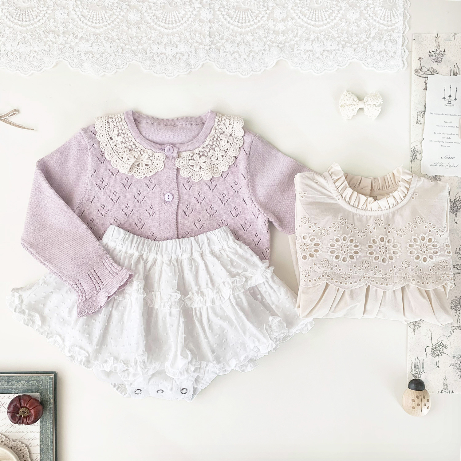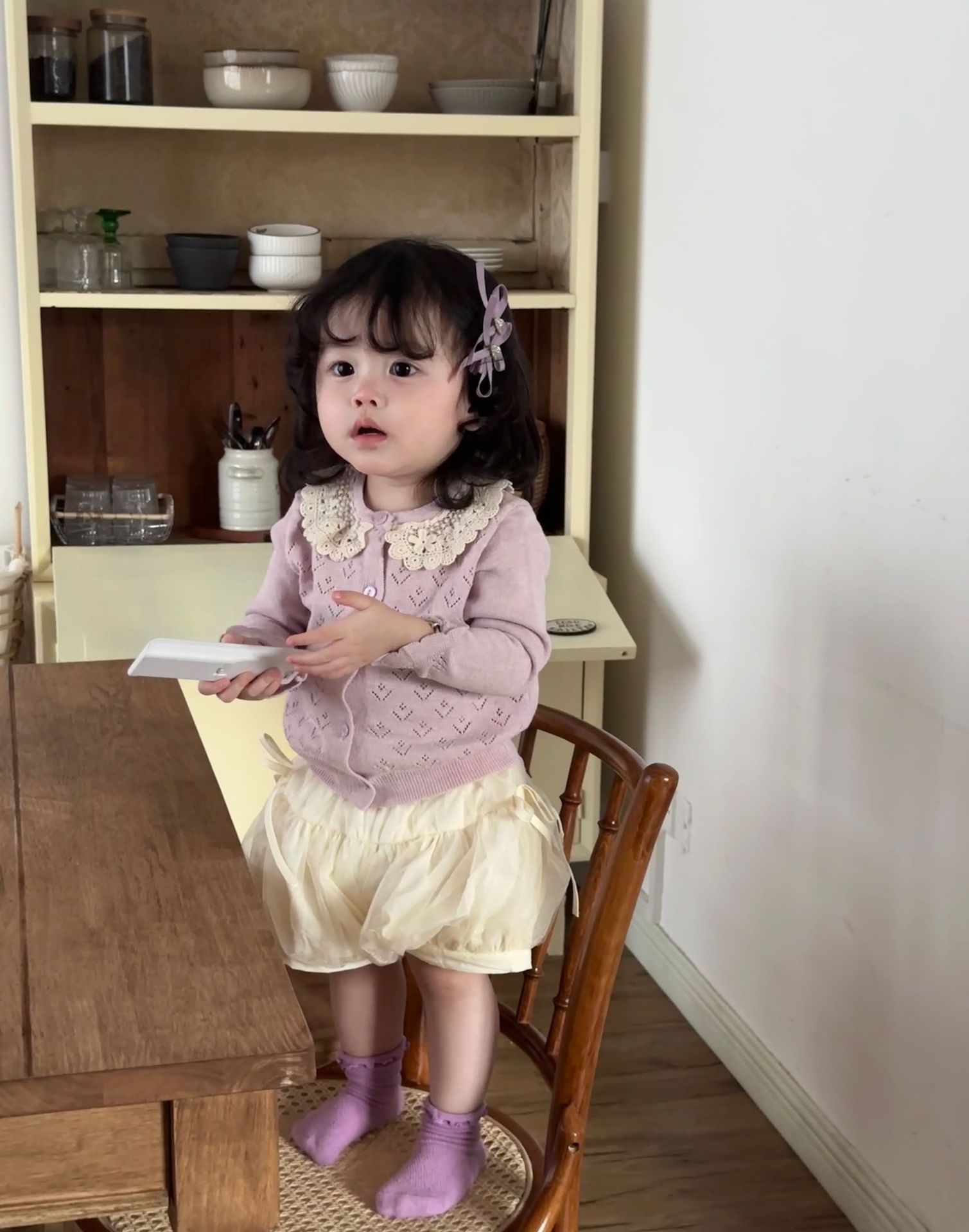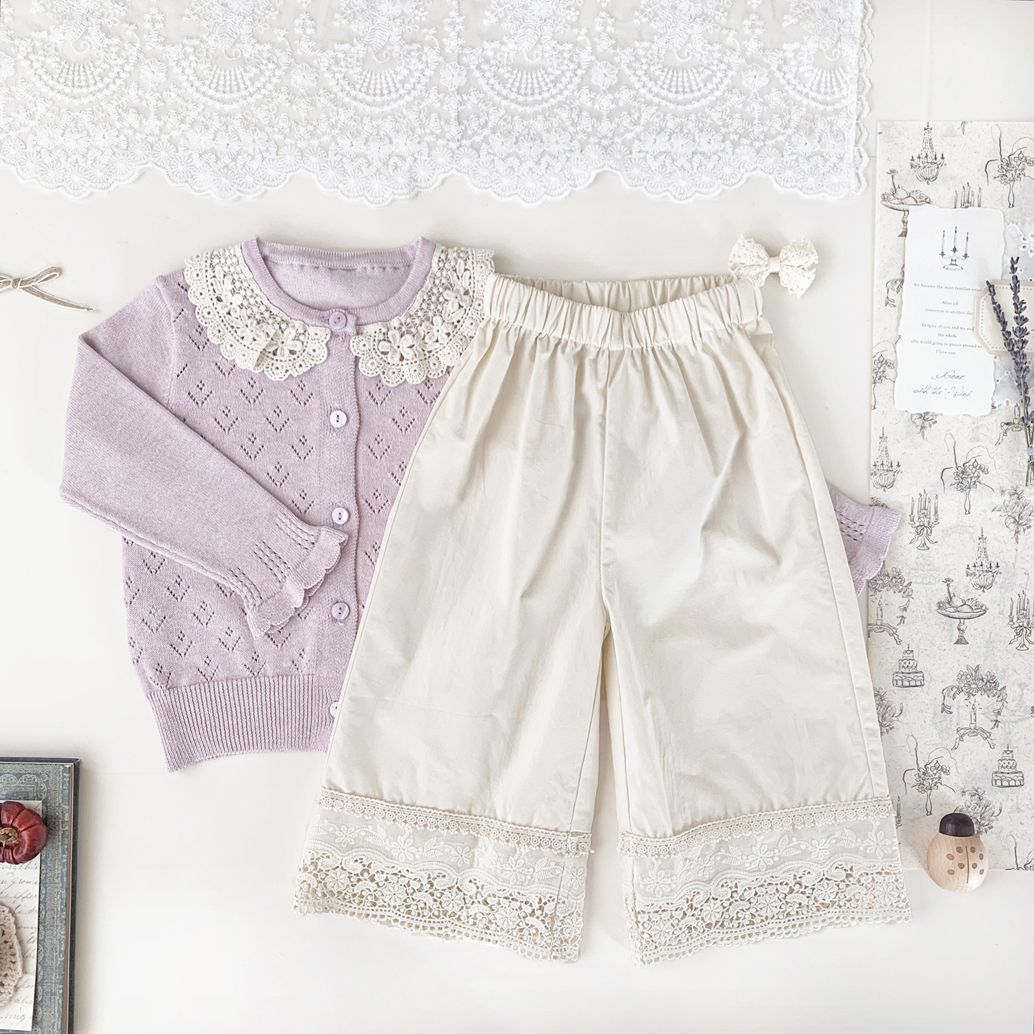 ベビーキッズカーディガン/パンツ レースニット長袖カーディガンジャケット/リボンショートバルーンパンツ【mh0009123】