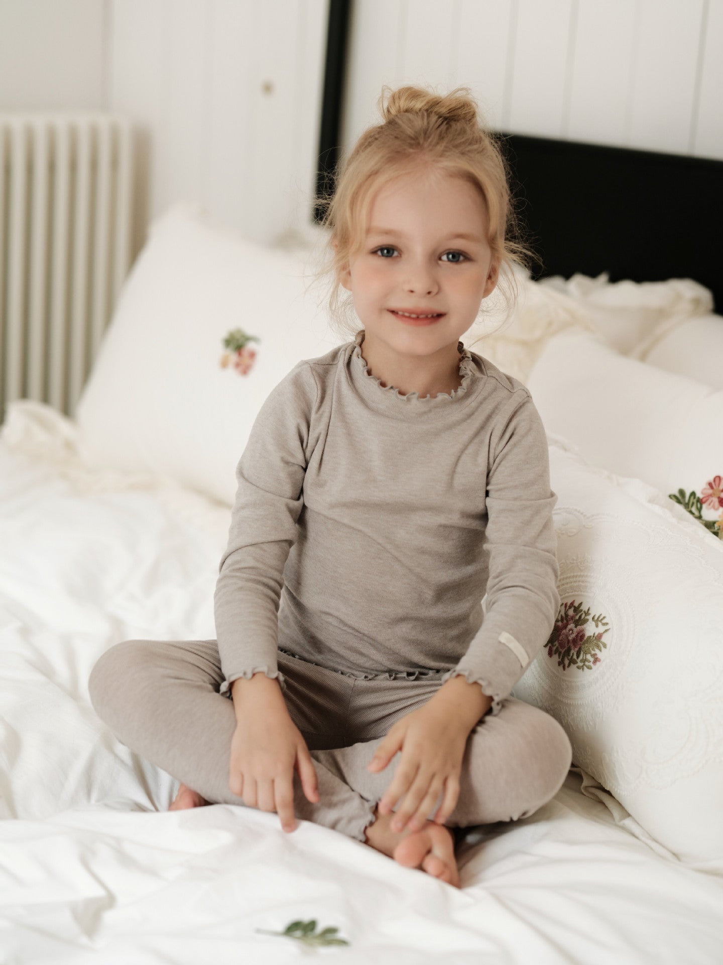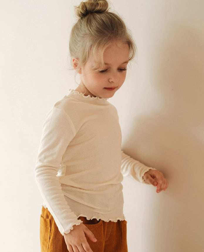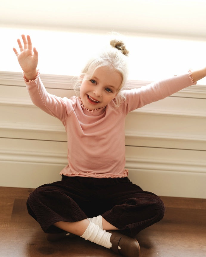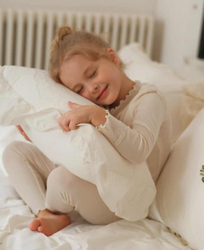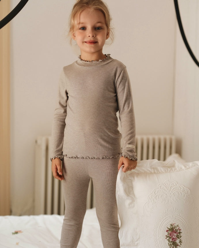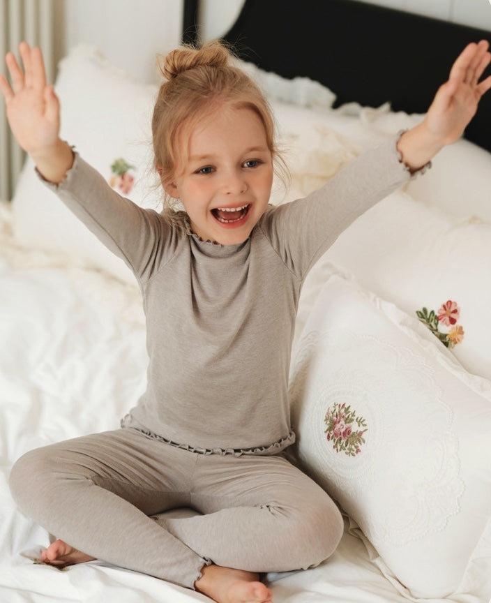 メリノウールが叶える極上の肌触りと、優雅なラッフルカラーが目を引く長袖のセットアップパジャマです。リラックスタイムを格上げする上質な素材は、ベビーの繊細な肌を優しく包み込み、快適な着心地が持続します。トレンドのくすみカラーで揃えたキッズのトップスとパンツは、ルームウェアとしても活躍し、子ども服のワードローブに洗練された雰囲気を添えるでしょう。
