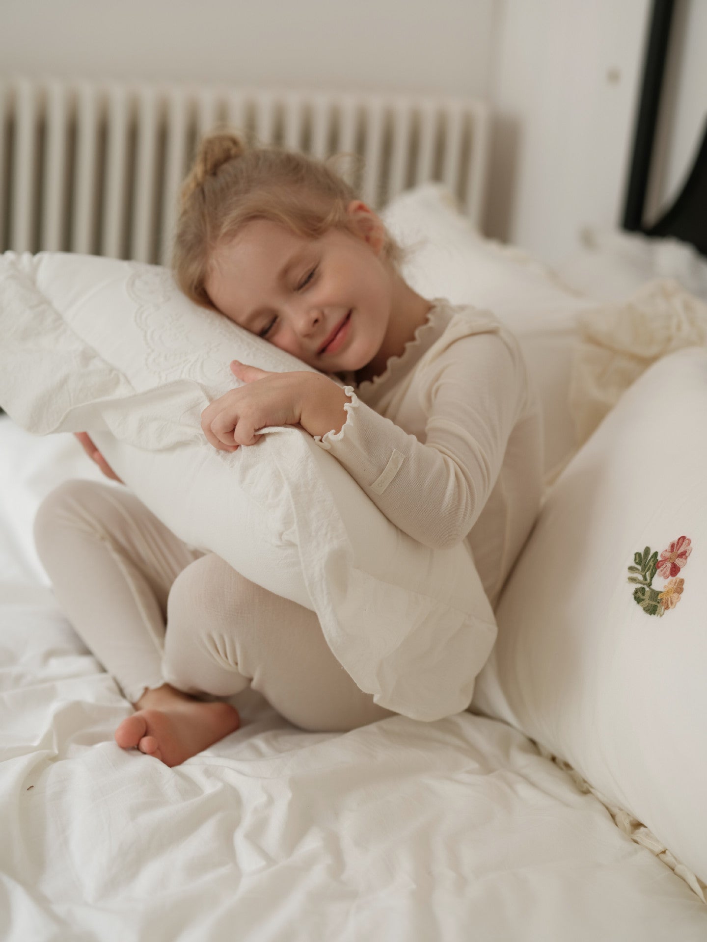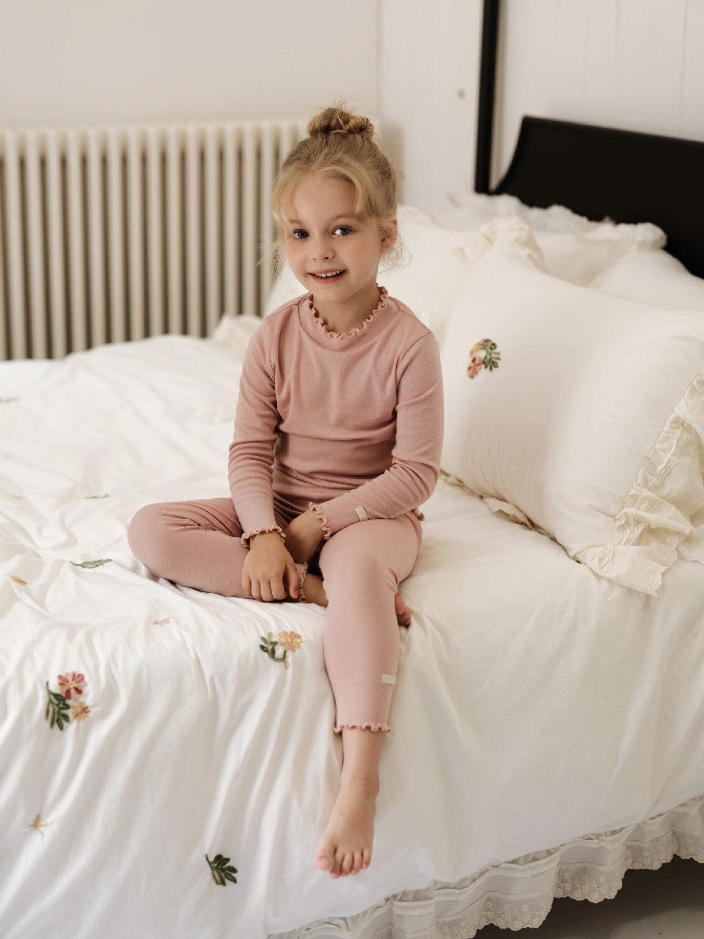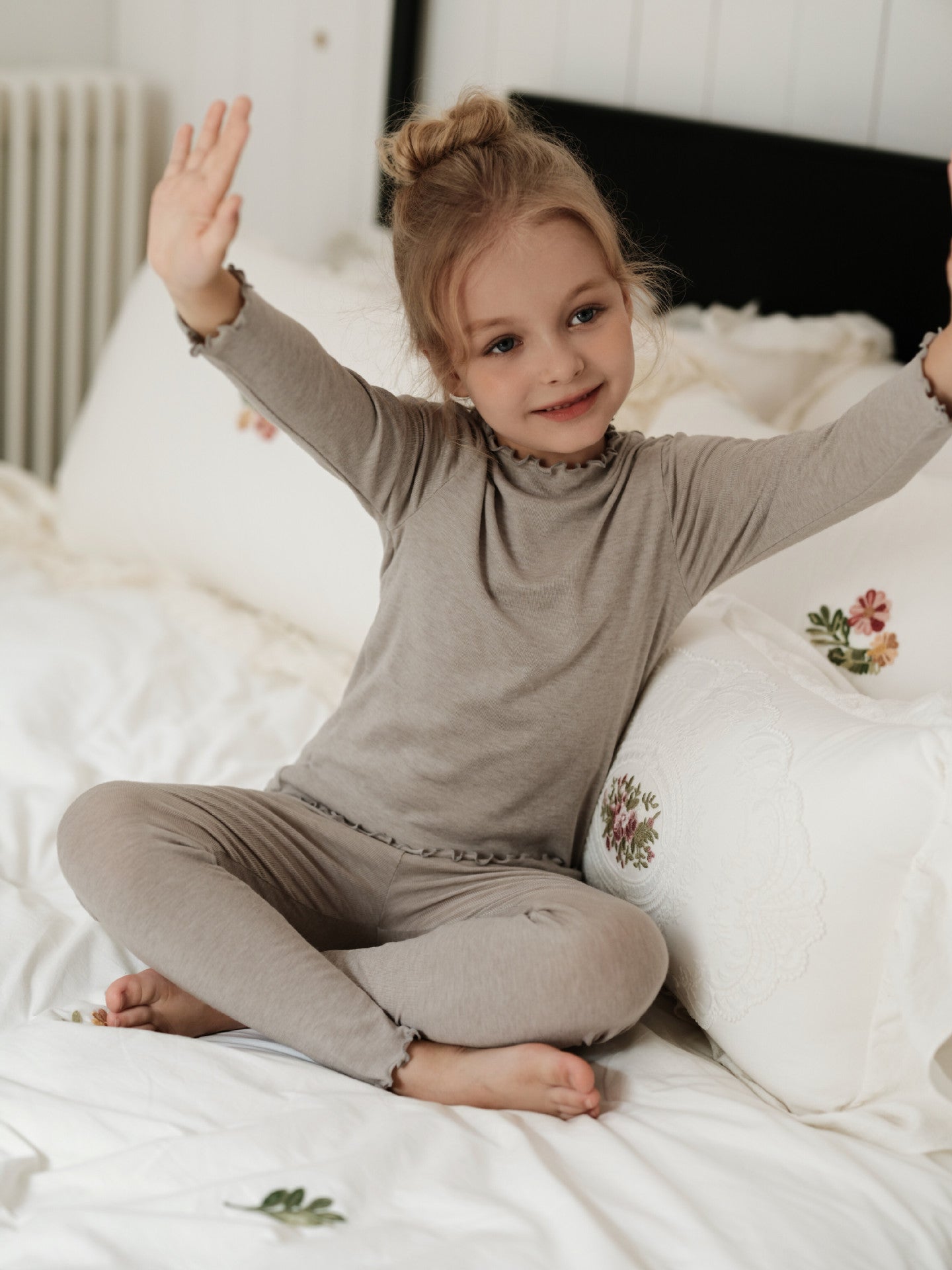 メリノウールが叶える極上の肌触りと、優雅なラッフルカラーが目を引く長袖のセットアップパジャマです。リラックスタイムを格上げする上質な素材は、ベビーの繊細な肌を優しく包み込み、快適な着心地が持続します。トレンドのくすみカラーで揃えたキッズのトップスとパンツは、ルームウェアとしても活躍し、子ども服のワードローブに洗練された雰囲気を添えるでしょう。