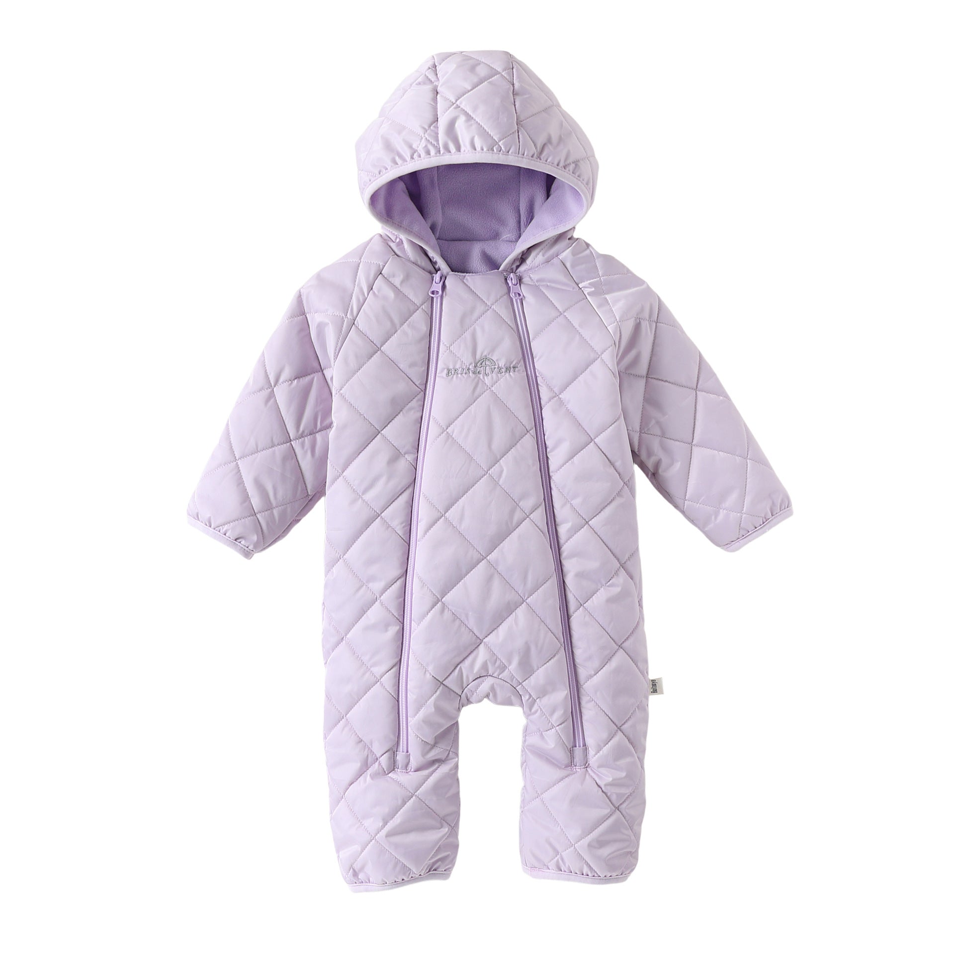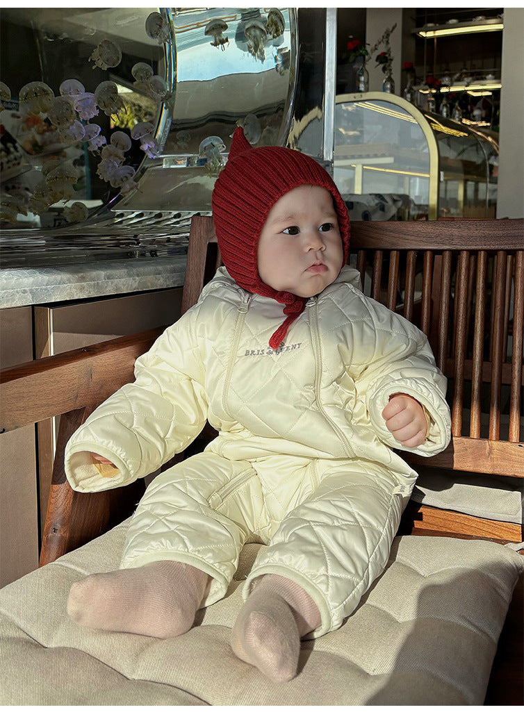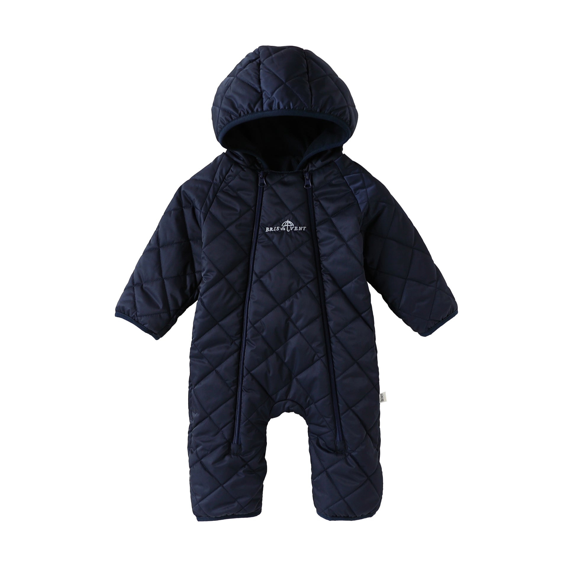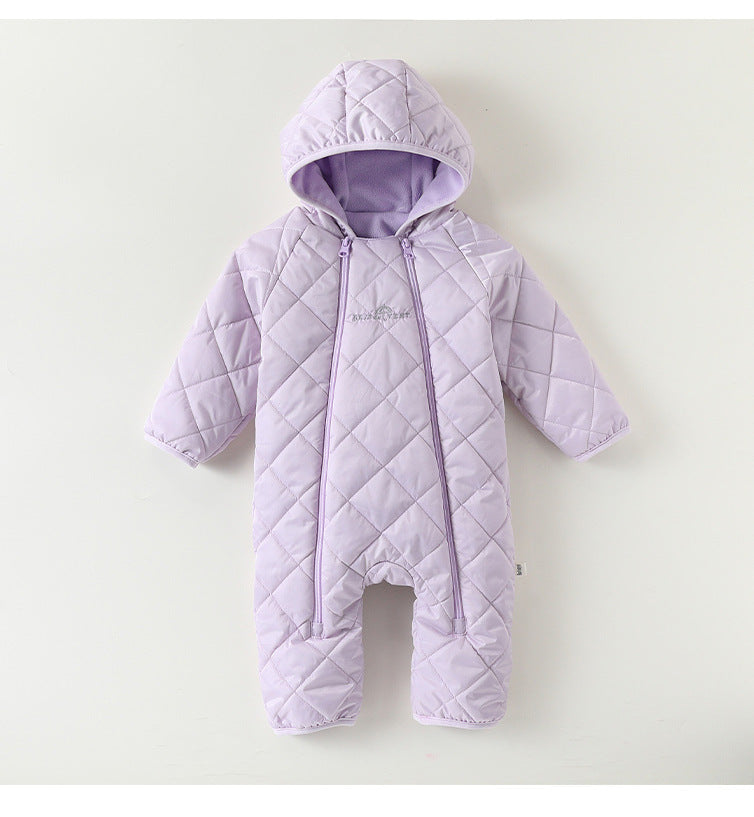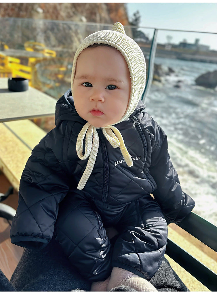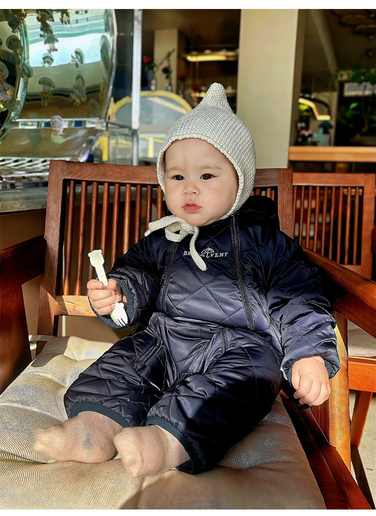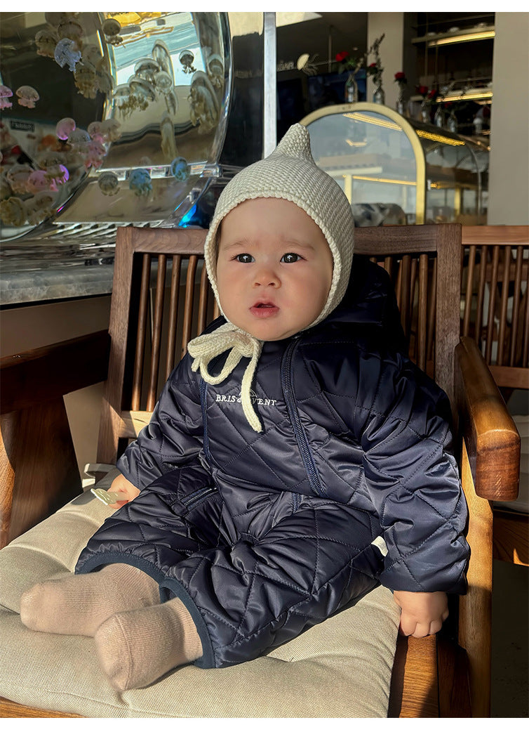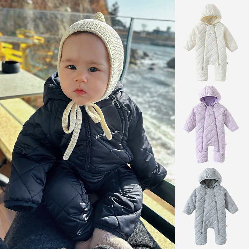 暖かな中綿をたっぷり使用し、寒い日のお出かけに最適なベビー用アウタージャンプスーツです。全体に施されたキルティングと厚手の生地がしっかりとベビーを寒さから守り、フード付きのデザインがさらに防寒性を高めます。ロンパース型のボディスーツは、着替えやおむつ交換もスムーズに行え、冬のレジャーやスキーウェアとしても活躍する機能的な子ども服です。