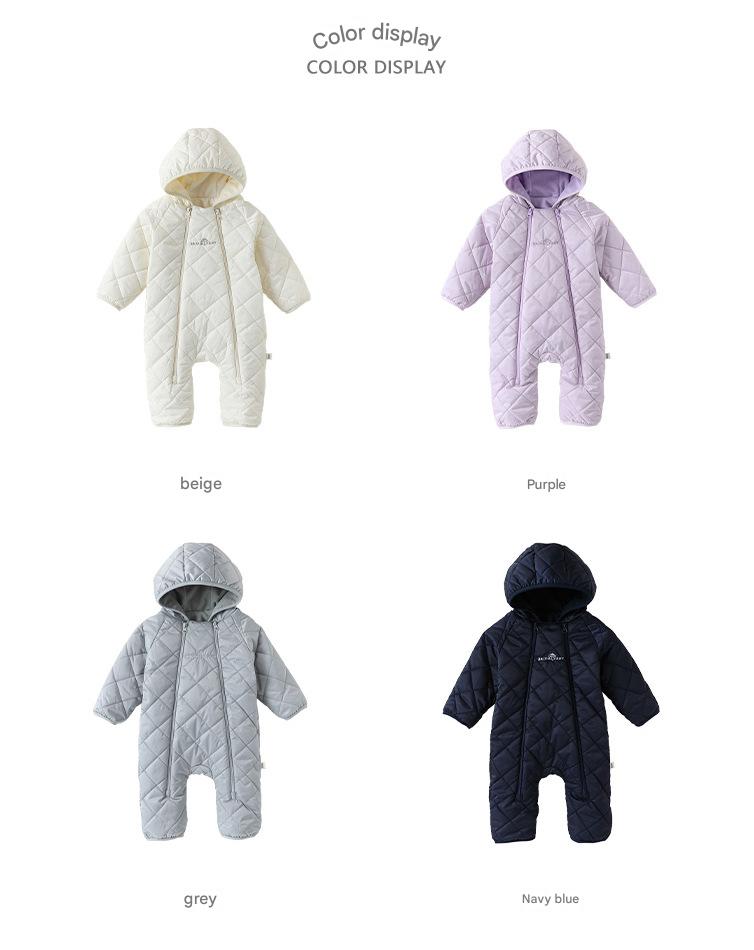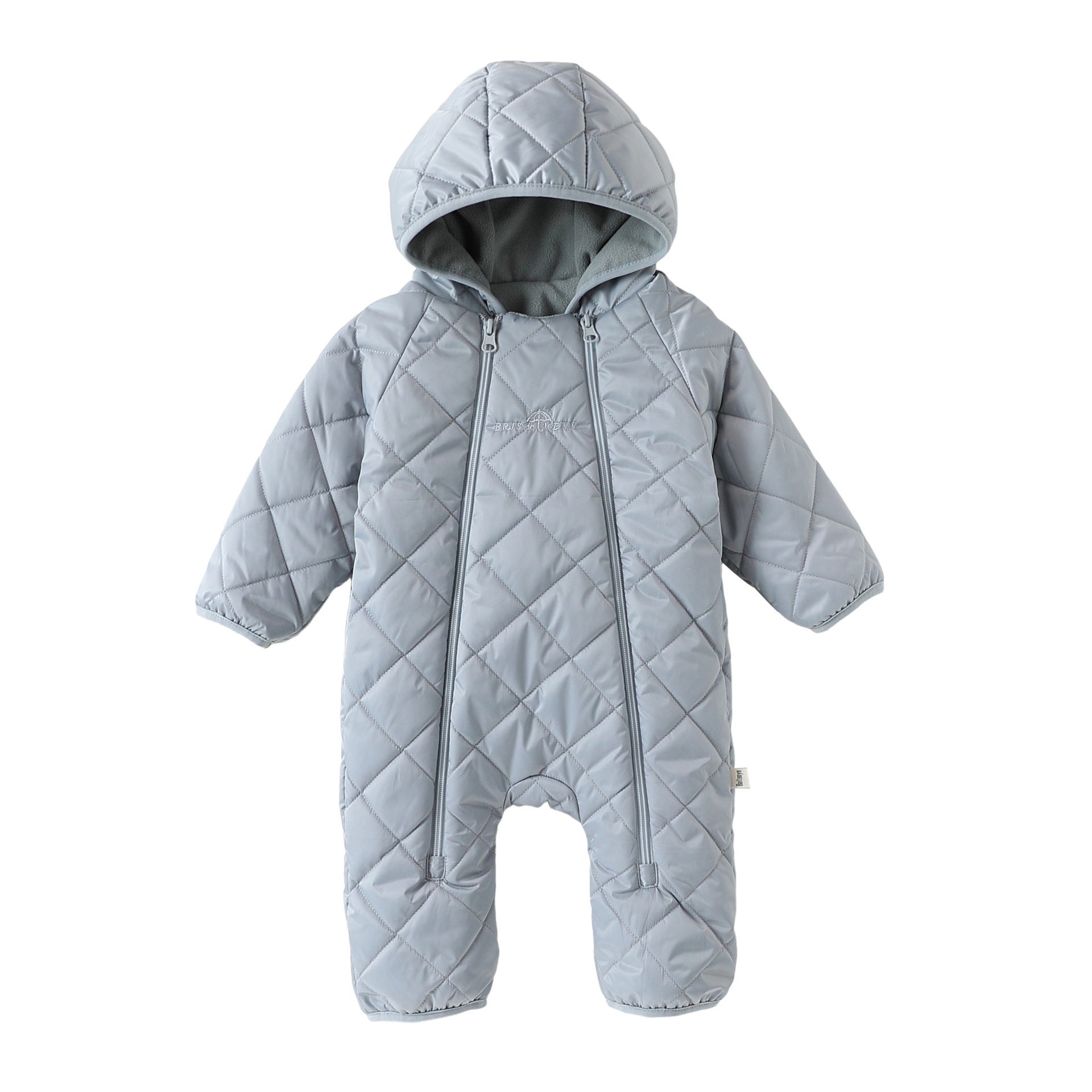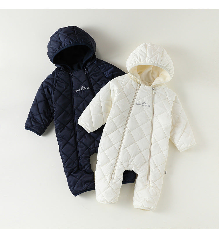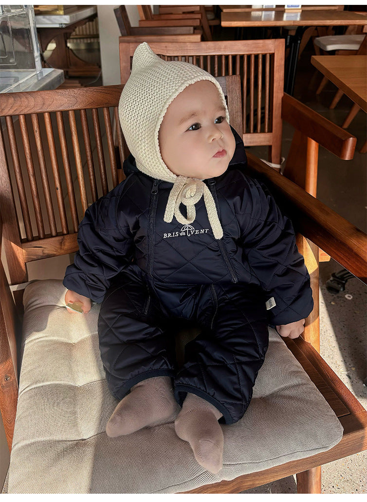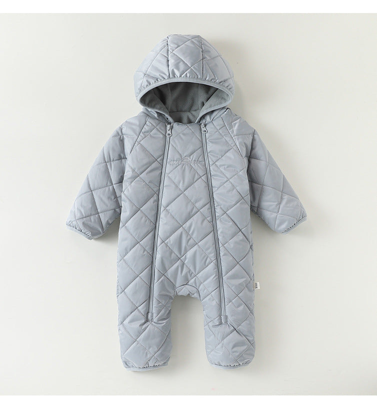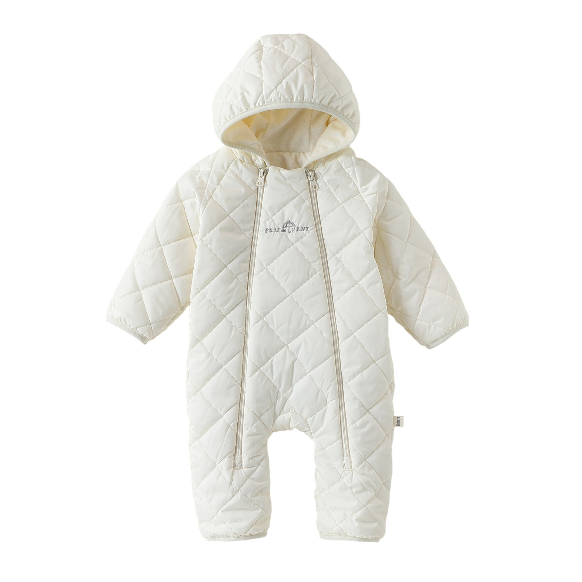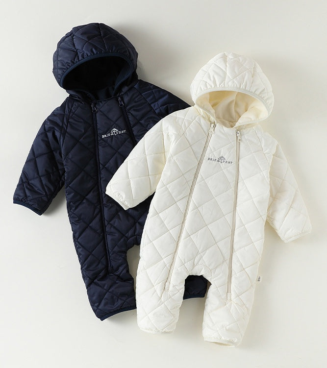 暖かな中綿をたっぷり使用し、寒い日のお出かけに最適なベビー用アウタージャンプスーツです。全体に施されたキルティングと厚手の生地がしっかりとベビーを寒さから守り、フード付きのデザインがさらに防寒性を高めます。ロンパース型のボディスーツは、着替えやおむつ交換もスムーズに行え、冬のレジャーやスキーウェアとしても活躍する機能的な子ども服です。