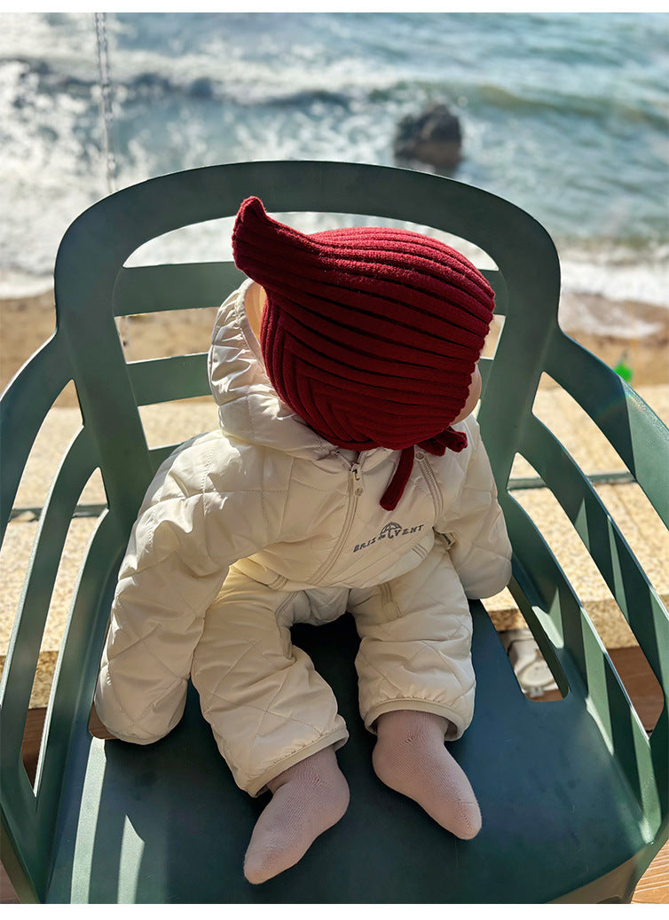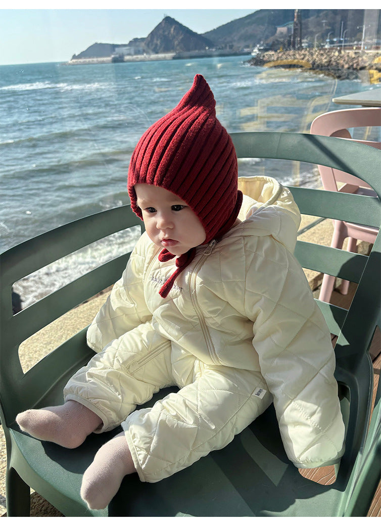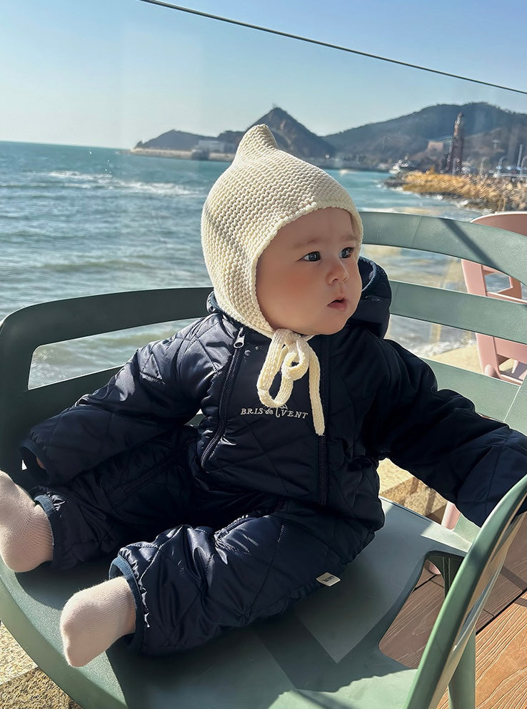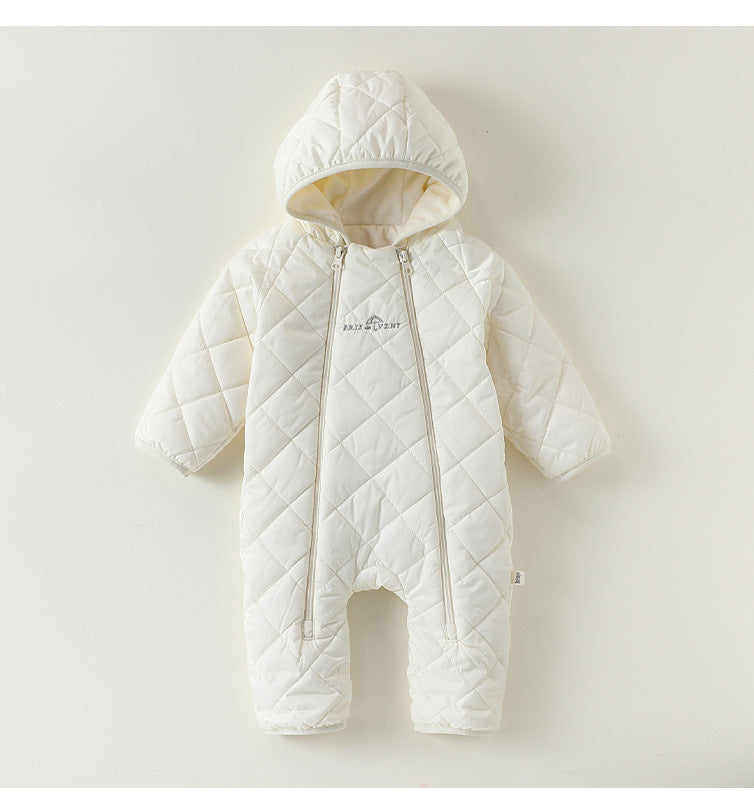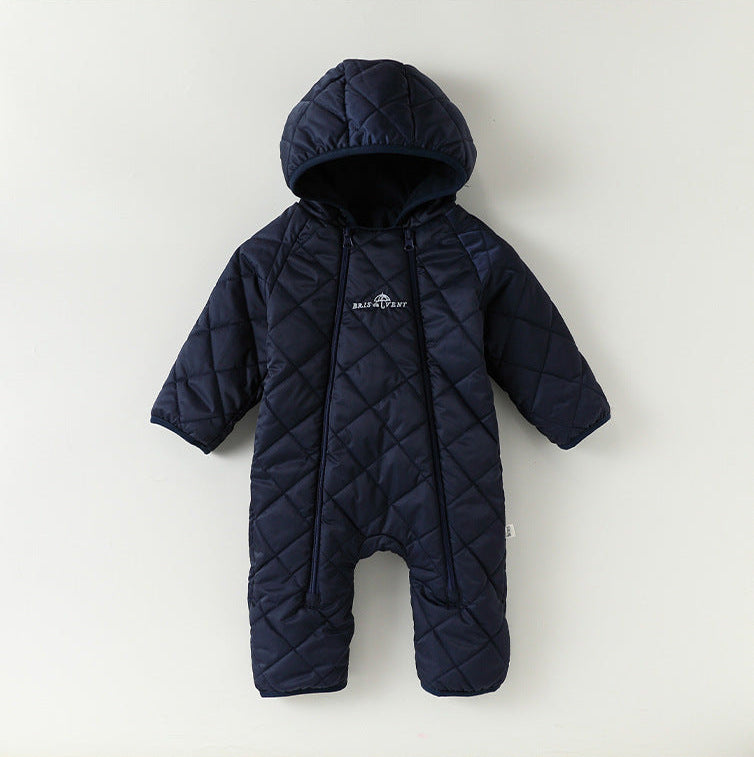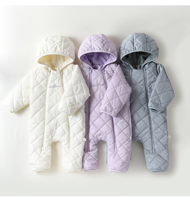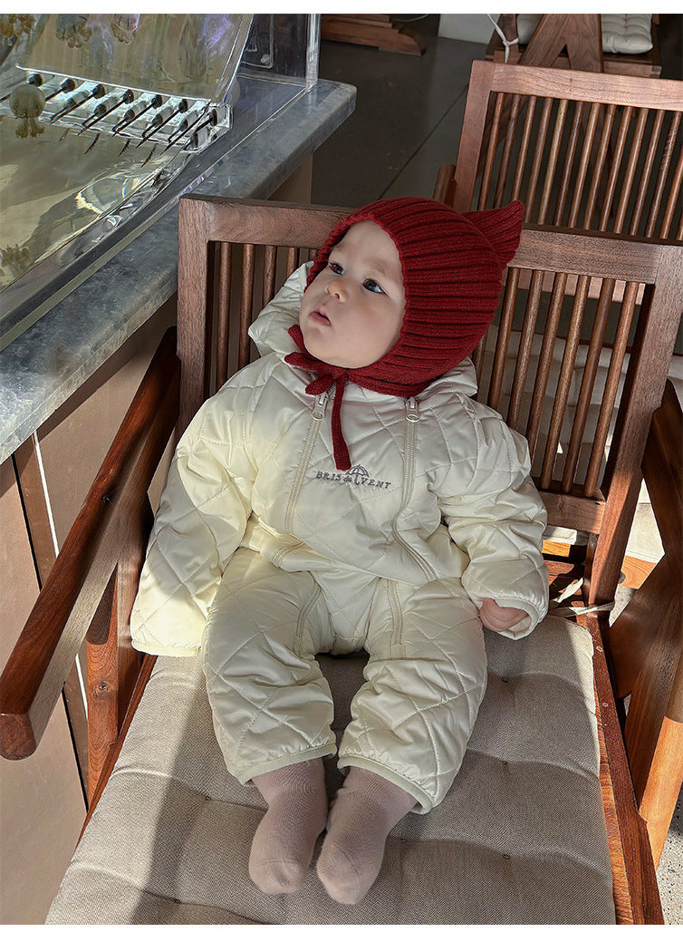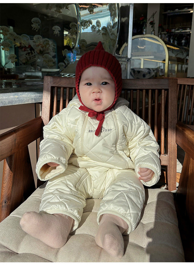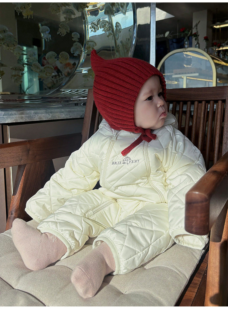 暖かな中綿をたっぷり使用し、寒い日のお出かけに最適なベビー用アウタージャンプスーツです。全体に施されたキルティングと厚手の生地がしっかりとベビーを寒さから守り、フード付きのデザインがさらに防寒性を高めます。ロンパース型のボディスーツは、着替えやおむつ交換もスムーズに行え、冬のレジャーやスキーウェアとしても活躍する機能的な子ども服です。
