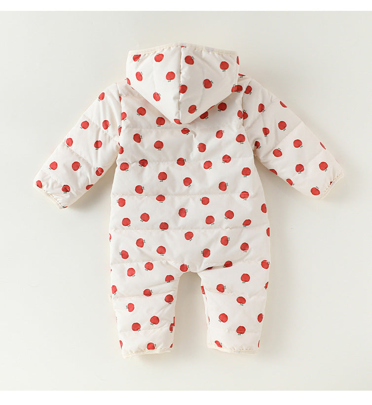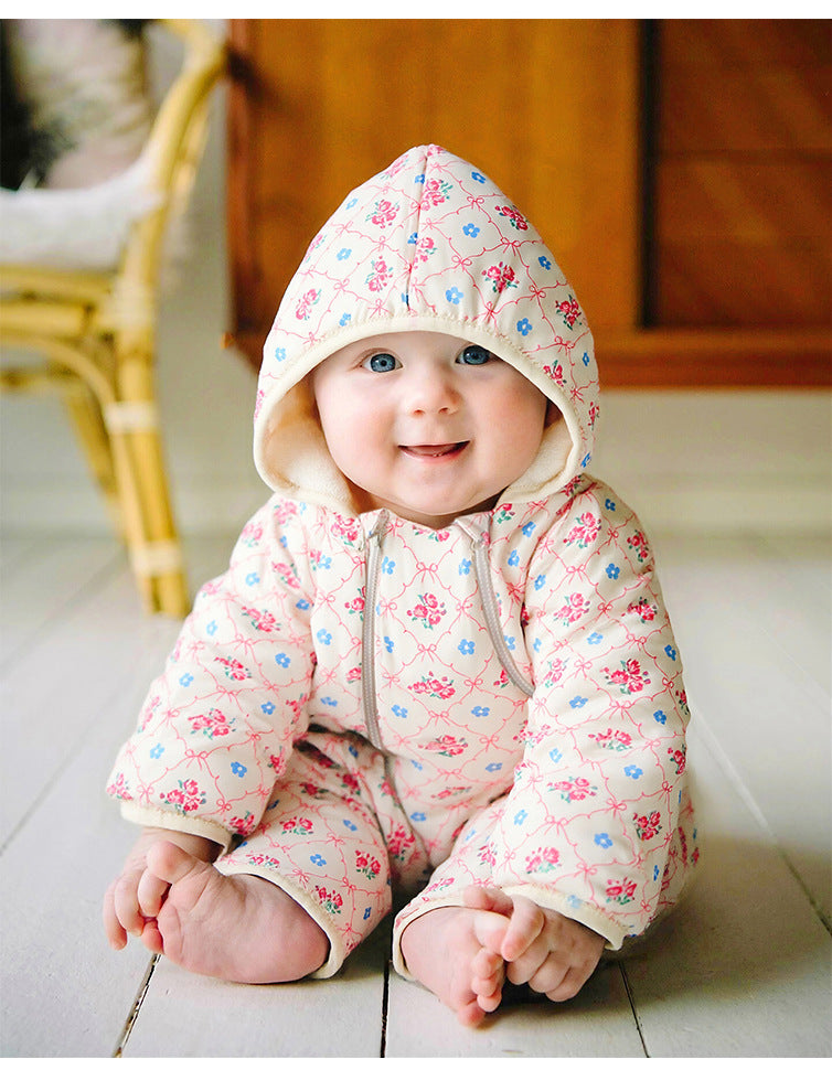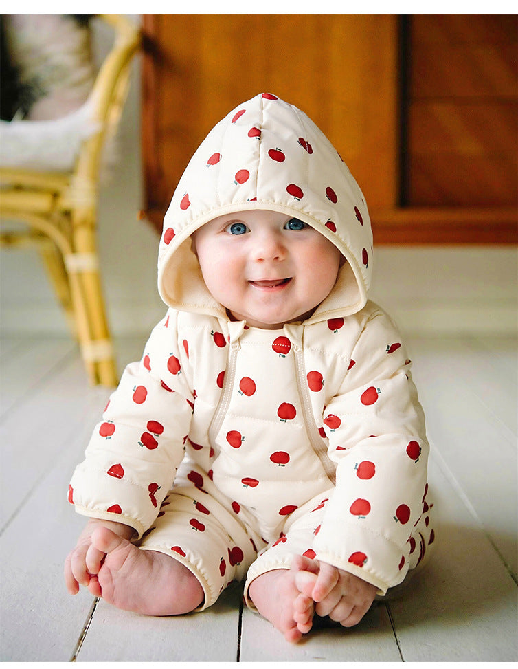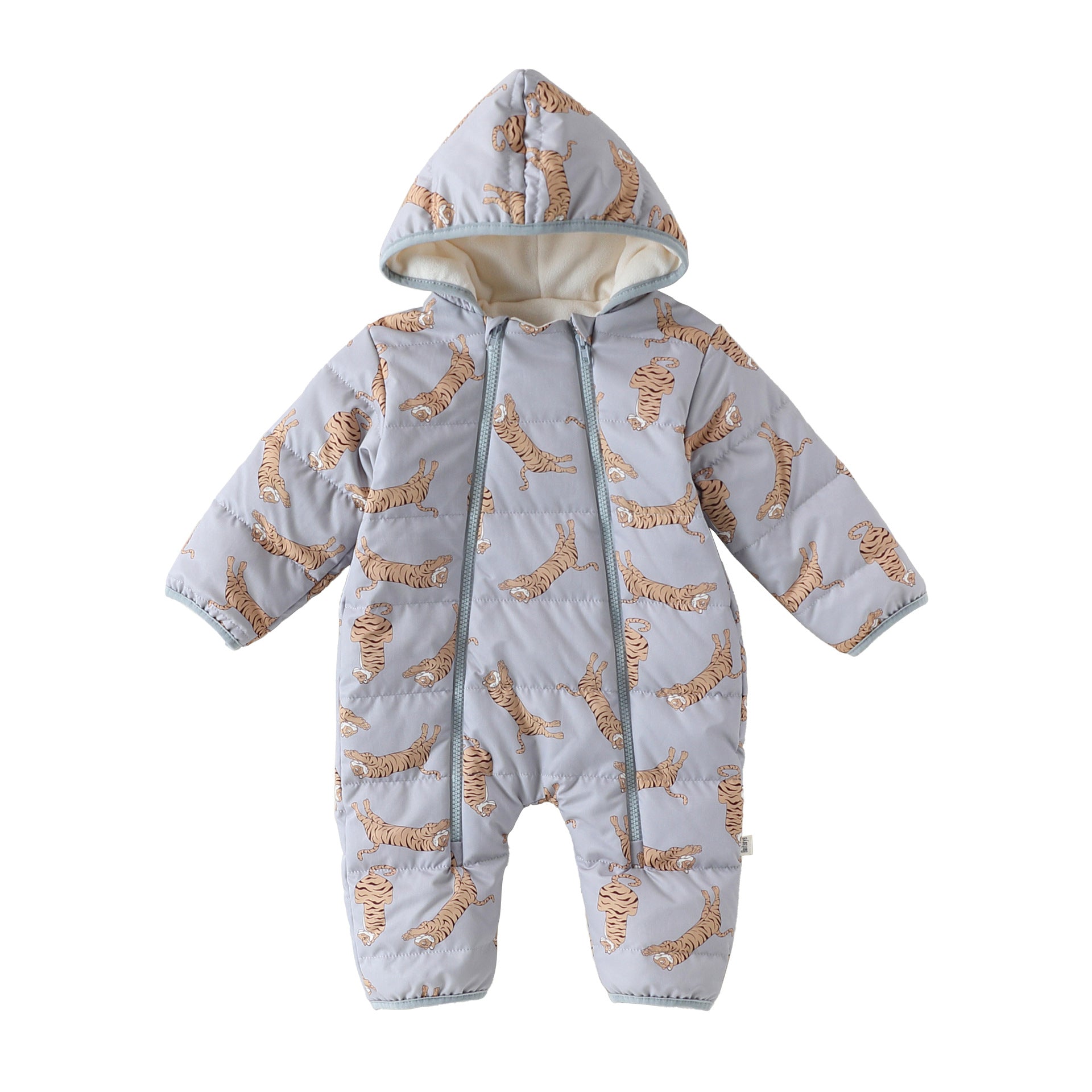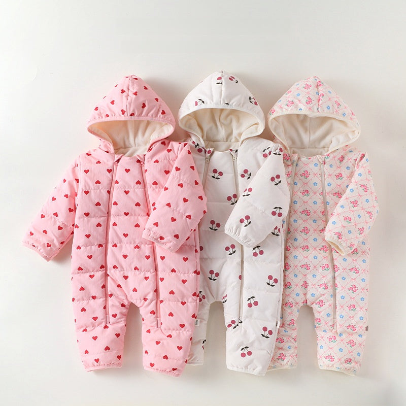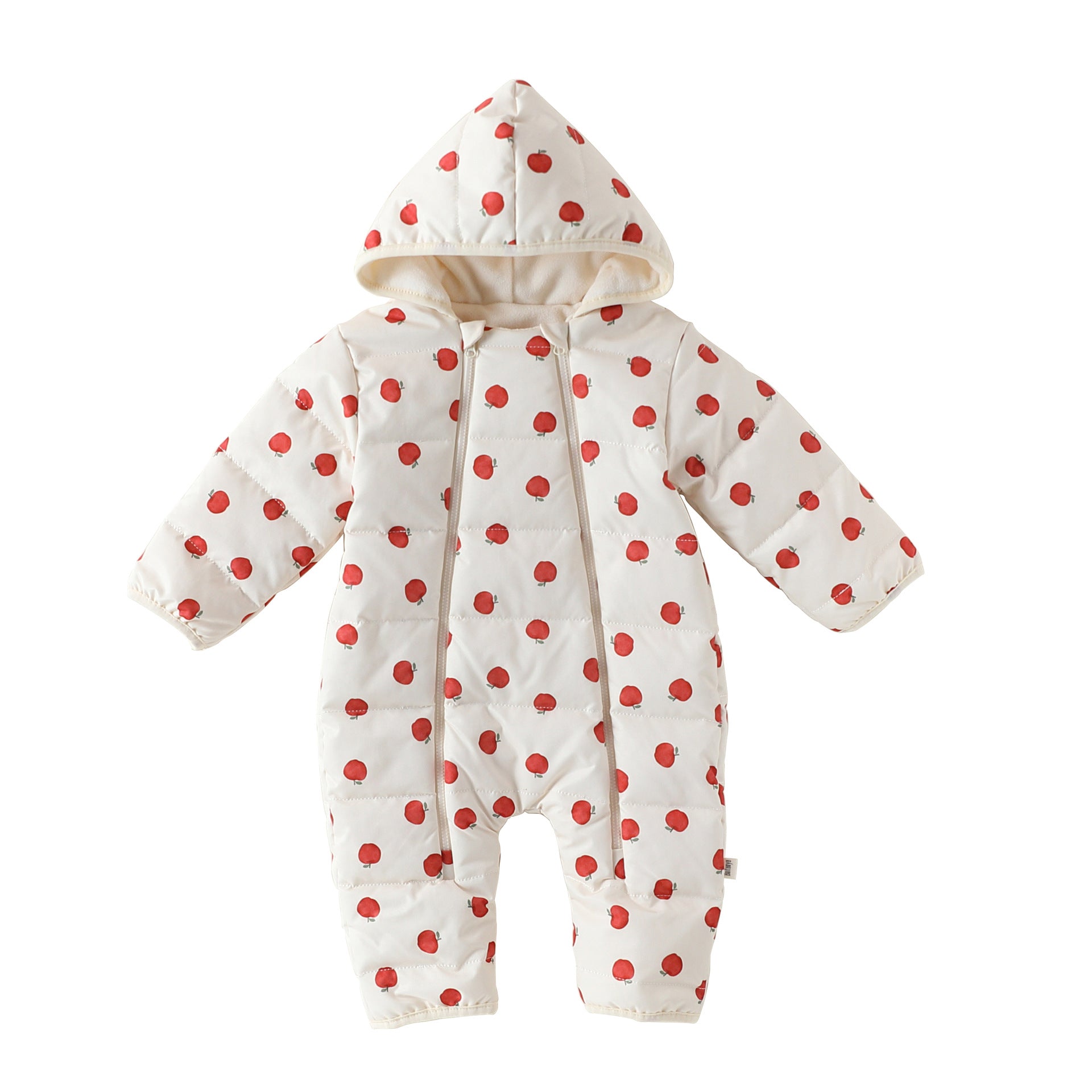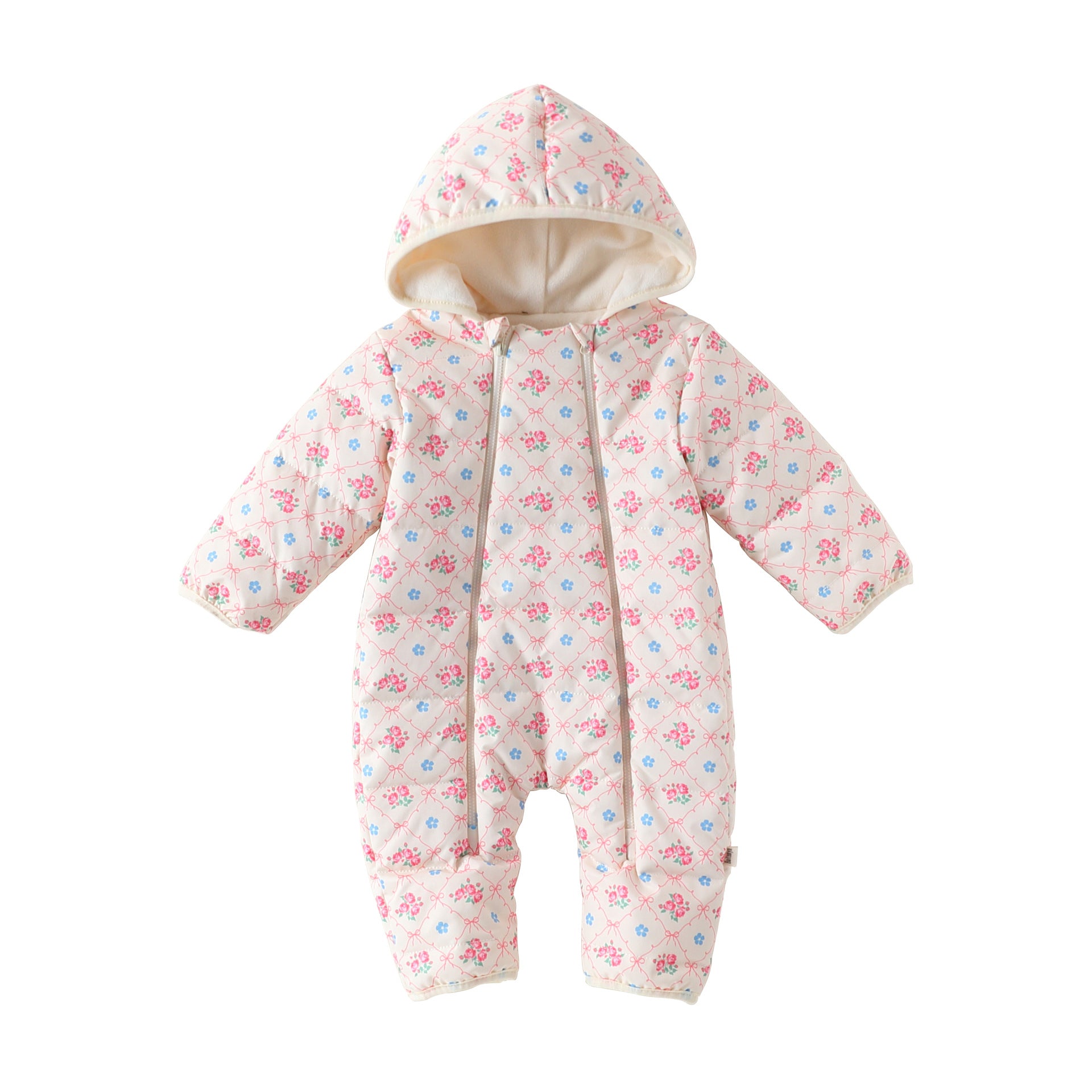 温かい中綿をたっぷりと使用し、寒い季節のお出かけに最適なベビー用アウタージャンプスーツです。愛らしい総柄プリントとキルティングの組み合わせが魅力で、厚手ながらも軽い着心地を実現しました。フード付きのデザインが頭部までしっかりと防寒し、ロンパース型のボディスーツは、ベビーを優しく包み込む機能的な一着です。