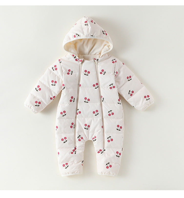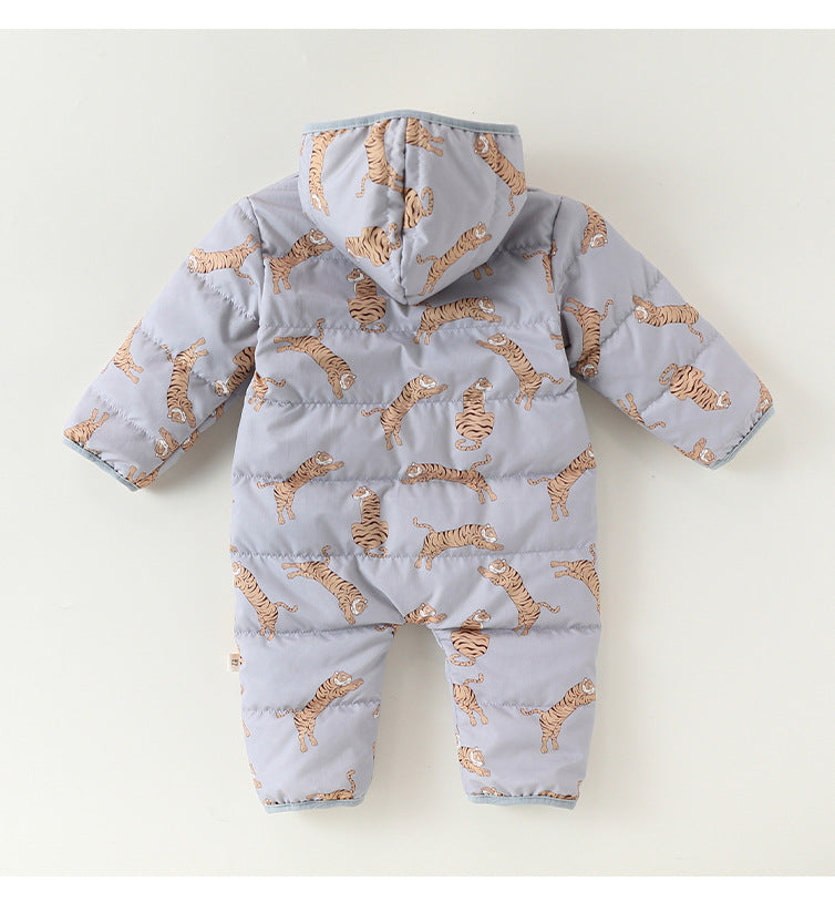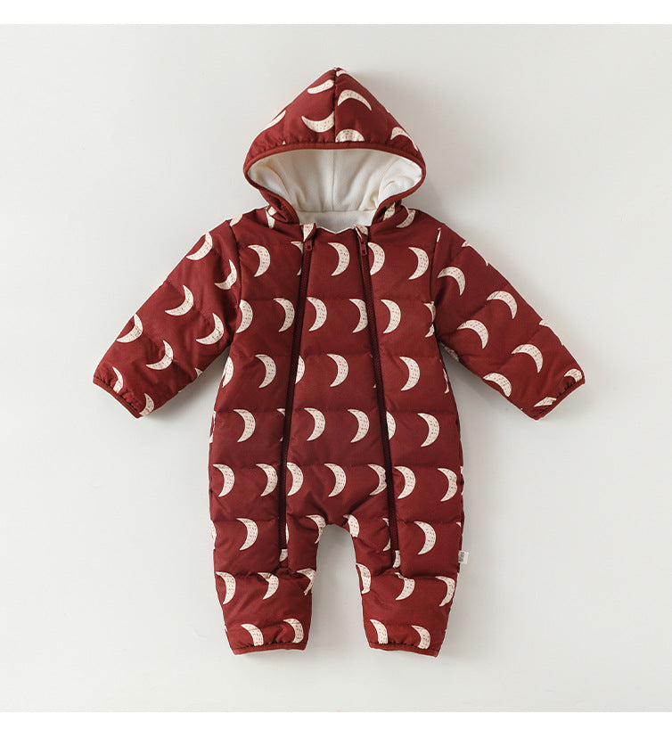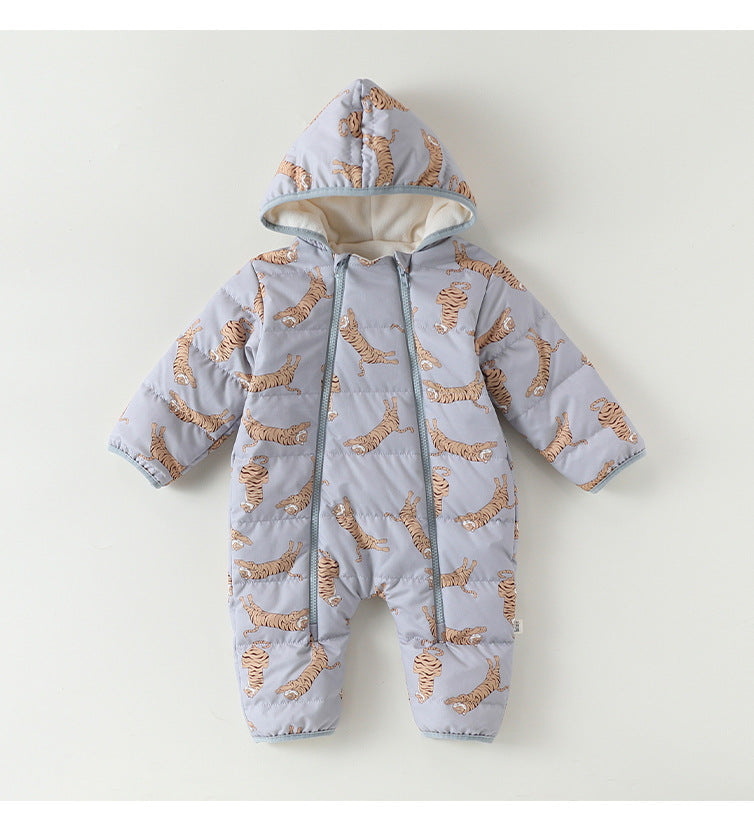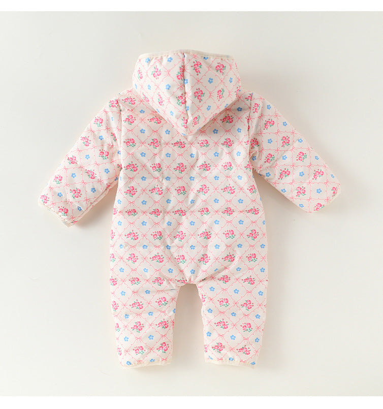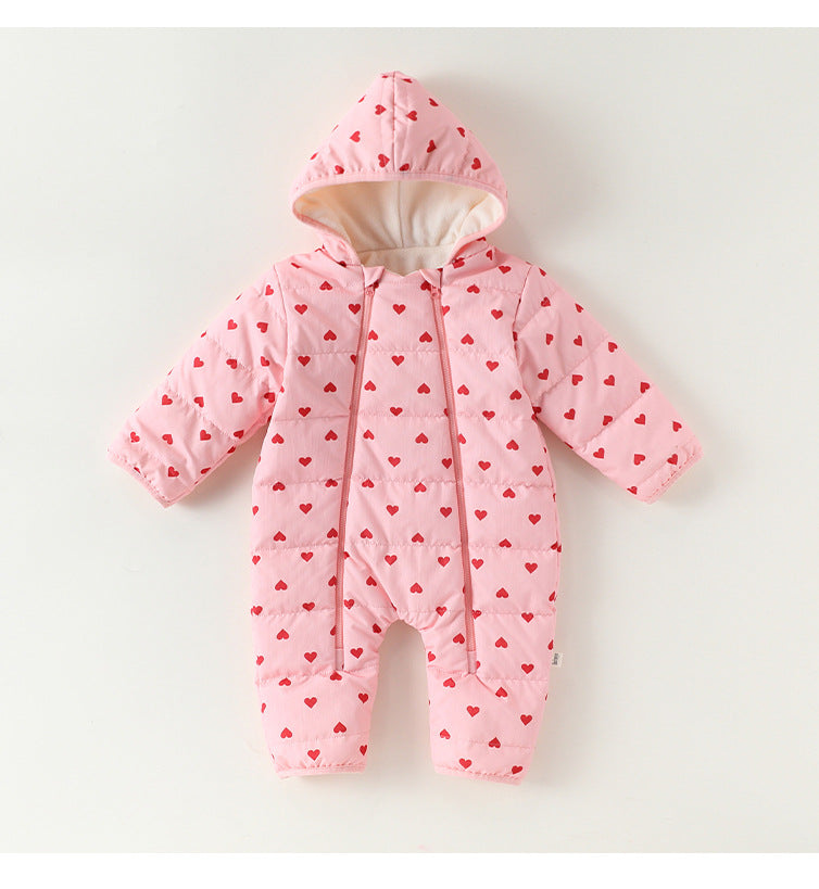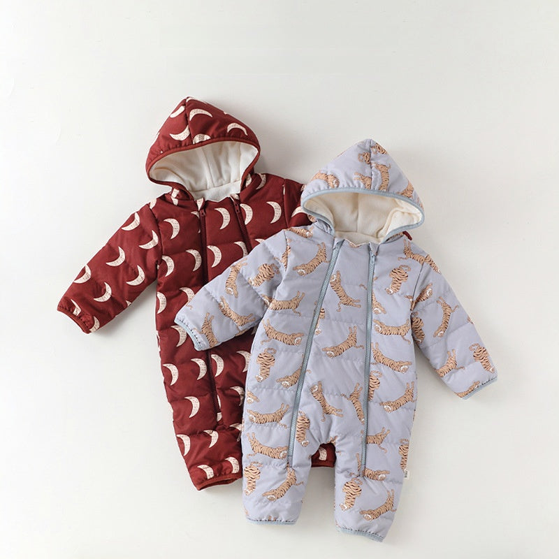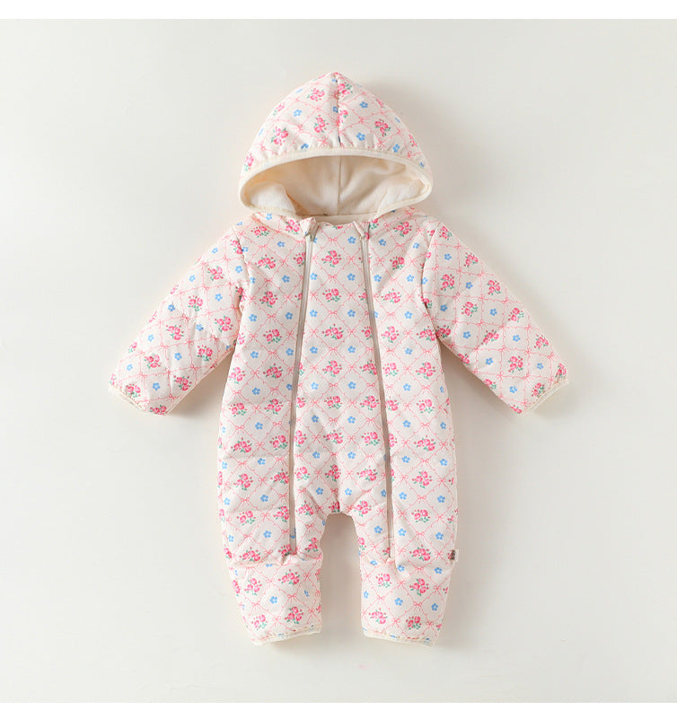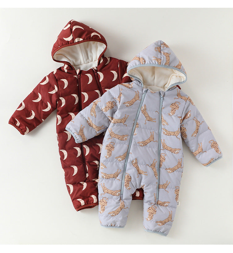 温かい中綿をたっぷりと使用し、寒い季節のお出かけに最適なベビー用アウタージャンプスーツです。愛らしい総柄プリントとキルティングの組み合わせが魅力で、厚手ながらも軽い着心地を実現しました。フード付きのデザインが頭部までしっかりと防寒し、ロンパース型のボディスーツは、ベビーを優しく包み込む機能的な一着です。