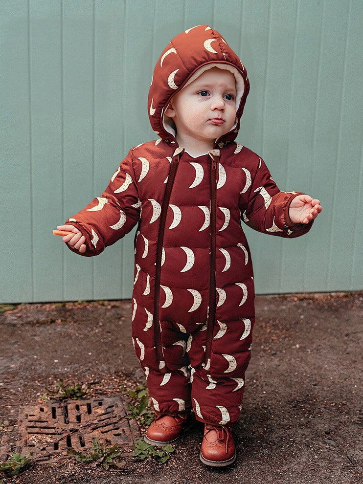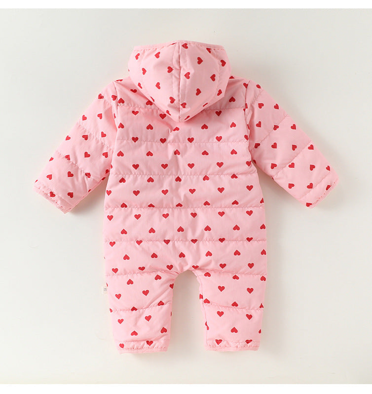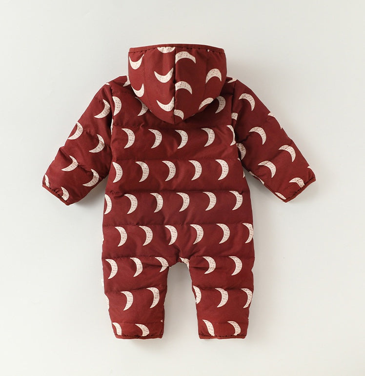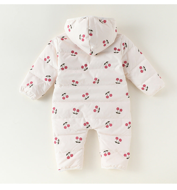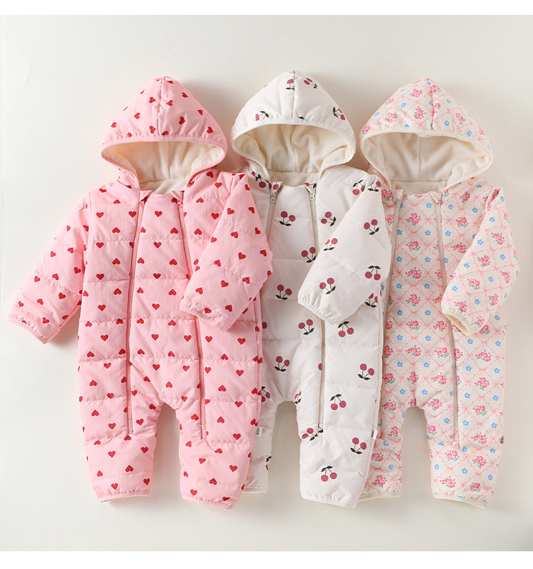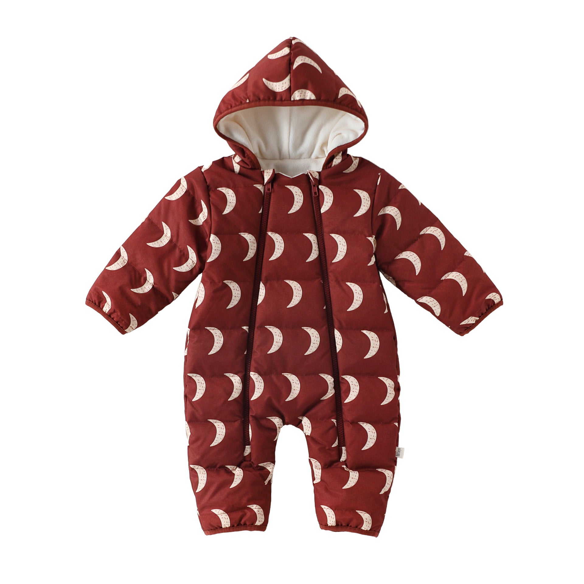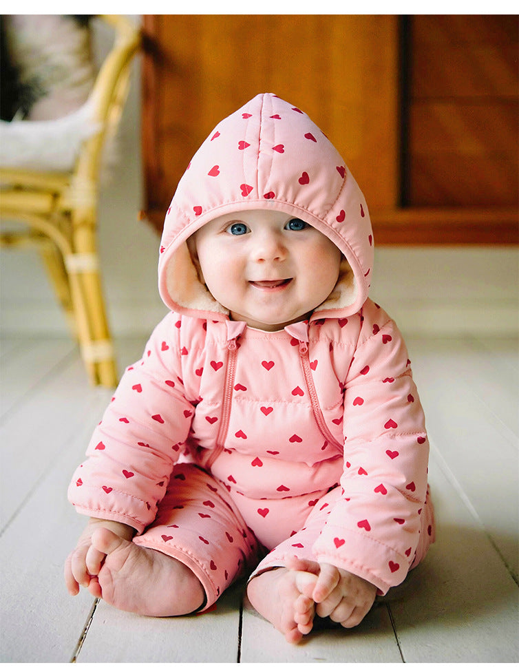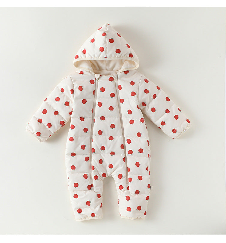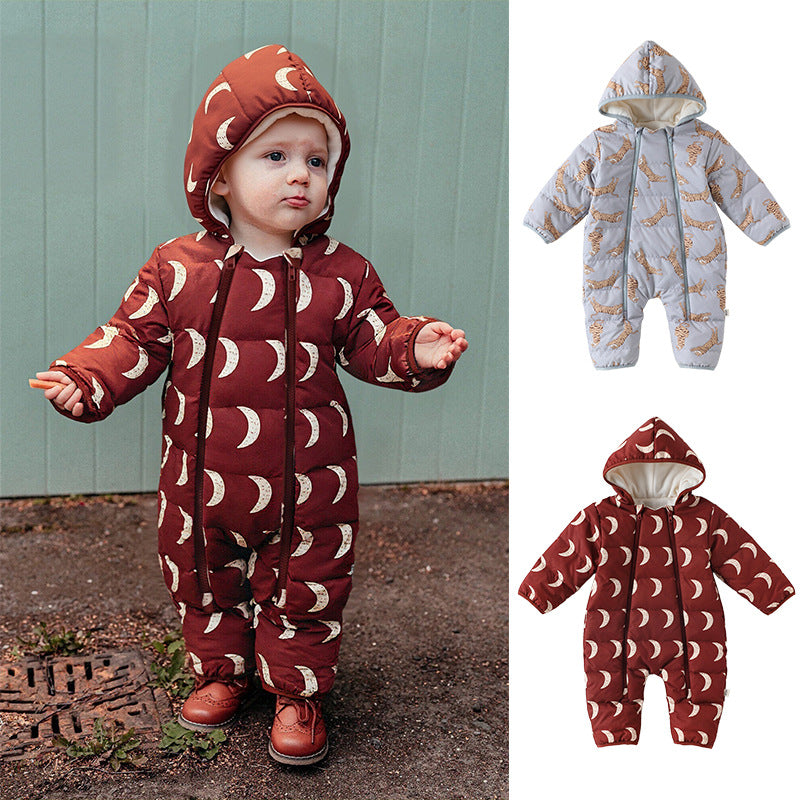 温かい中綿をたっぷりと使用し、寒い季節のお出かけに最適なベビー用アウタージャンプスーツです。愛らしい総柄プリントとキルティングの組み合わせが魅力で、厚手ながらも軽い着心地を実現しました。フード付きのデザインが頭部までしっかりと防寒し、ロンパース型のボディスーツは、ベビーを優しく包み込む機能的な一着です。