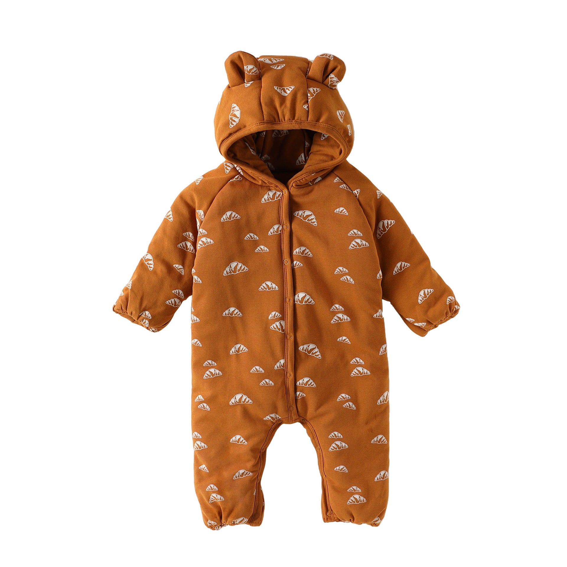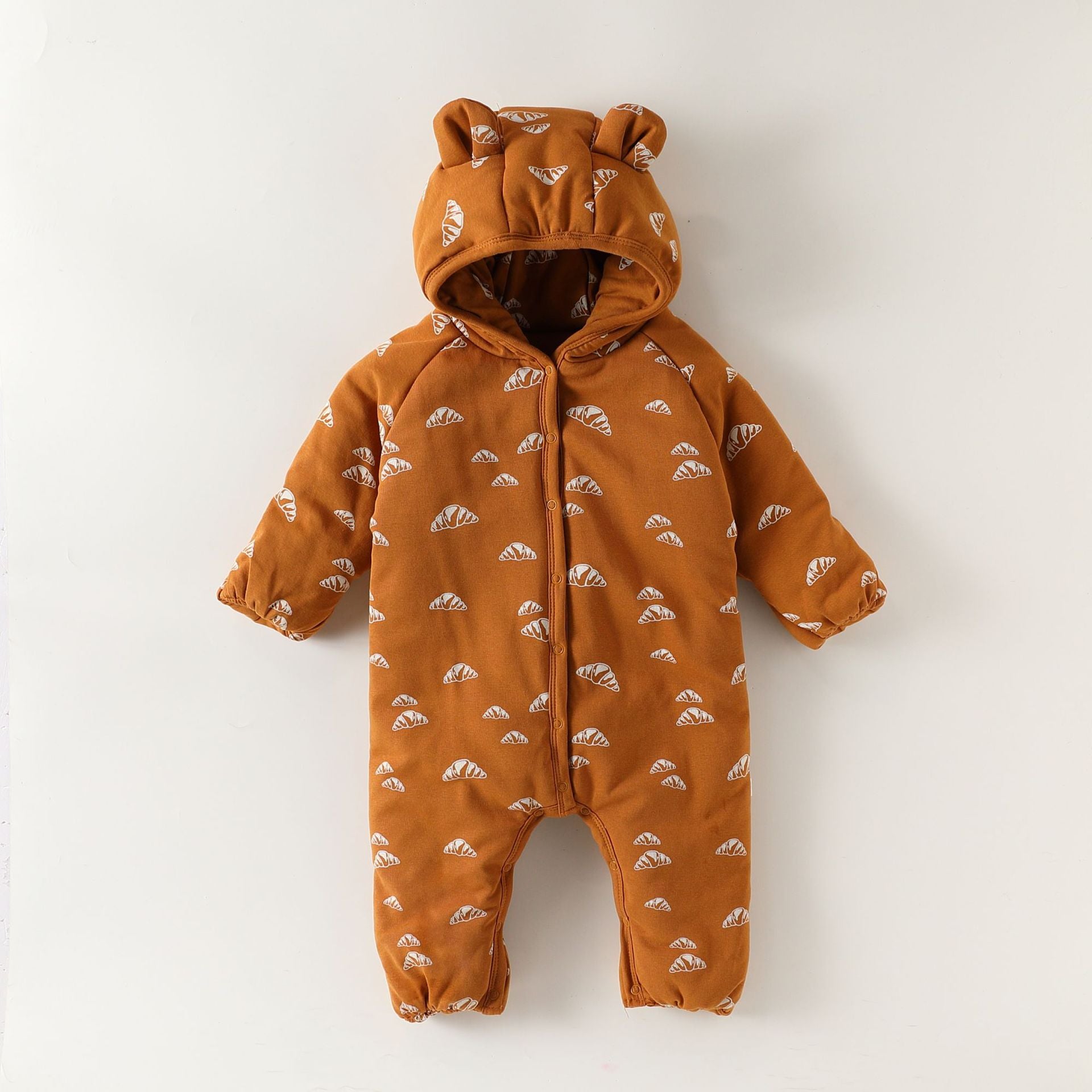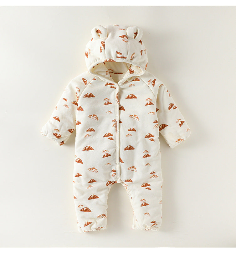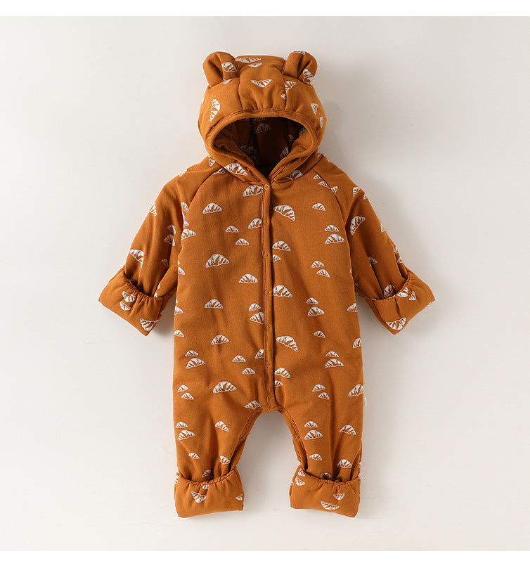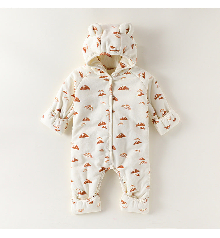温かい中綿をたっぷりと使用した、寒い日のお出かけに最適なベビー用アウタージャンプスーツです。フードに施された耳付きのデザインが愛らしい雰囲気を演出し、厚手の生地がベビーをしっかりと寒さから守ります。手足カバーが付いているため、外出時の防寒対策も完璧で、ロンパース型のボディスーツは着替えやオムツ交換にも便利な機能的な子ども服です。
