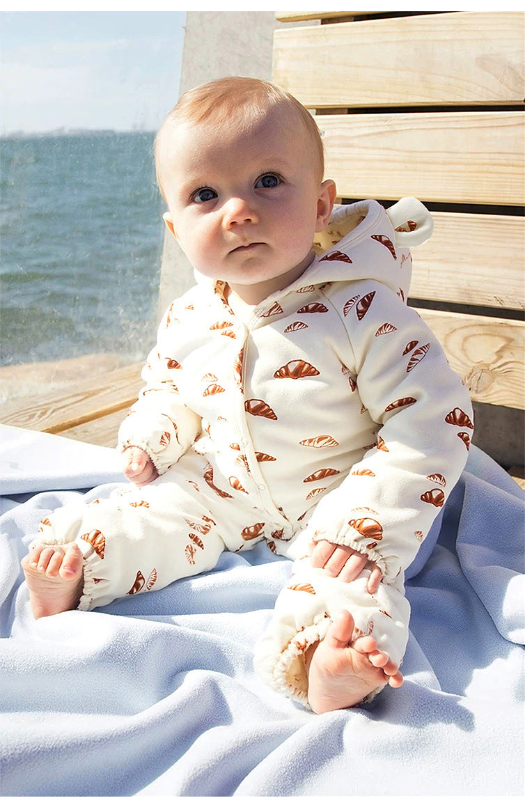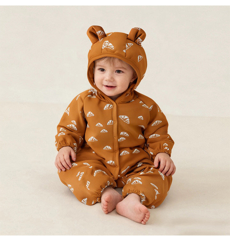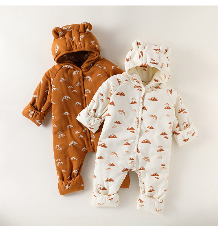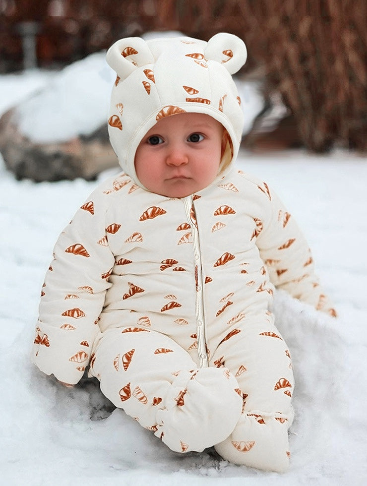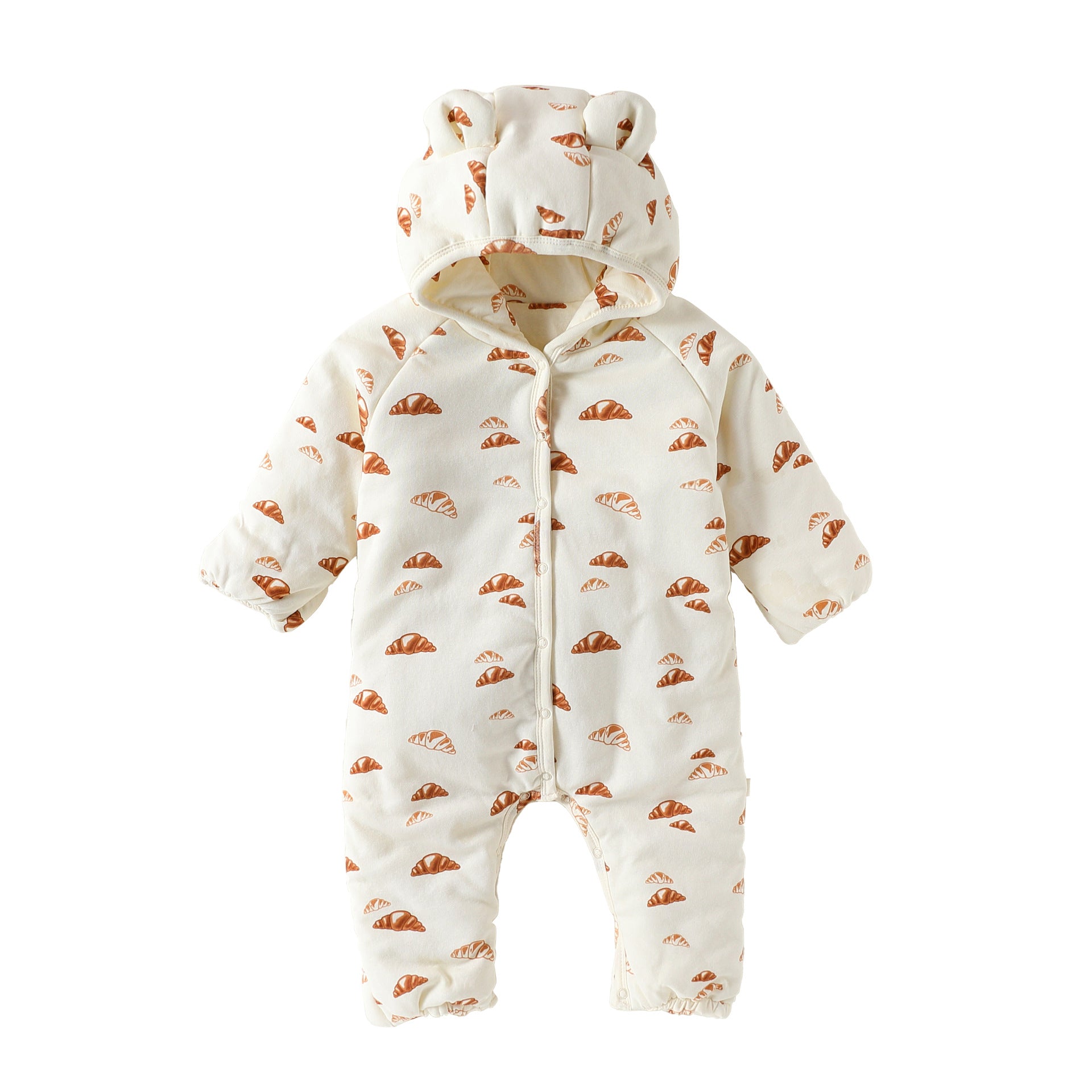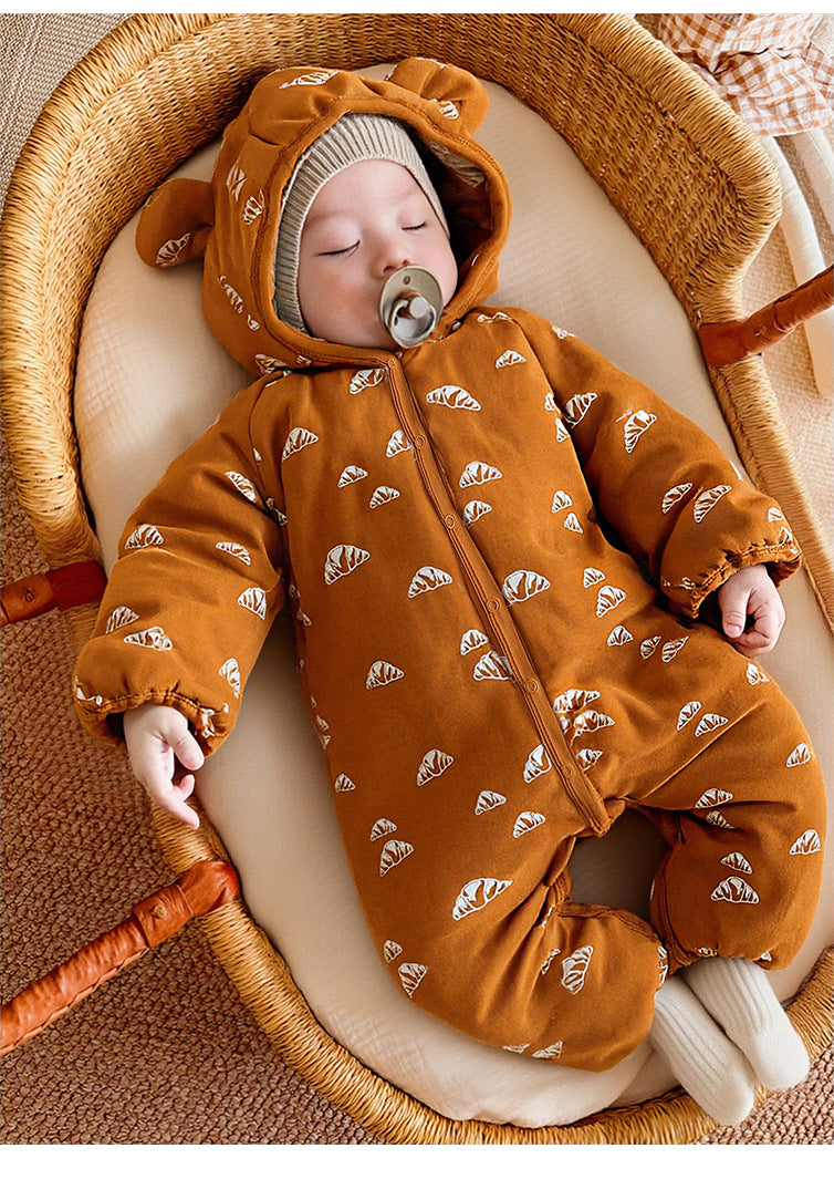 温かい中綿をたっぷりと使用した、寒い日のお出かけに最適なベビー用アウタージャンプスーツです。フードに施された耳付きのデザインが愛らしい雰囲気を演出し、厚手の生地がベビーをしっかりと寒さから守ります。手足カバーが付いているため、外出時の防寒対策も完璧で、ロンパース型のボディスーツは着替えやオムツ交換にも便利な機能的な子ども服です。
