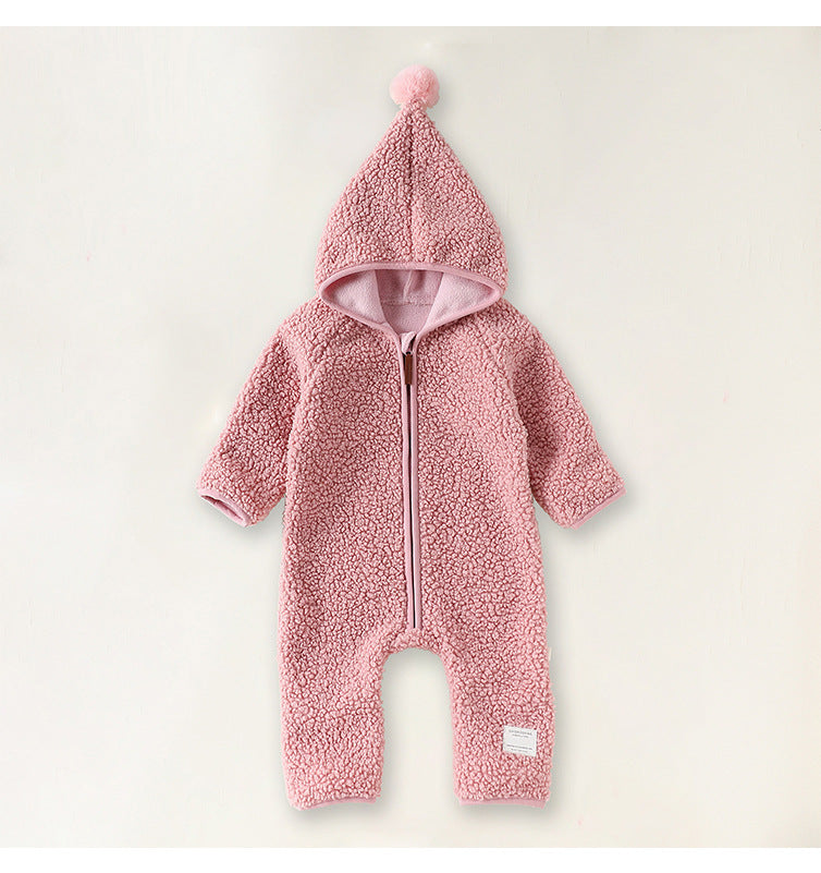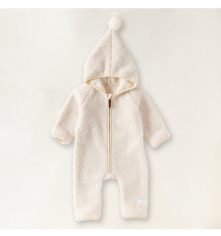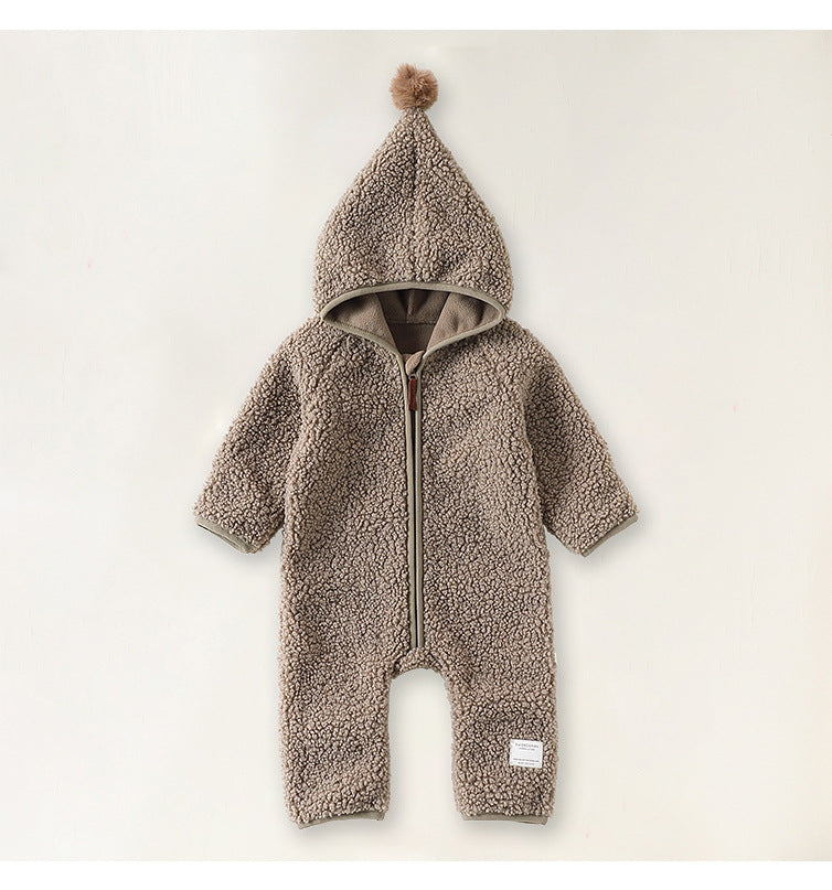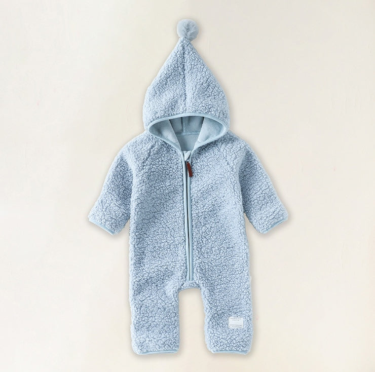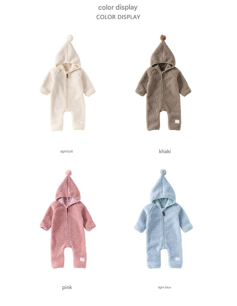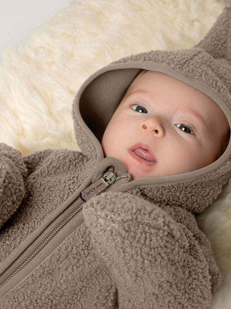 クマさんフードが愛らしいベビー用アウタージャンプスーツ。ふんわりとした厚手のボア素材が、ベビーを優しく包み込み、肌寒い季節のお出かけも暖かく快適にサポートします。全身を覆う設計のボディスーツは、防寒着としての機能性はもちろん、その愛らしいデザインで、おしゃれなママのベビーファッションを格上げする一着。ロンパースとしても使えるこのフリースウェアは、寒い日のための必須アイテムとして、毎日のベビーコーデを彩ります。