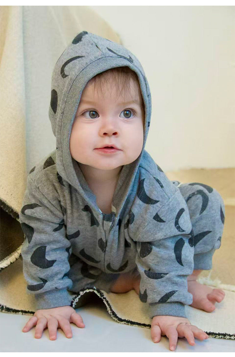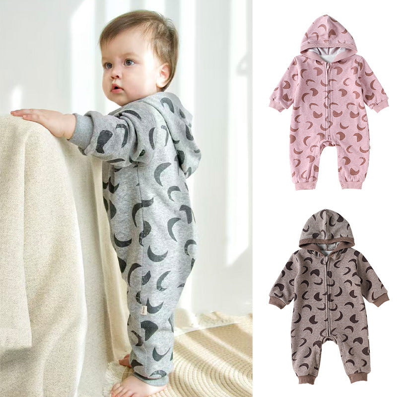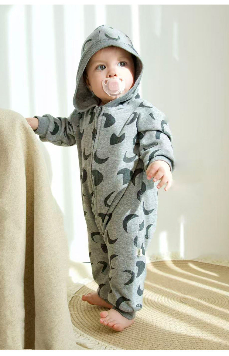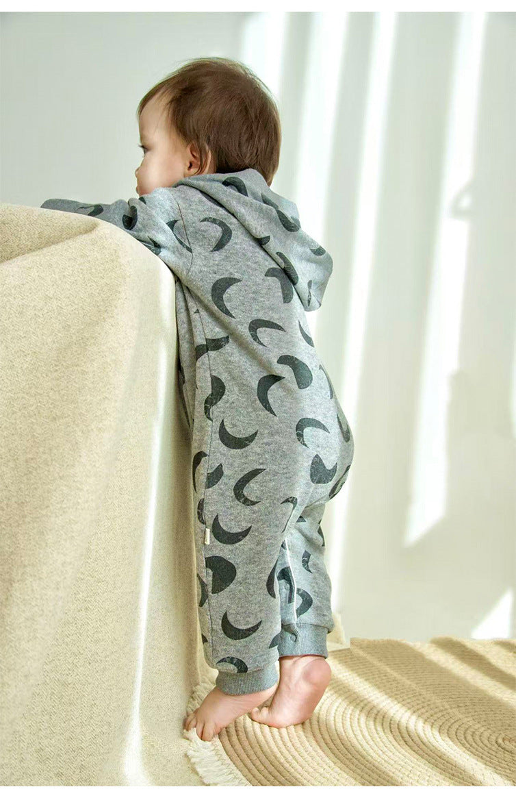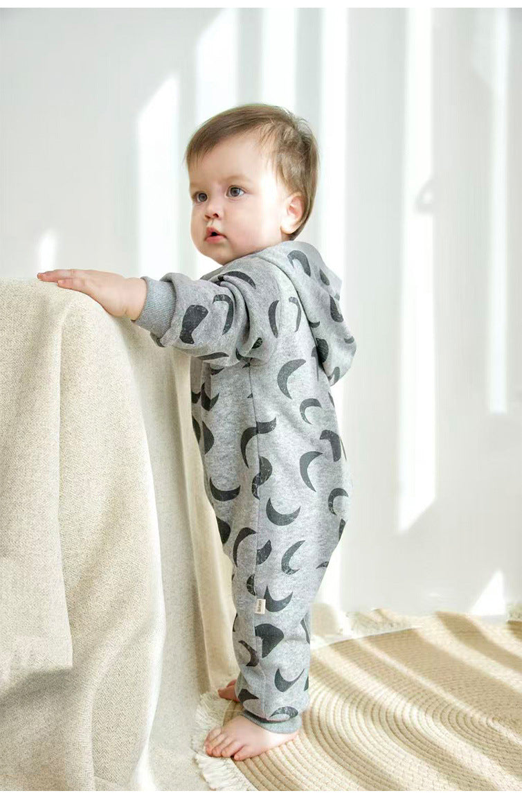 フード付きデザインがおしゃれな裏起毛のジャンプスーツ。薄手のベルベット素材がベビーを優しく包み込み、肌寒い季節のお出かけにぴったりな温かさを提供します。この長袖のロンパースは、北欧スタイルを取り入れたシンプルなデザインで、男の子にも女の子にも似合うベビー服。防寒着としても優秀なボディスーツは、ベビーの動きを妨げないクロールウェアとして、デイリーの装いに洗練された雰囲気をプラスします。