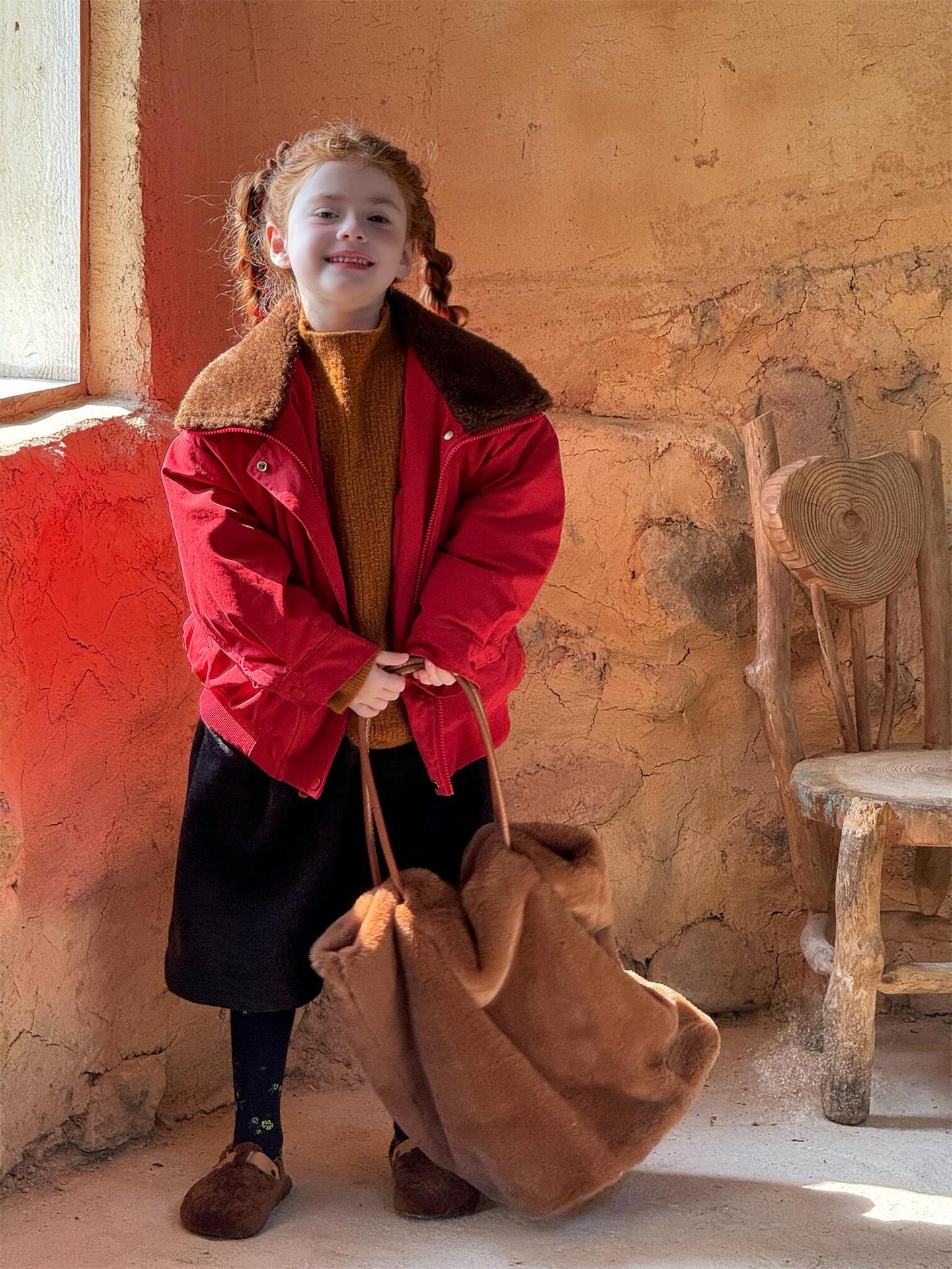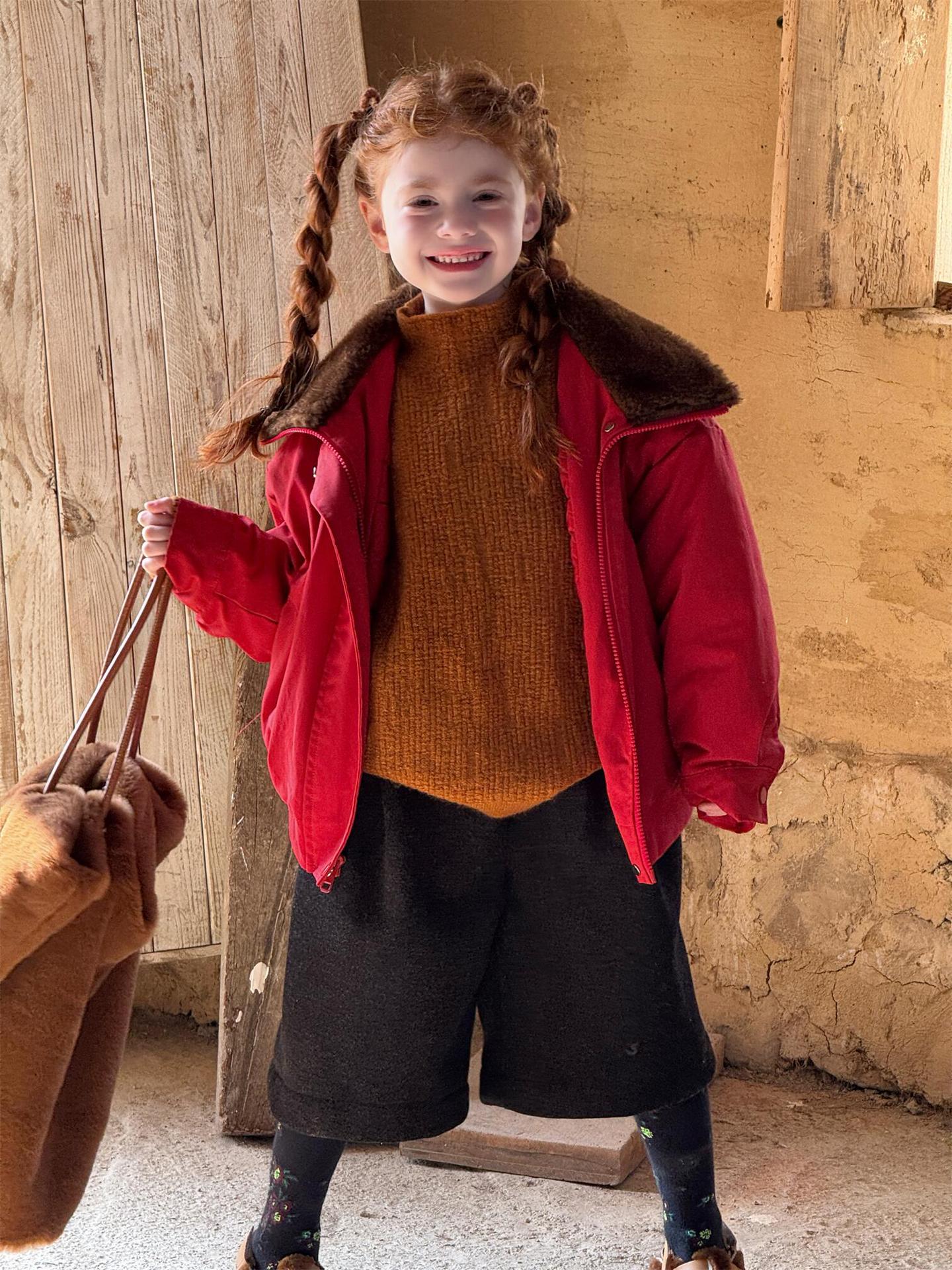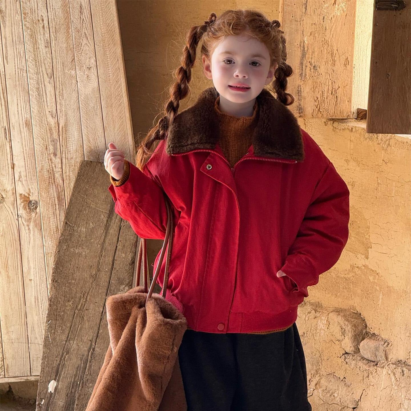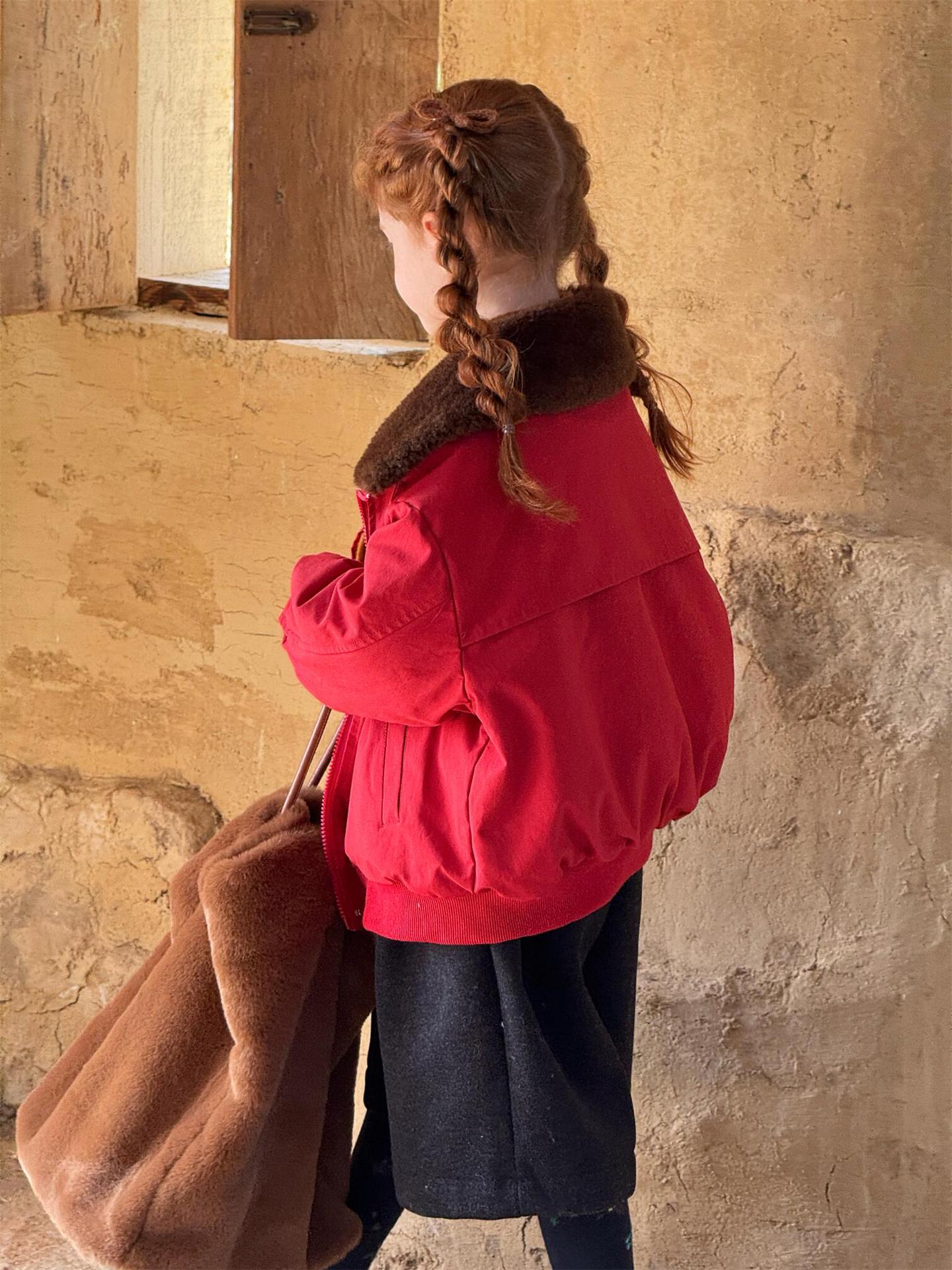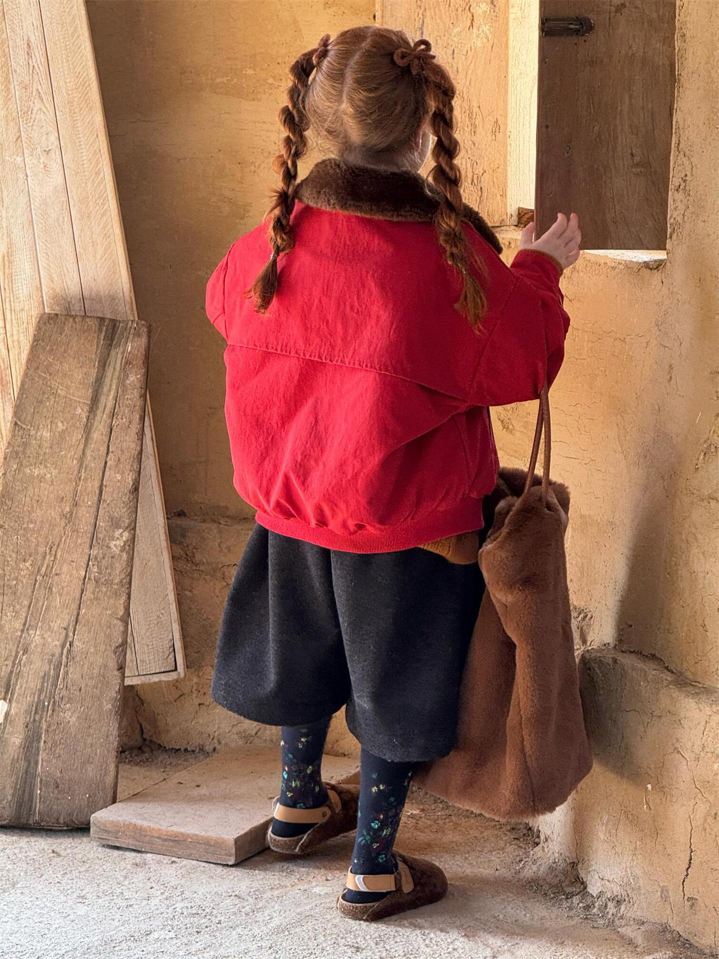 もこもことしたボア襟が顔周りを暖かく彩るブルゾンジャケットです。厚手の中わた入りで高い保温性を誇り、寒い季節にも快適に過ごせます。鮮やかなレッドカラーがコーディネートの主役になり、ショート丈のデザインが活動的な印象を与えます。暖かさと可愛らしさを両立させた、冬のおしゃれに欠かせない子ども服のアウターコートです。