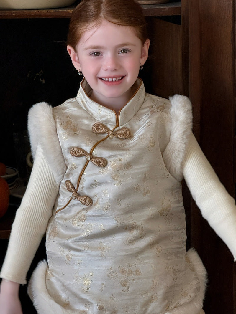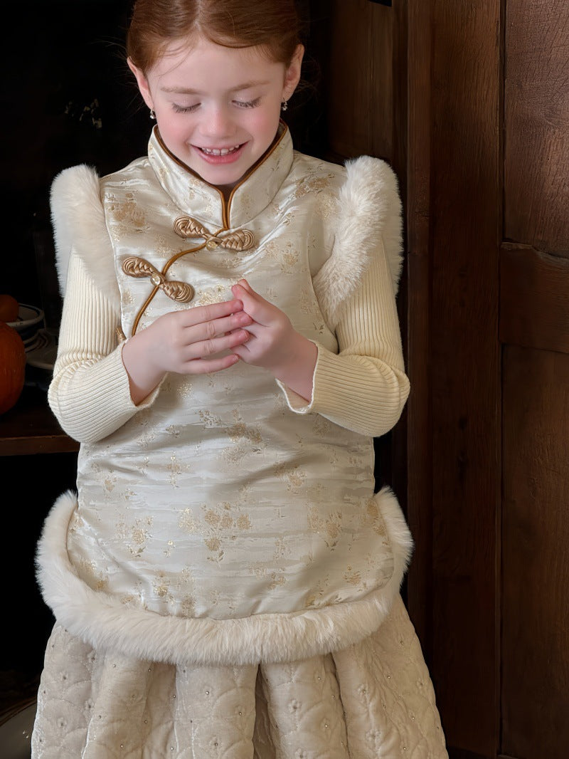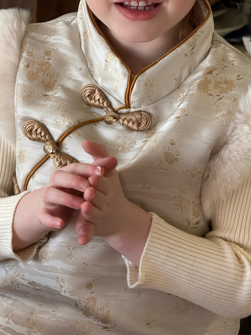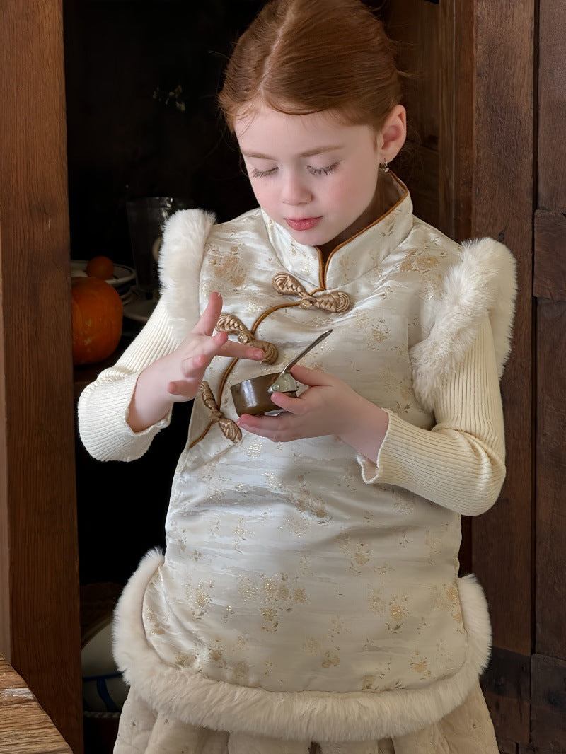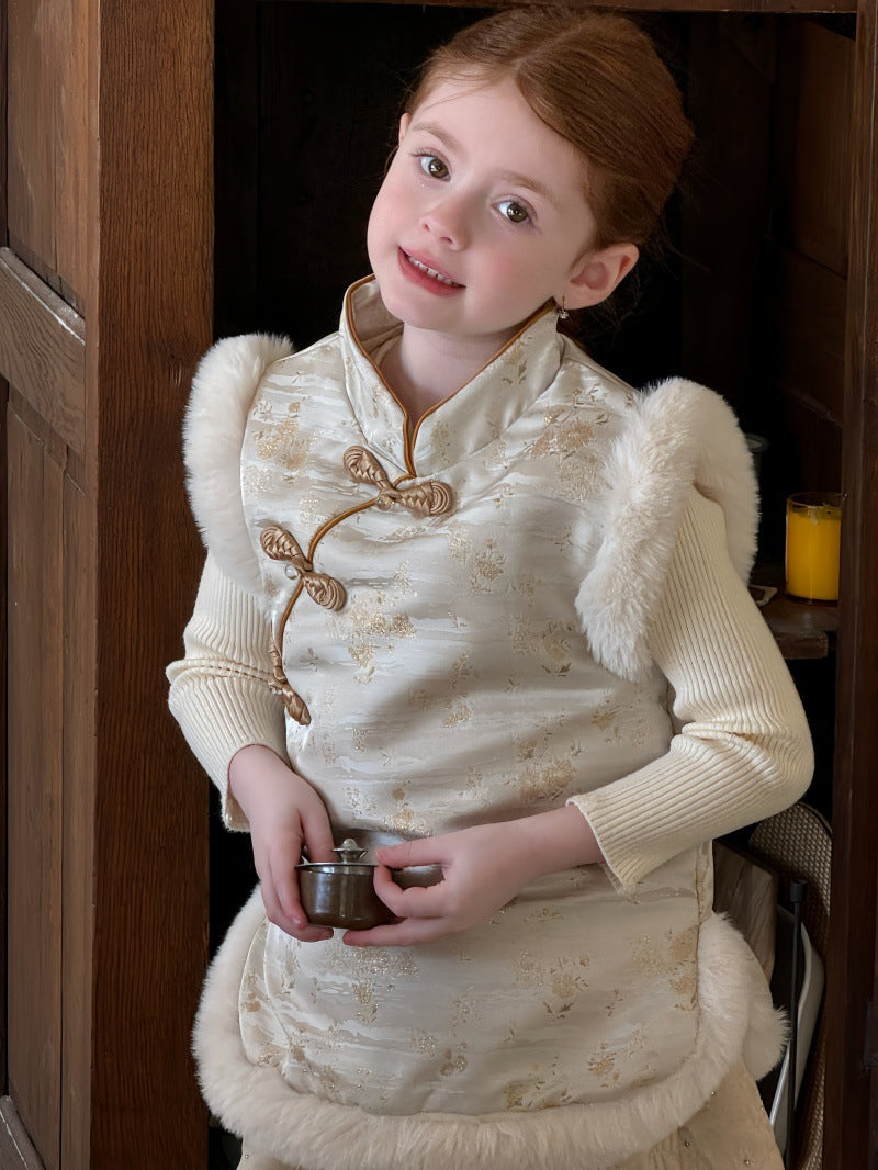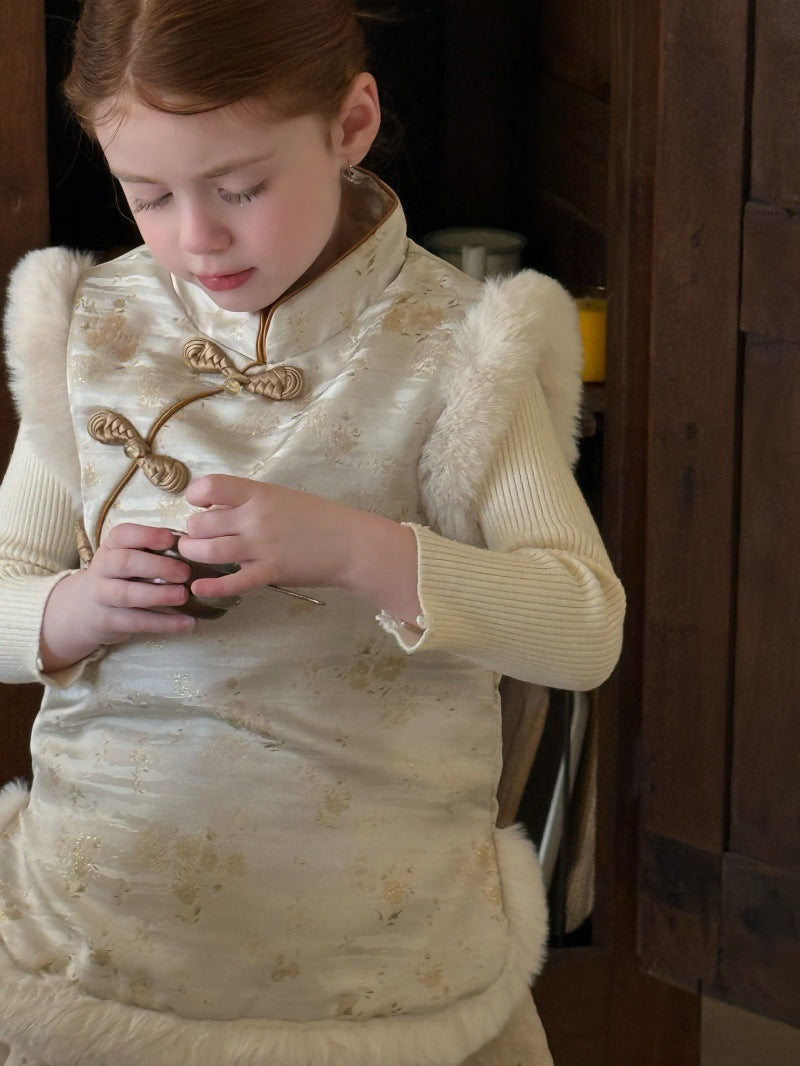 伝統的な装飾を施したチャイナスタイルのデザインが特徴的な、ボアファー素材の防寒ベストです。中綿を入れた厚みのある生地に、柔らかなファーの質感を組み合わせることで、高い保温性と上品なレトロな風合いを両立しています。首元の立ち襟やフロントのボタンが東洋的なアクセントになり、ブラウスやニットの上に重ねるだけで、洗練された文学的なテイストを演出します。新年のお祝いや特別な行事から日常の外出まで幅広く対応し、機能性とデザイン性を兼ね備えた子供服のノースリーブアウターです。