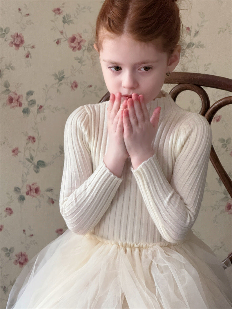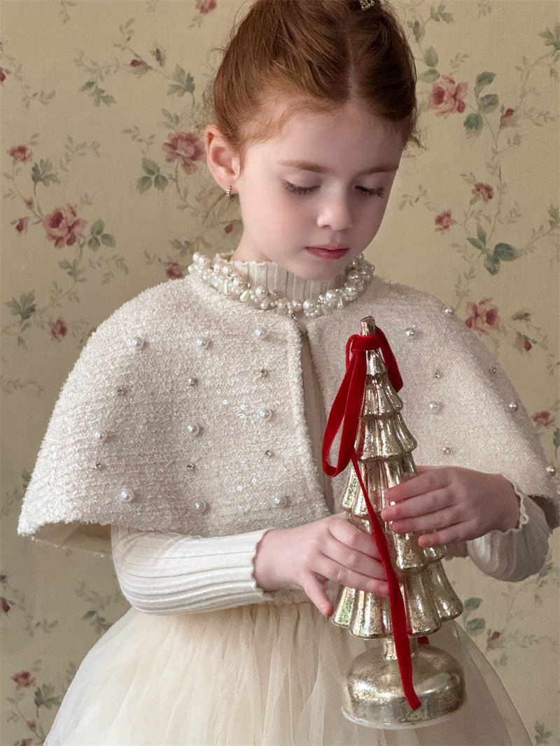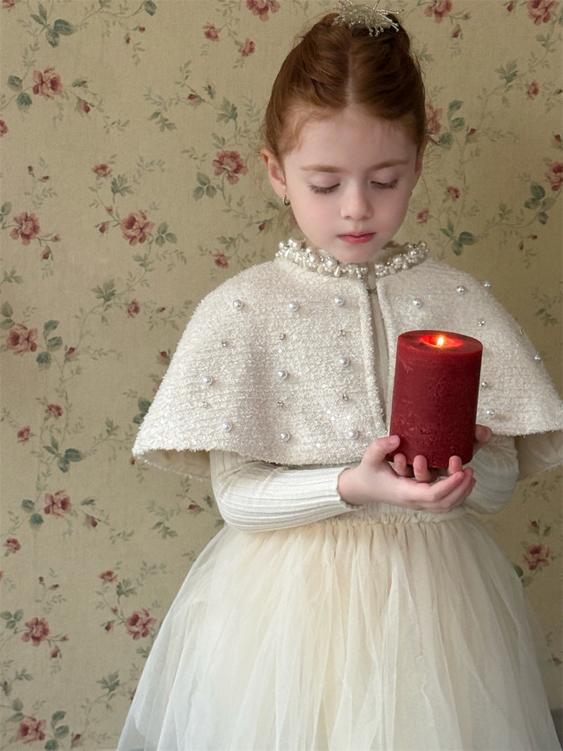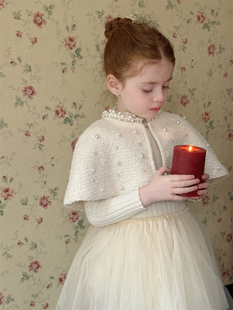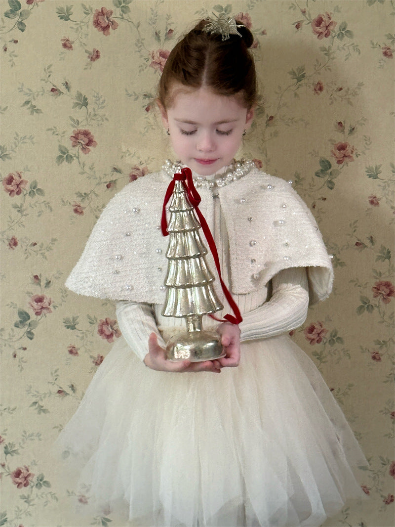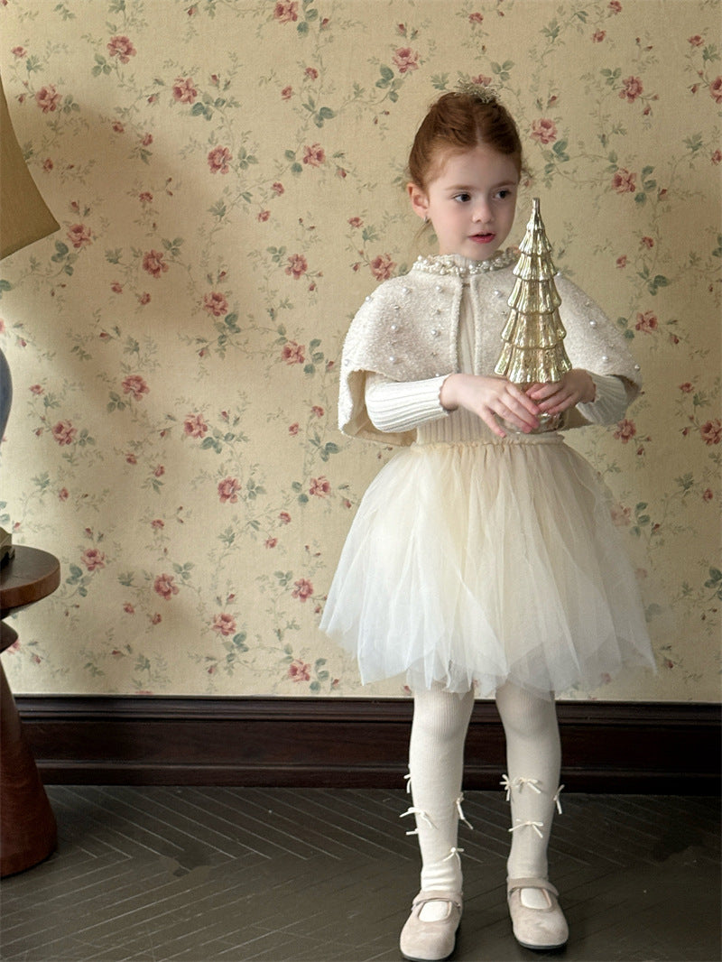 繊細なパール刺繍を贅沢にあしらったショールケープと、長袖のニットトップスにふんわりとしたチュチュスカートを組み合わせた、ハイエンドな雰囲気漂うセットアップです。身頃には暖かなセーター素材を使用し、スカート部分に幾重にも重なるメッシュを配することで、バレリーナのような華やかなボリューム感を演出しています。パールが上品に煌めくボレロ風のケープがセット着用可能で、誕生日会やパーティなどの特別な日を彩るプリンセスドレスとして、冬の行事にふさわしい防寒性と格調高い装飾性を両立したセットアップです。