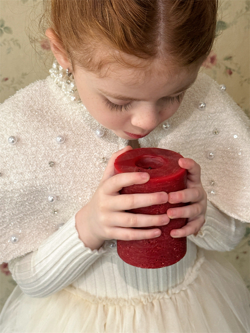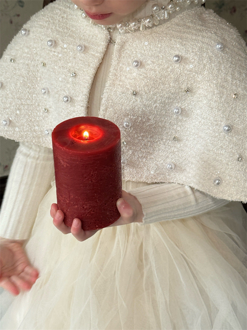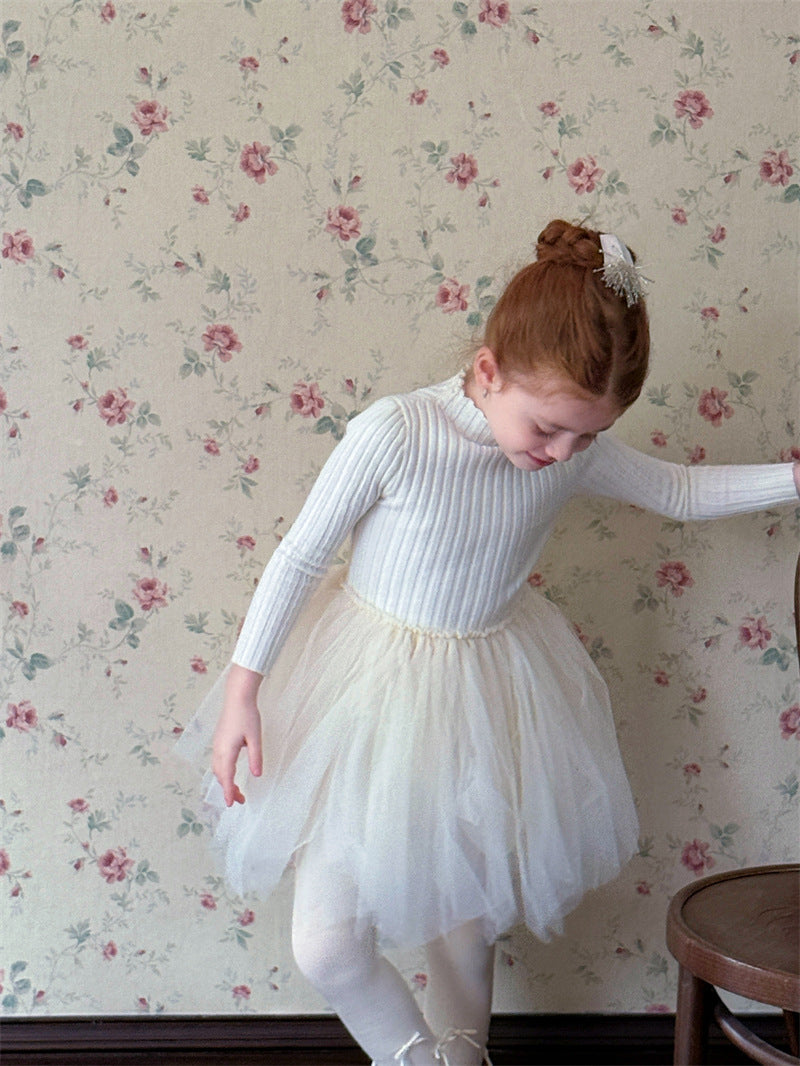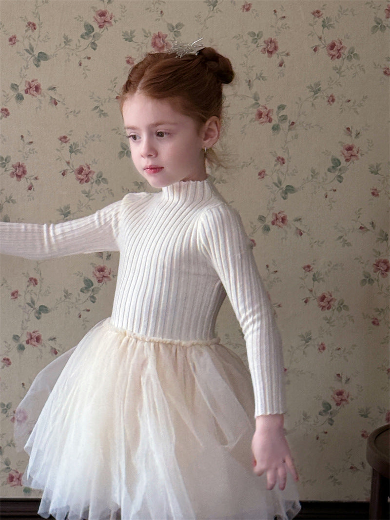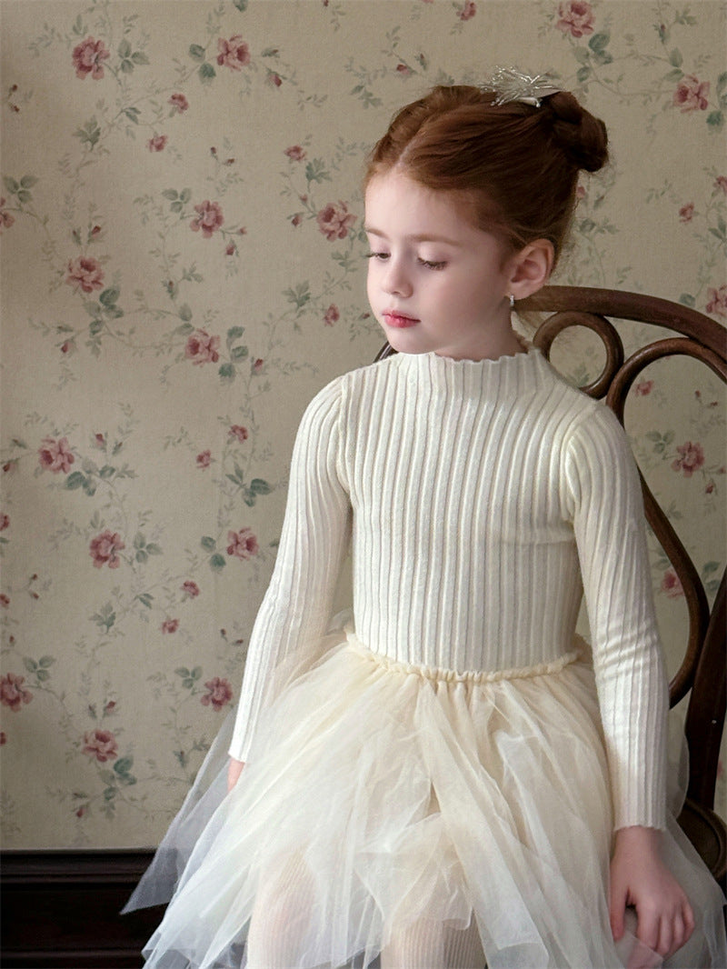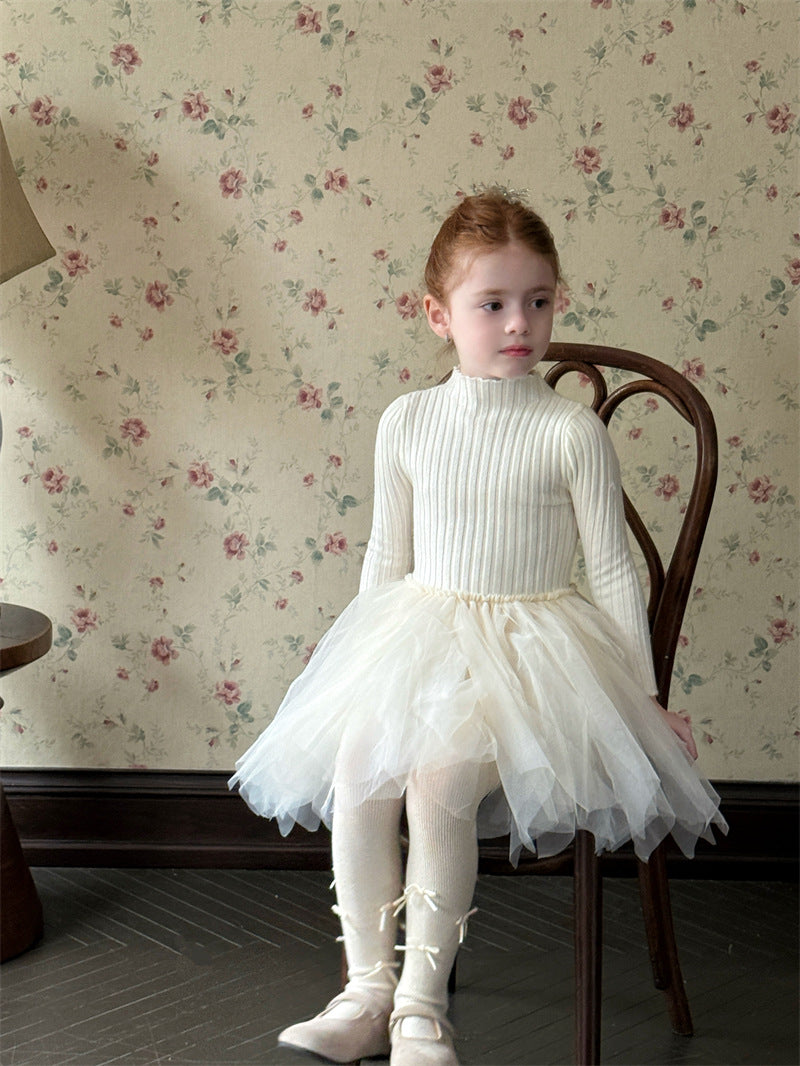 繊細なパール刺繍を贅沢にあしらったショールケープと、長袖のニットトップスにふんわりとしたチュチュスカートを組み合わせた、ハイエンドな雰囲気漂うセットアップです。身頃には暖かなセーター素材を使用し、スカート部分に幾重にも重なるメッシュを配することで、バレリーナのような華やかなボリューム感を演出しています。パールが上品に煌めくボレロ風のケープがセット着用可能で、誕生日会やパーティなどの特別な日を彩るプリンセスドレスとして、冬の行事にふさわしい防寒性と格調高い装飾性を両立したセットアップです。