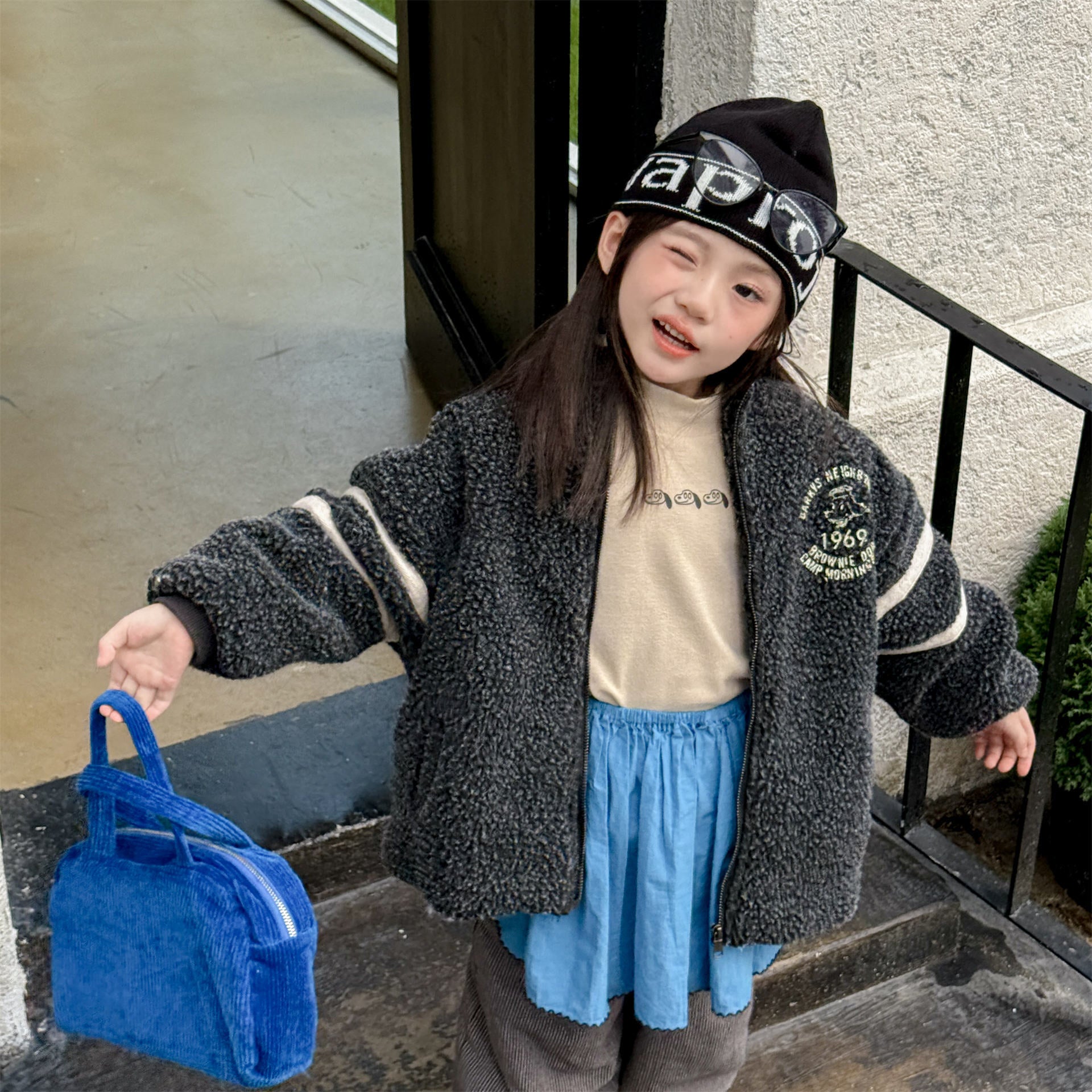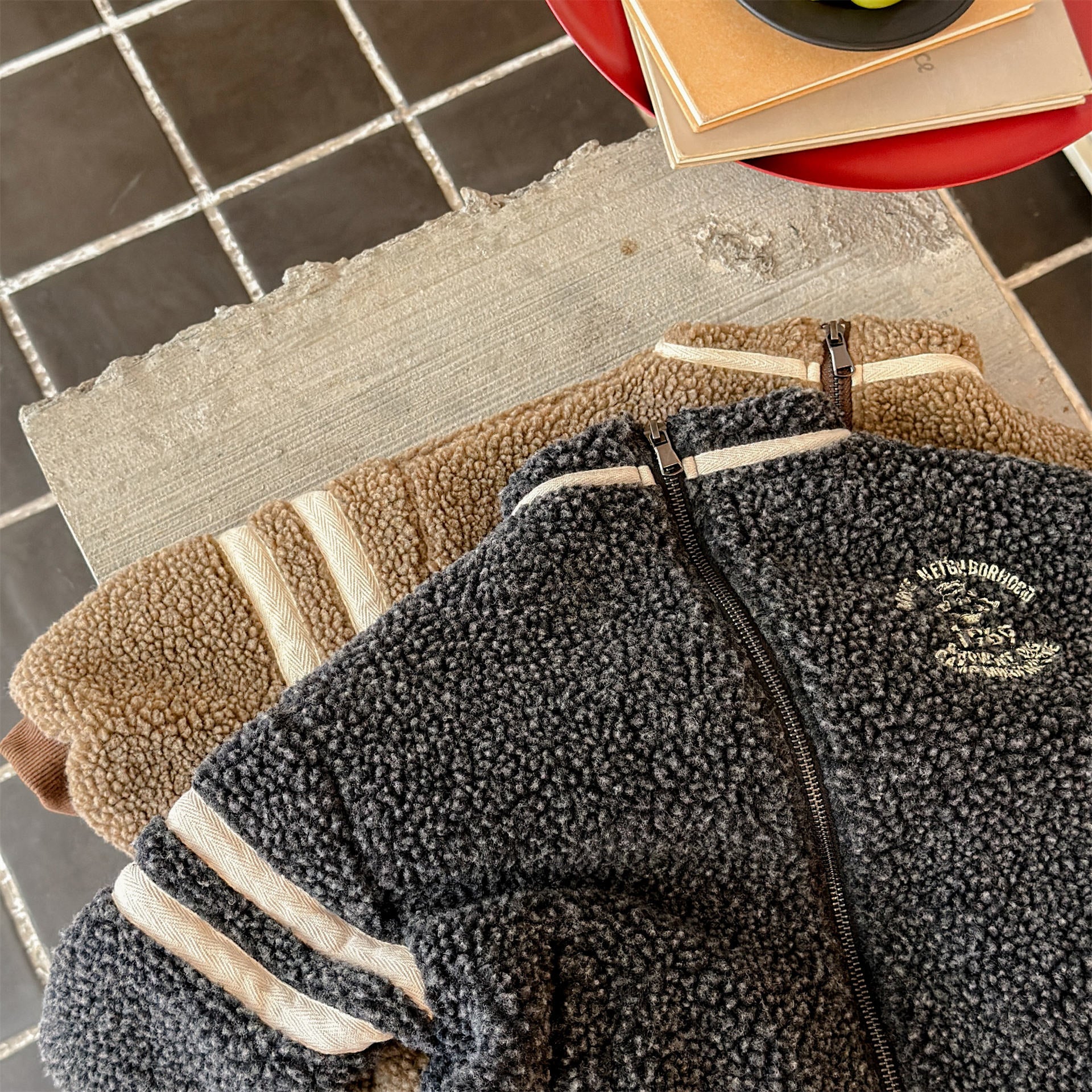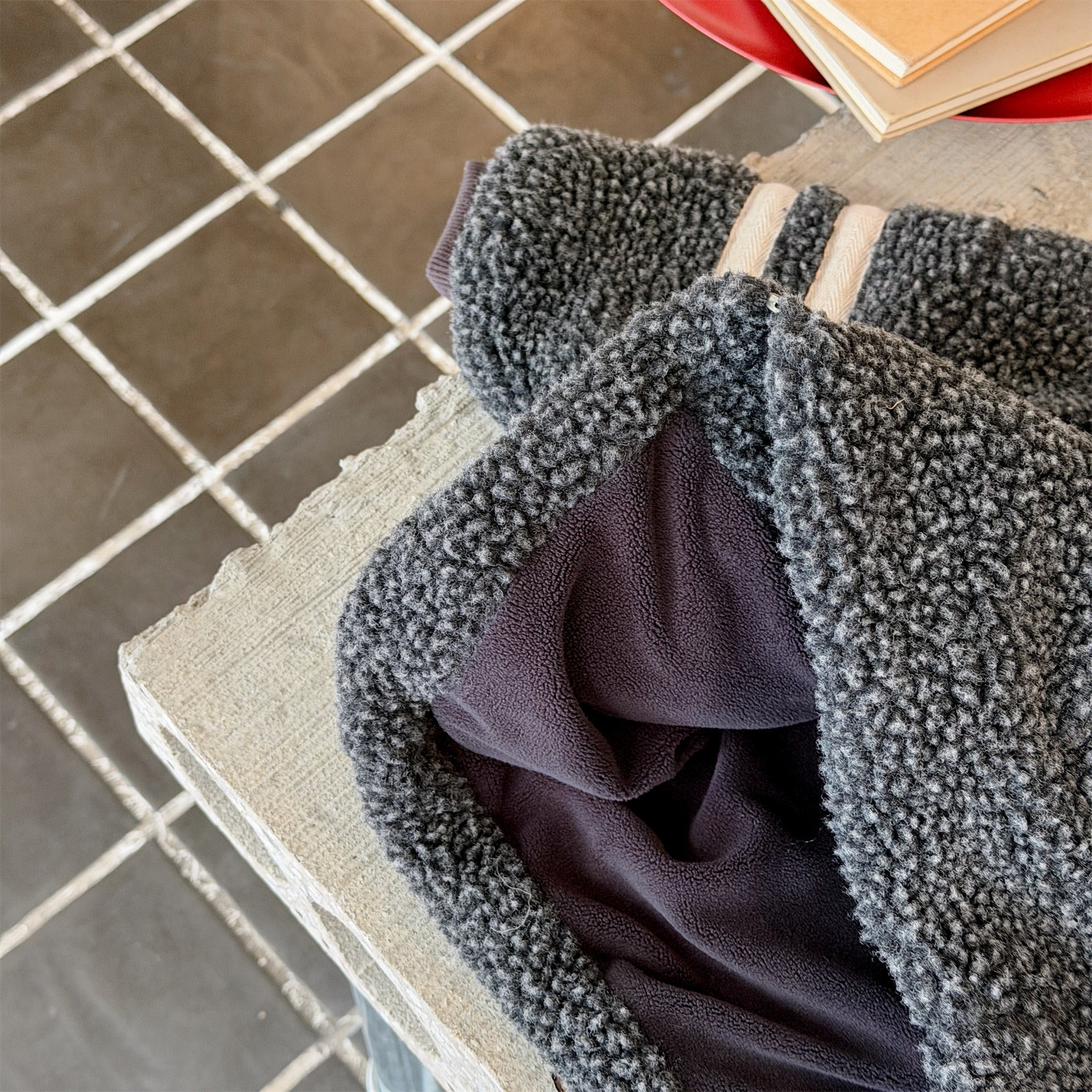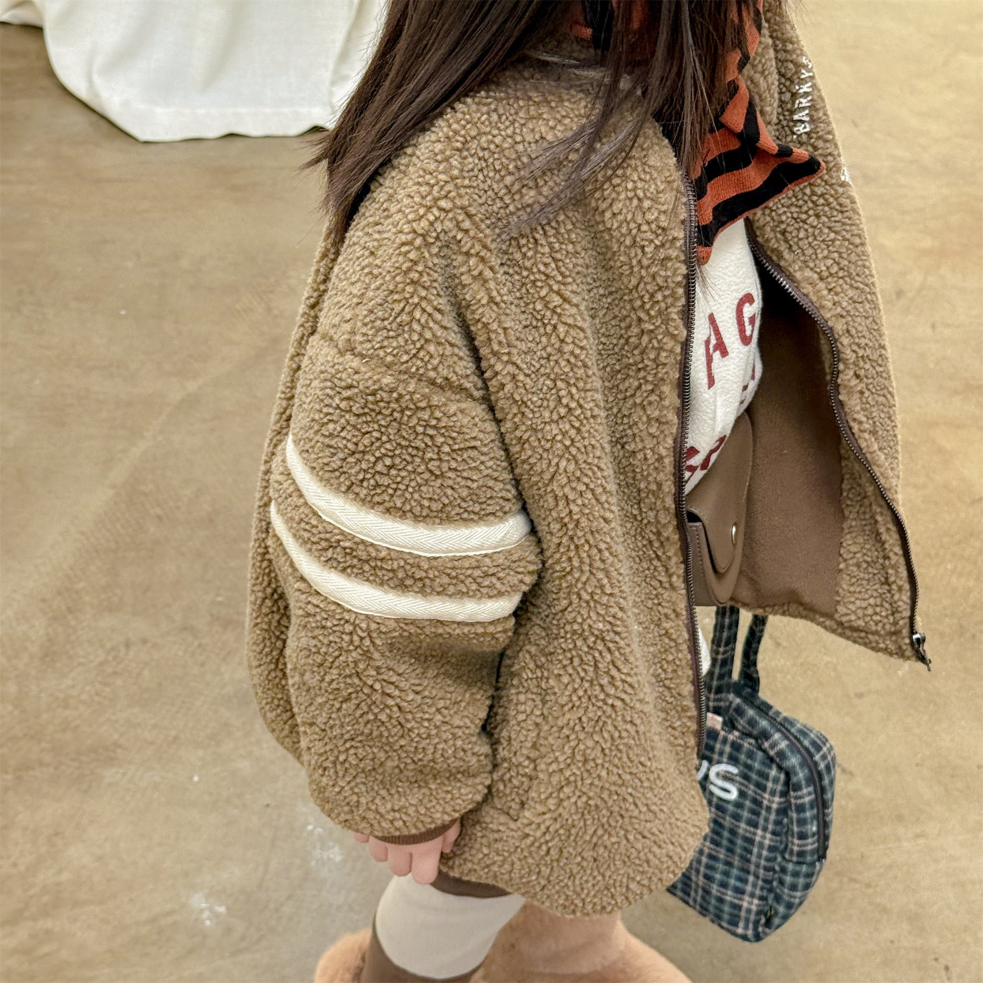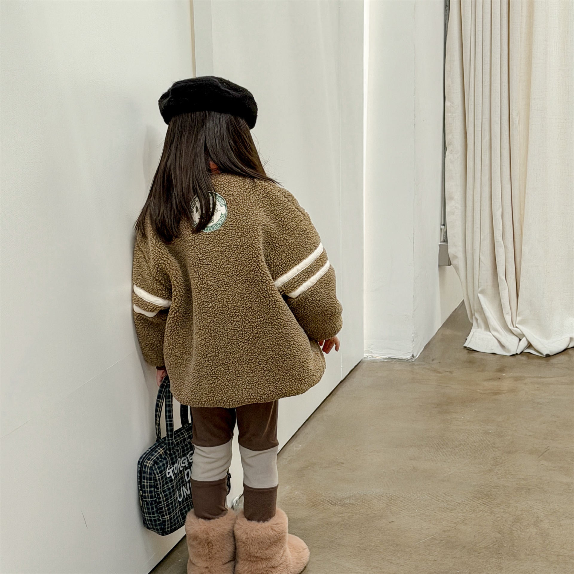 柔らかなラムフリース素材を贅沢に使用した、ジップアップ仕様のボアブルゾンです。袖にあしらわれたダブルラインのアクセントがスポーティーな印象を与え、しっかりとした厚みのあるボア生地が冬の冷たい空気からお子様を暖かく守ります。男の子にも女の子にも似合うユニセックスなデザインで、身頃には中綿を封入することでさらに保温性を高めており、日常の通学や屋外でのアクティブなシーンにも最適です。トレンド感のあるボリュームシルエットと実用的な防寒性を兼ね備えた、冬のワードローブに欠かせない一着です。