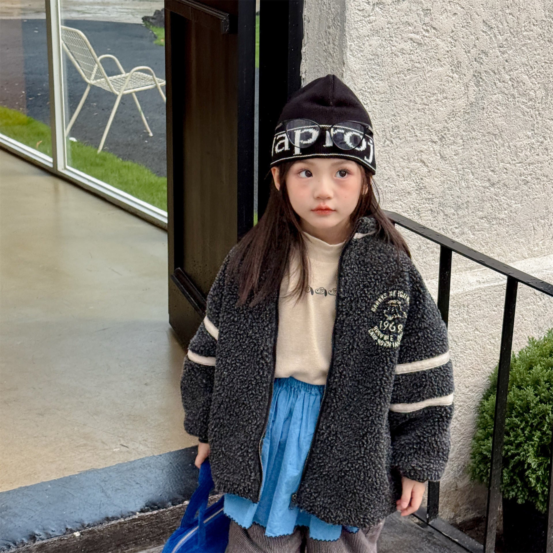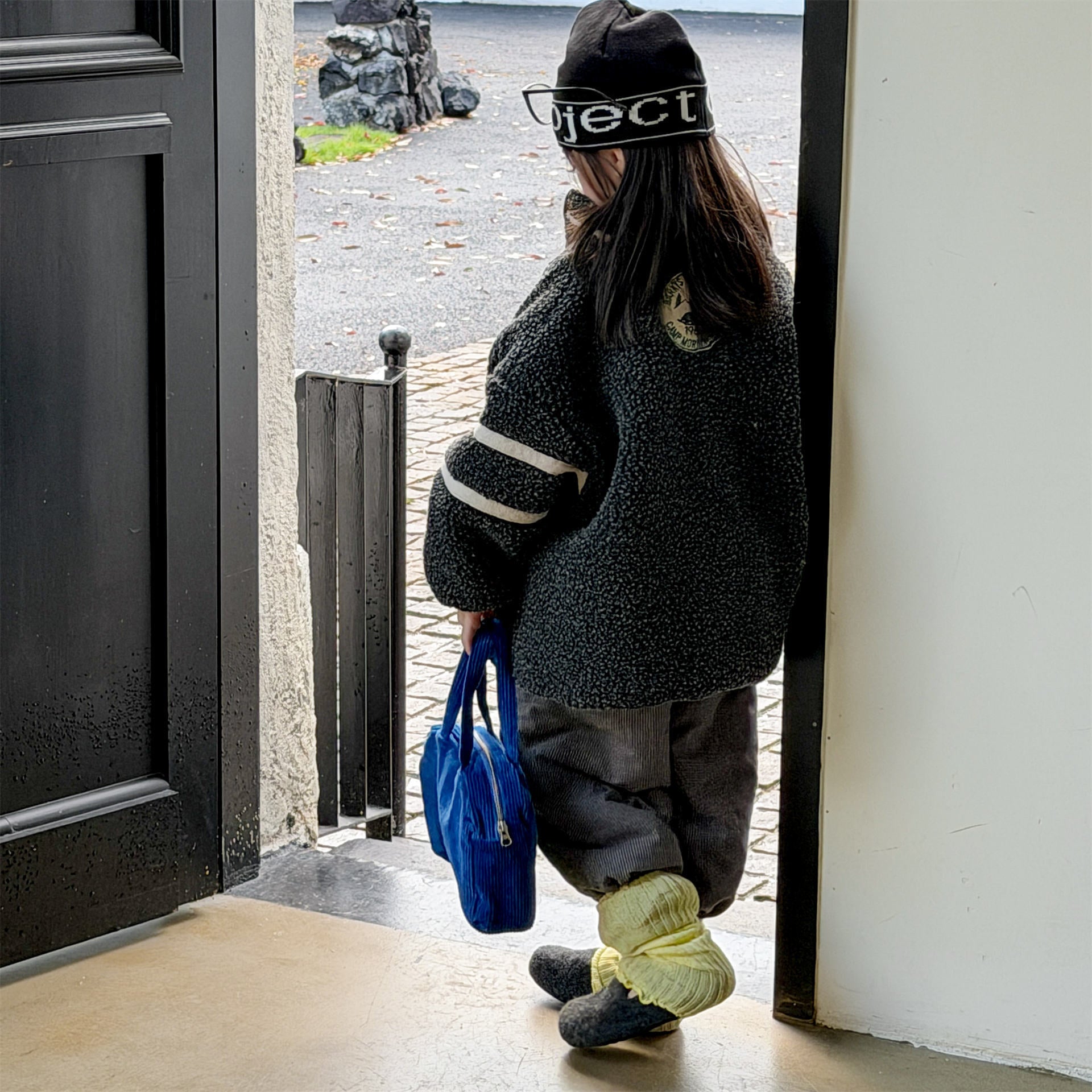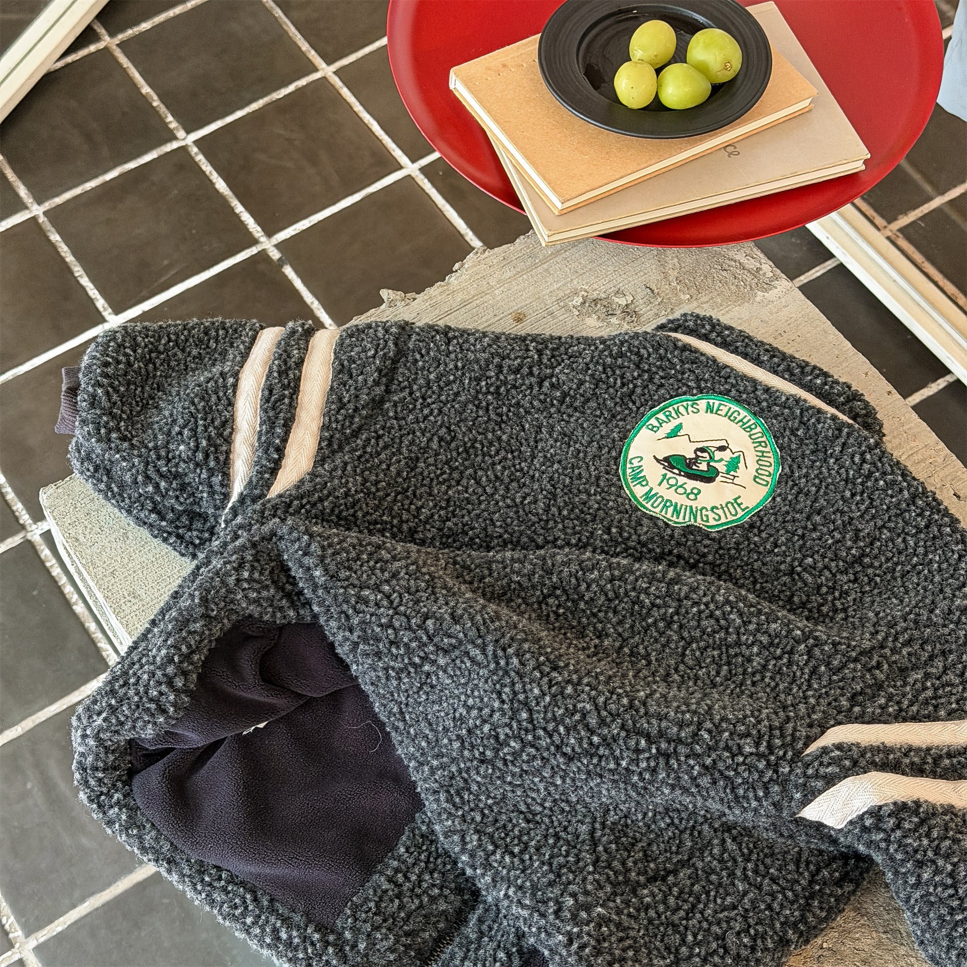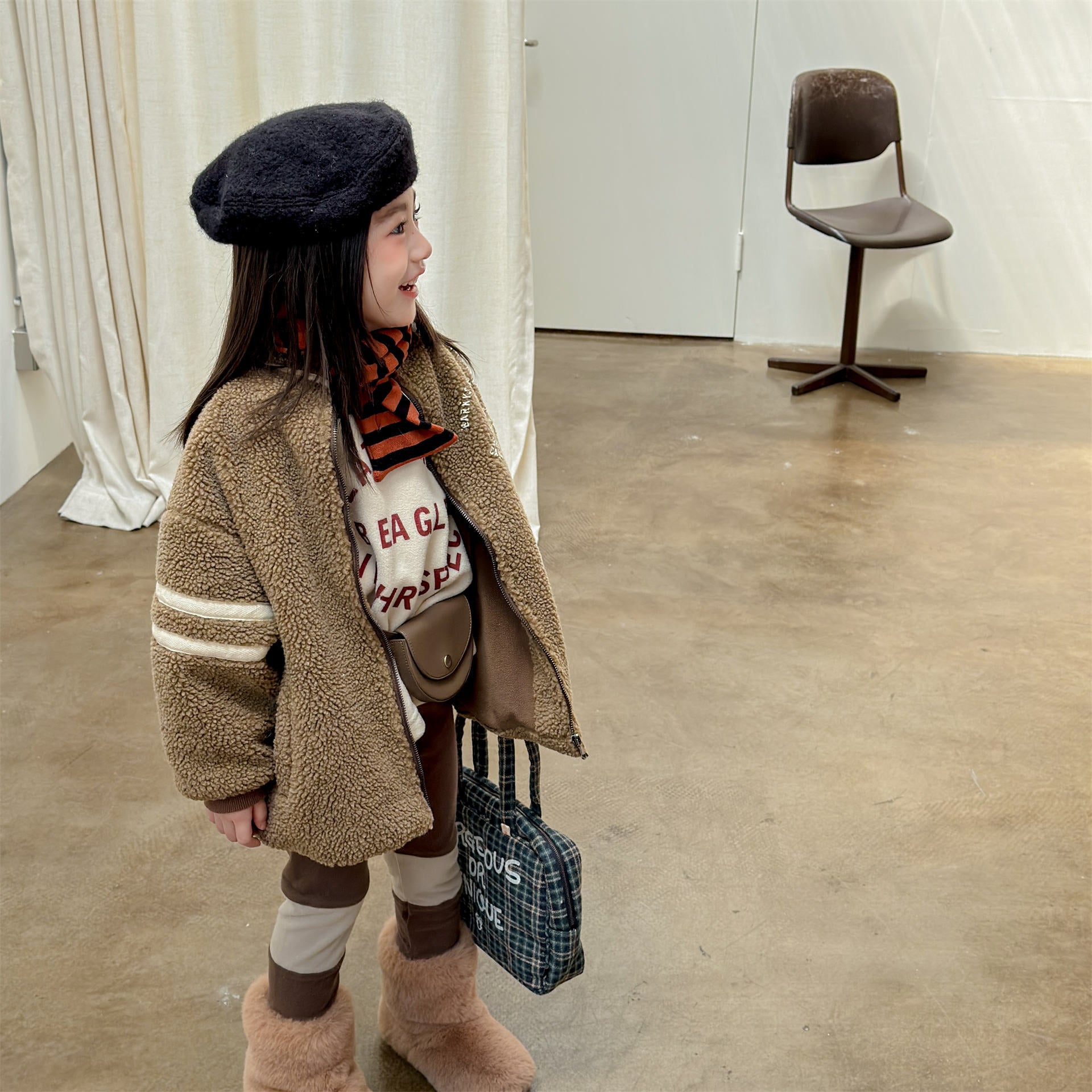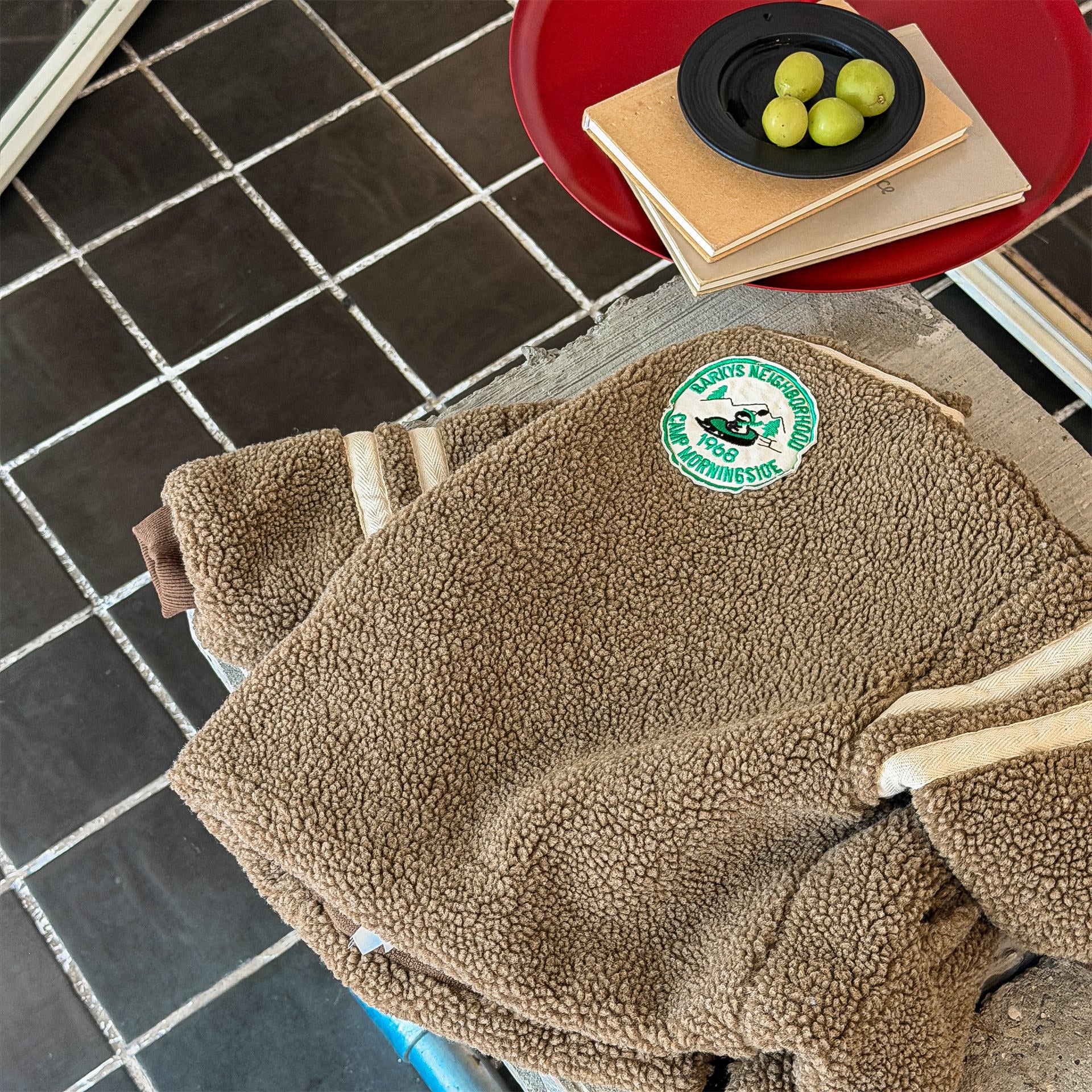 柔らかなラムフリース素材を贅沢に使用した、ジップアップ仕様のボアブルゾンです。袖にあしらわれたダブルラインのアクセントがスポーティーな印象を与え、しっかりとした厚みのあるボア生地が冬の冷たい空気からお子様を暖かく守ります。男の子にも女の子にも似合うユニセックスなデザインで、身頃には中綿を封入することでさらに保温性を高めており、日常の通学や屋外でのアクティブなシーンにも最適です。トレンド感のあるボリュームシルエットと実用的な防寒性を兼ね備えた、冬のワードローブに欠かせない一着です。