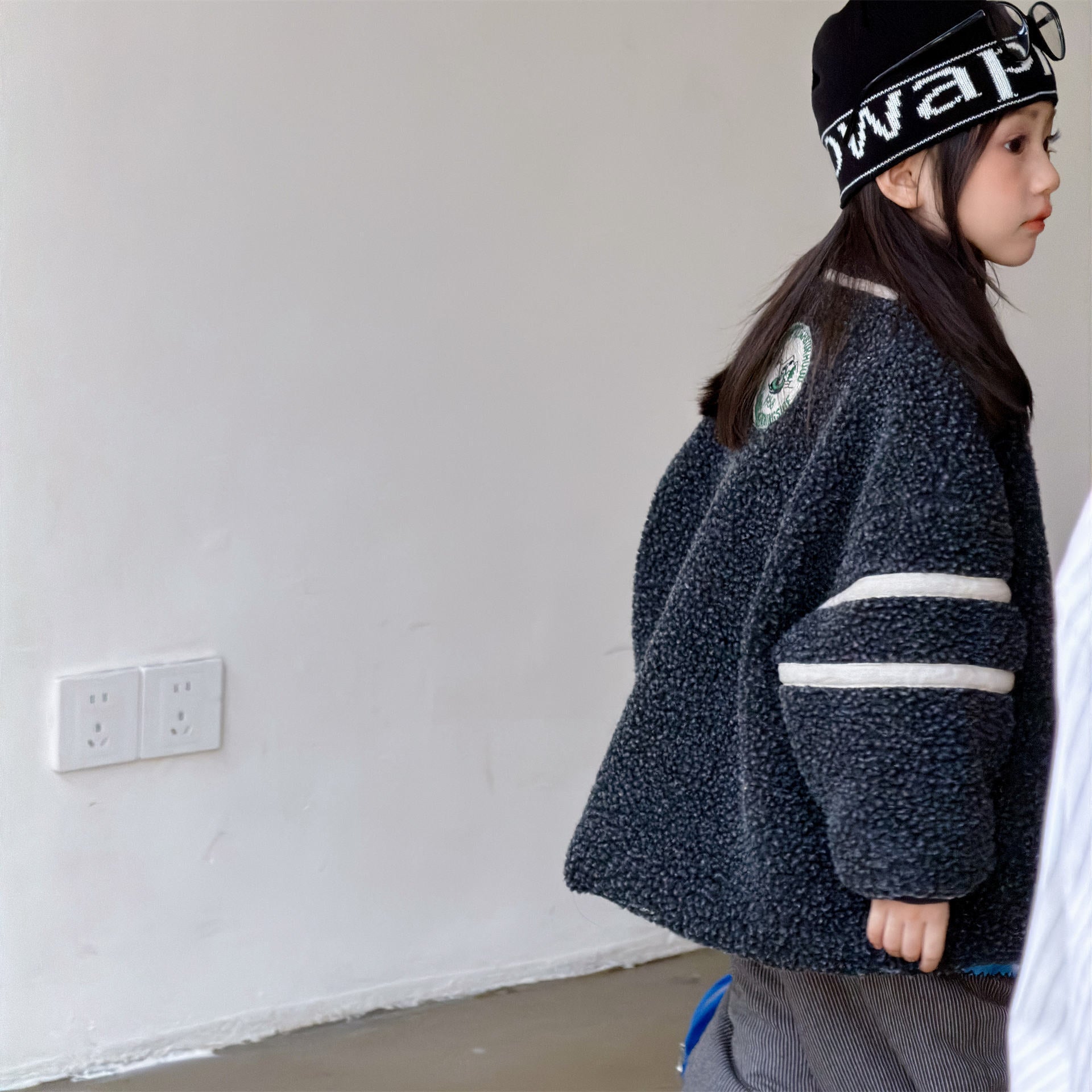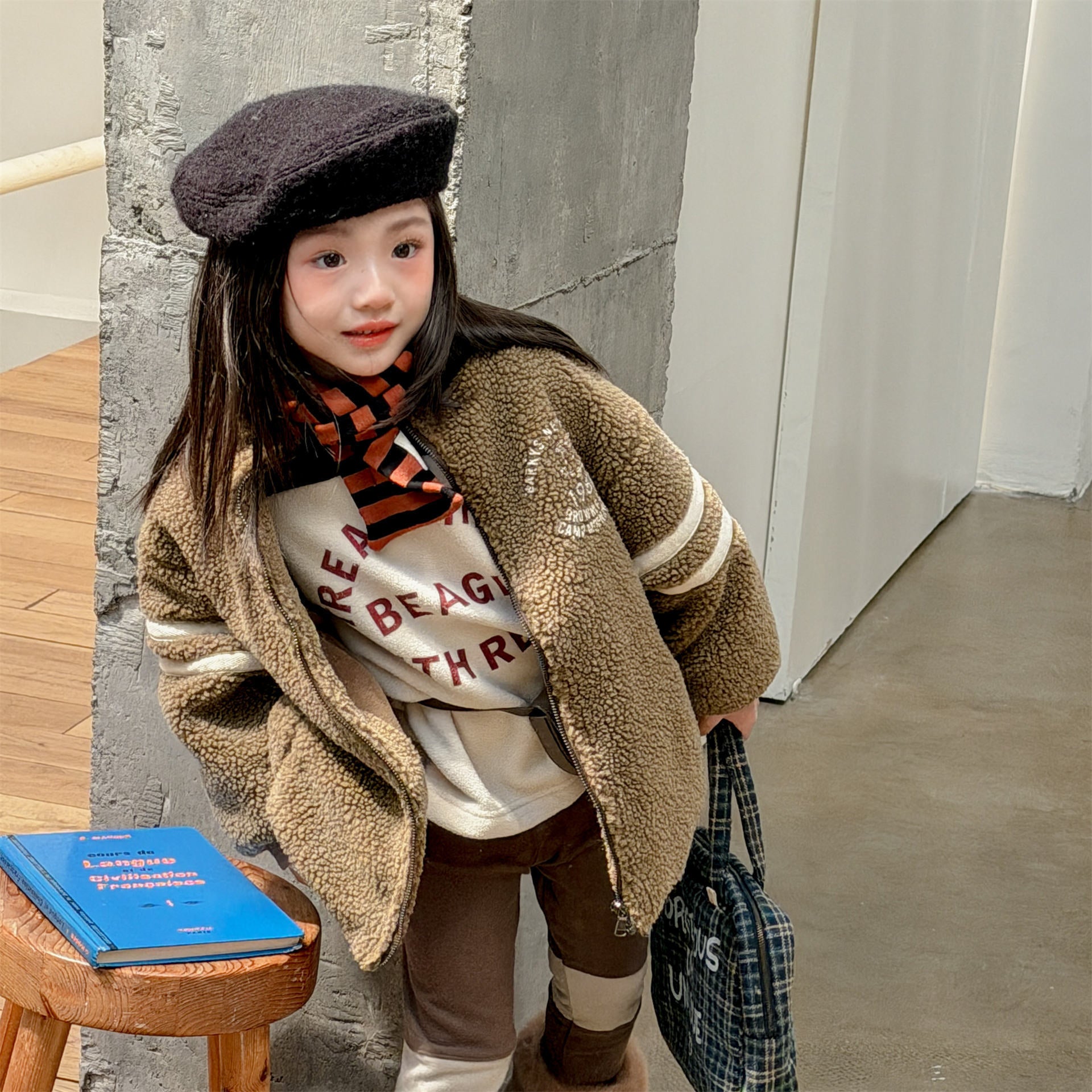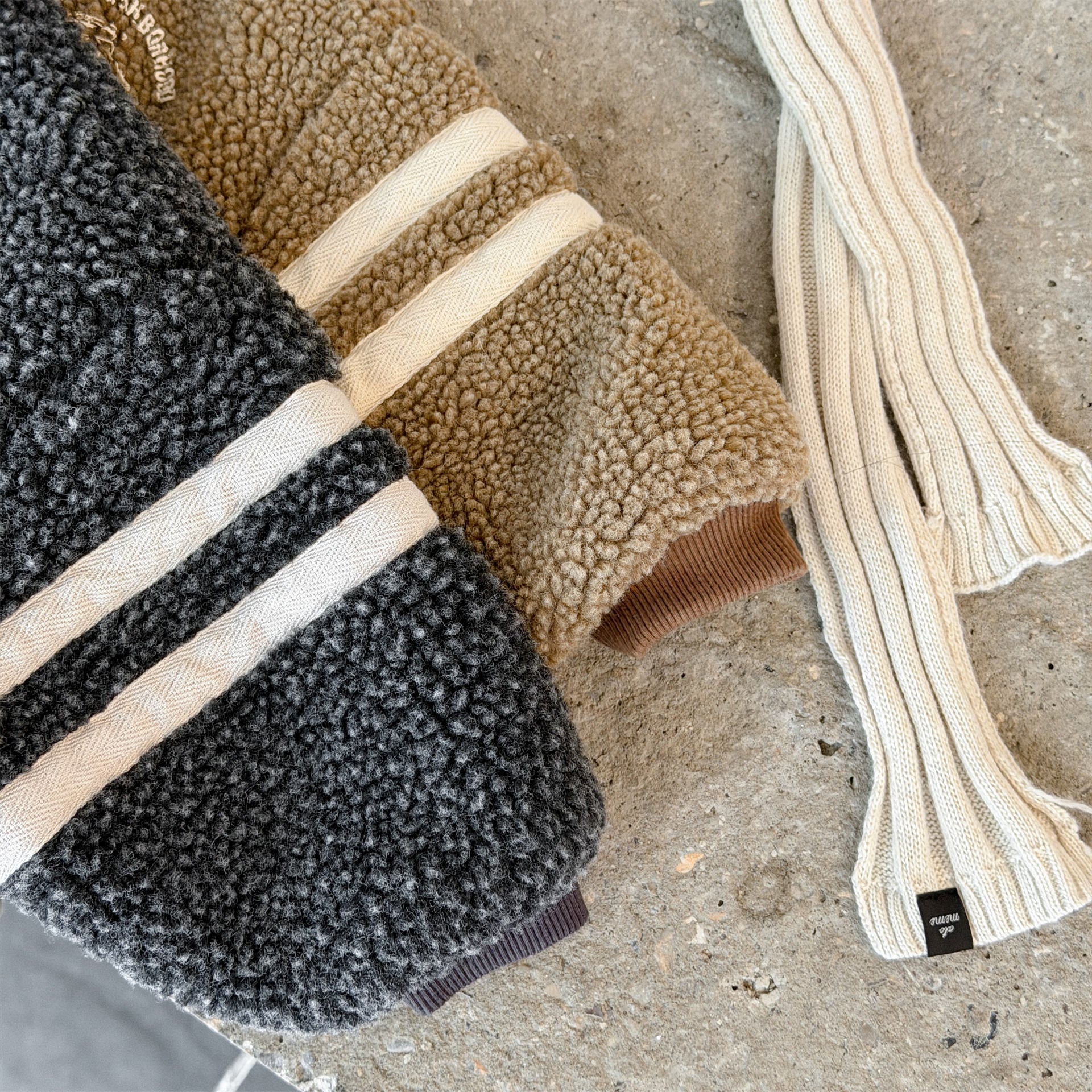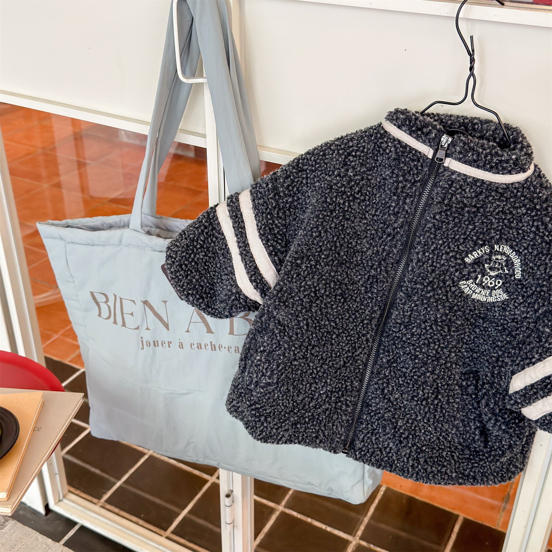 柔らかなラムフリース素材を贅沢に使用した、ジップアップ仕様のボアブルゾンです。袖にあしらわれたダブルラインのアクセントがスポーティーな印象を与え、しっかりとした厚みのあるボア生地が冬の冷たい空気からお子様を暖かく守ります。男の子にも女の子にも似合うユニセックスなデザインで、身頃には中綿を封入することでさらに保温性を高めており、日常の通学や屋外でのアクティブなシーンにも最適です。トレンド感のあるボリュームシルエットと実用的な防寒性を兼ね備えた、冬のワードローブに欠かせない一着です。