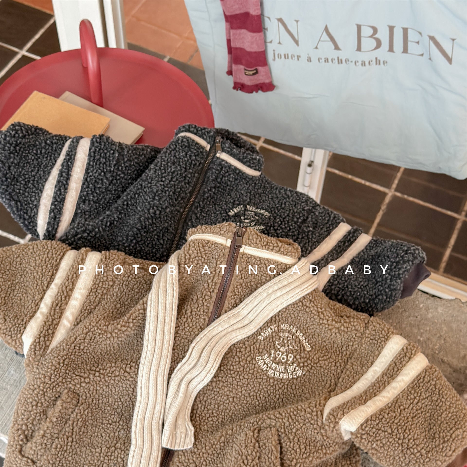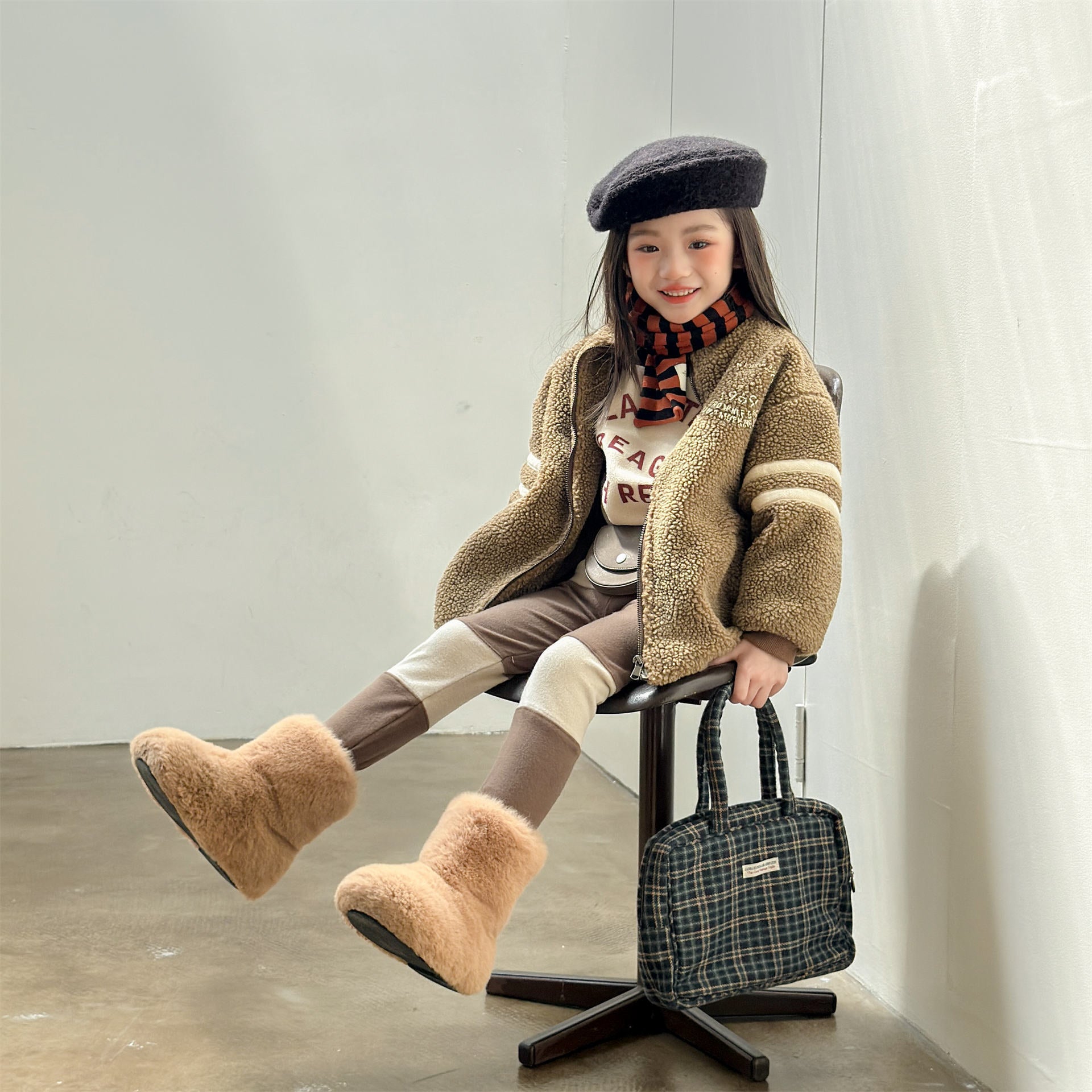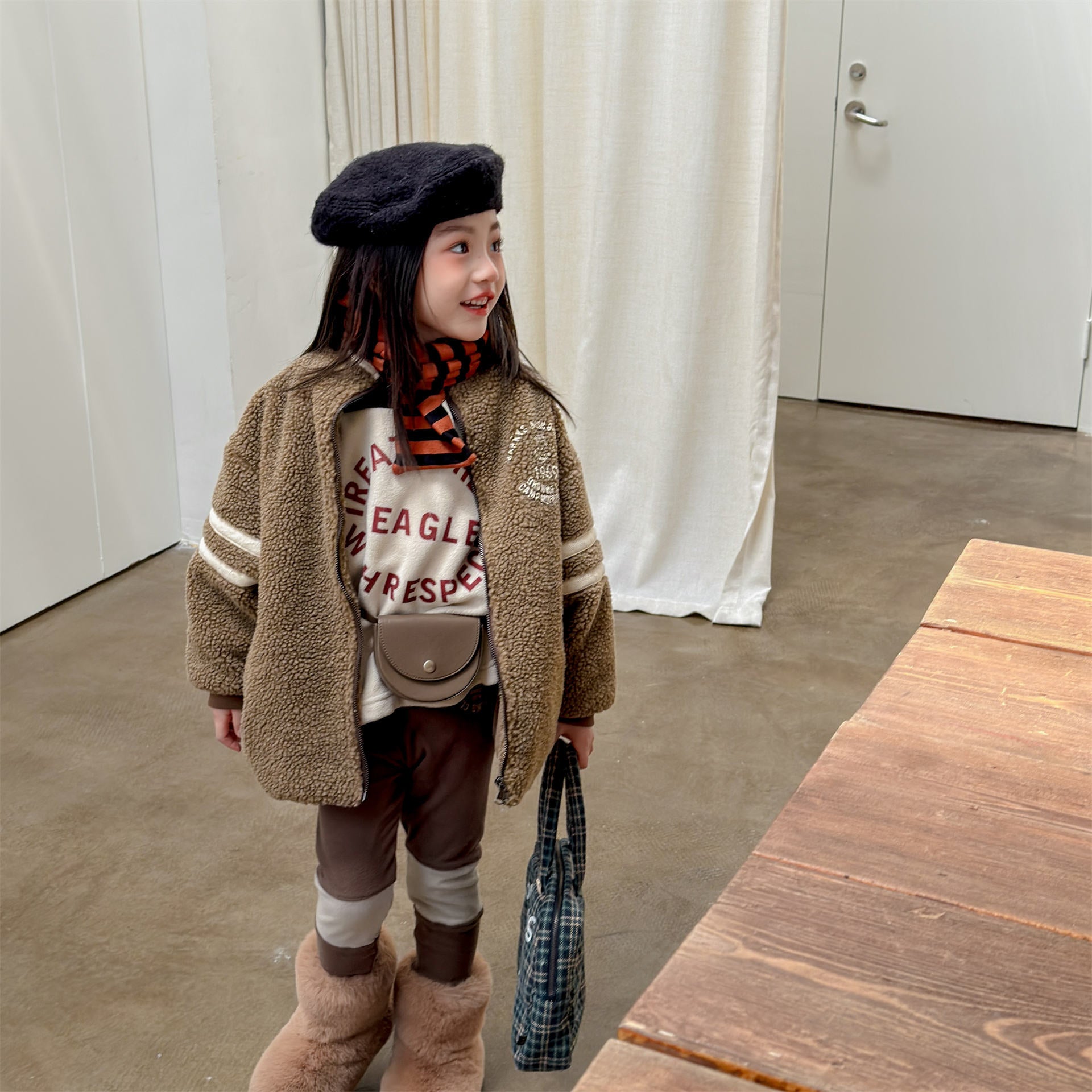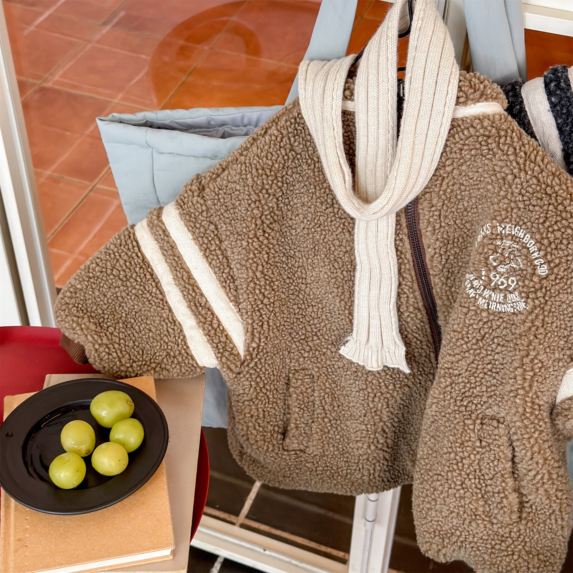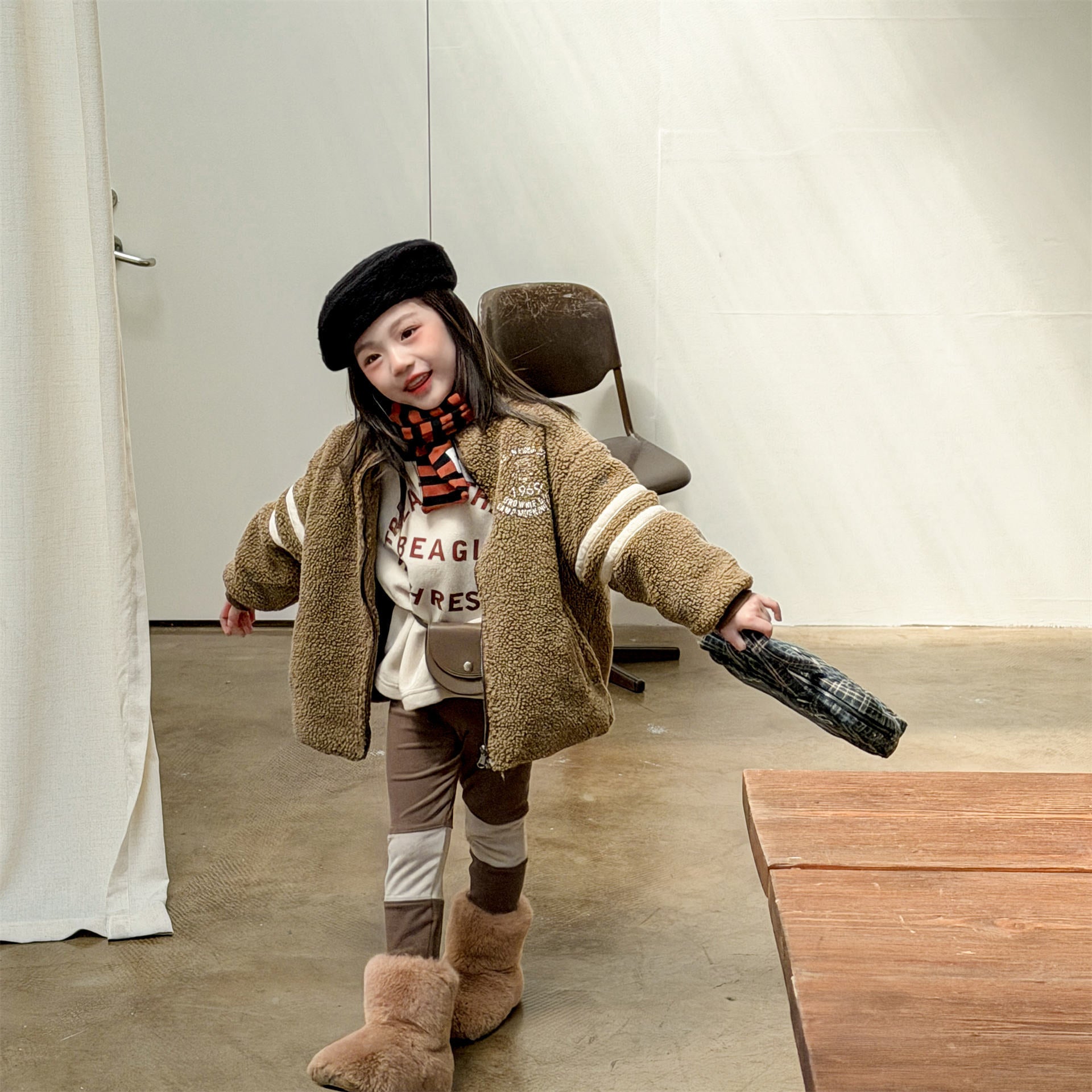 柔らかなラムフリース素材を贅沢に使用した、ジップアップ仕様のボアブルゾンです。袖にあしらわれたダブルラインのアクセントがスポーティーな印象を与え、しっかりとした厚みのあるボア生地が冬の冷たい空気からお子様を暖かく守ります。男の子にも女の子にも似合うユニセックスなデザインで、身頃には中綿を封入することでさらに保温性を高めており、日常の通学や屋外でのアクティブなシーンにも最適です。トレンド感のあるボリュームシルエットと実用的な防寒性を兼ね備えた、冬のワードローブに欠かせない一着です。