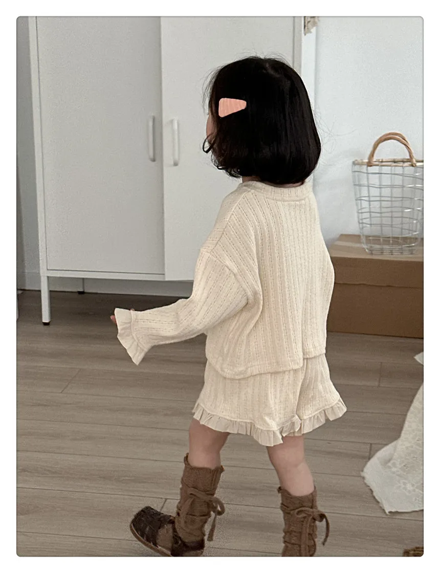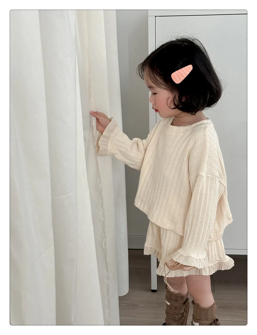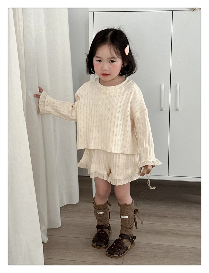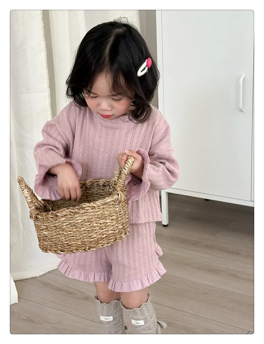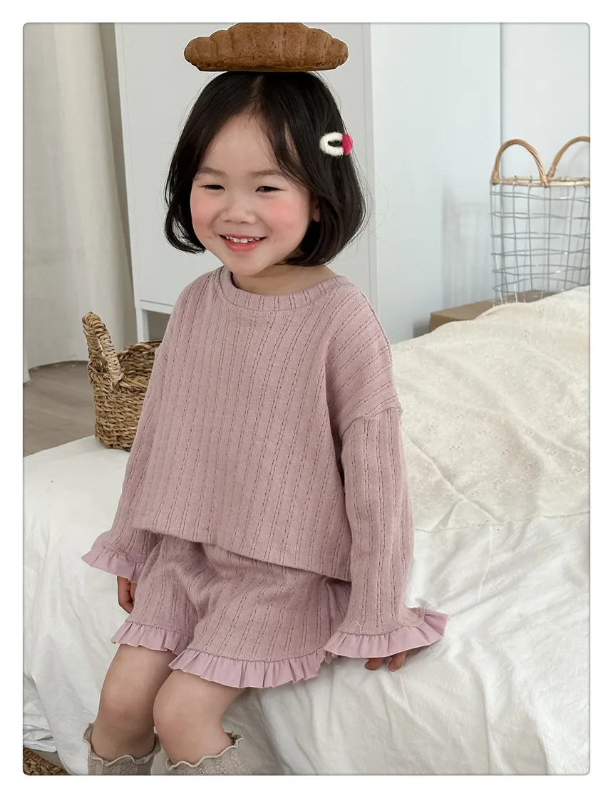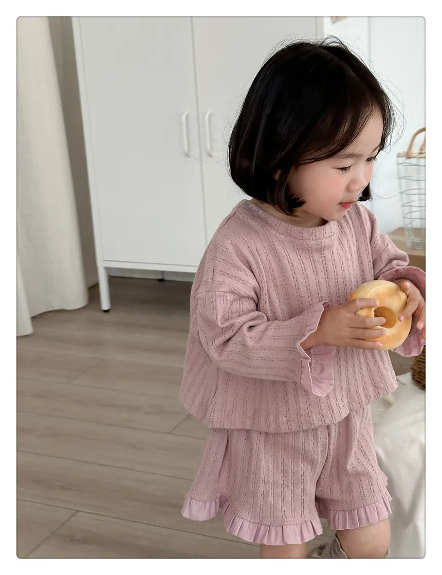 キッズセットアップ 2点セット 長袖Tシャツ ショートパンツ ラッフルフリル ライトパープル/ベージュ/2カラー