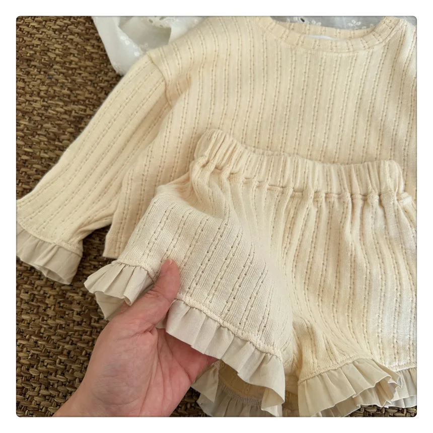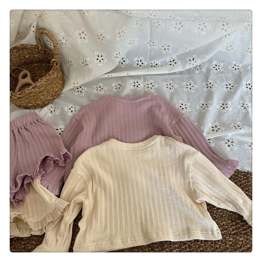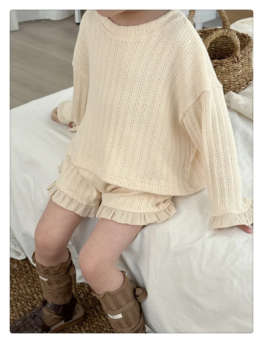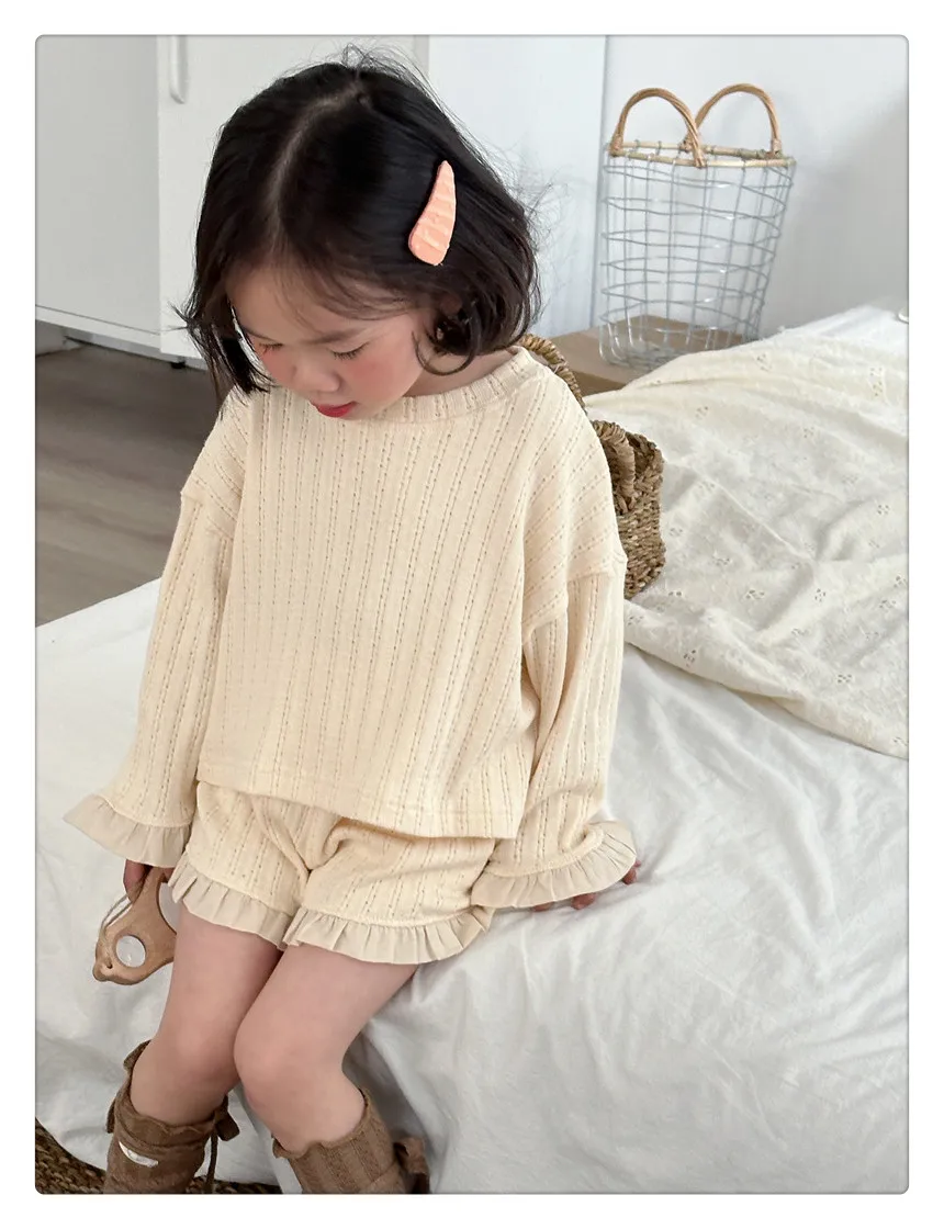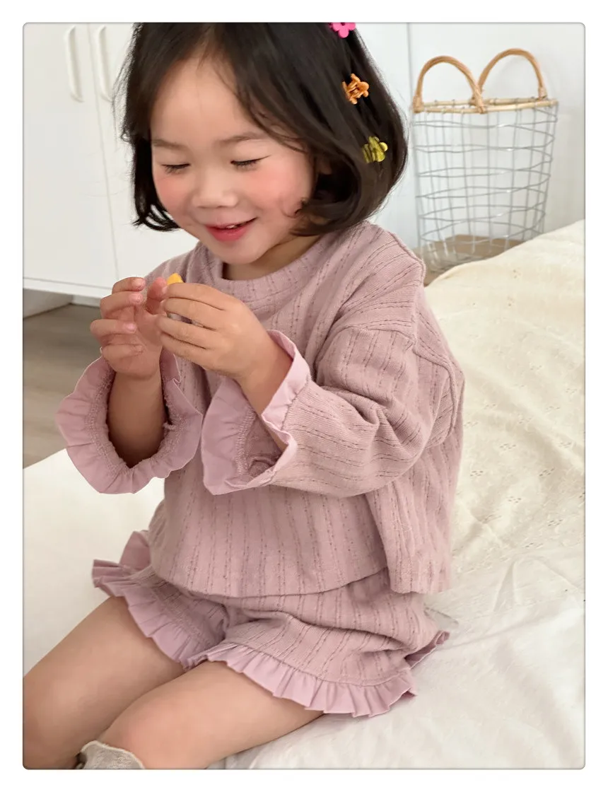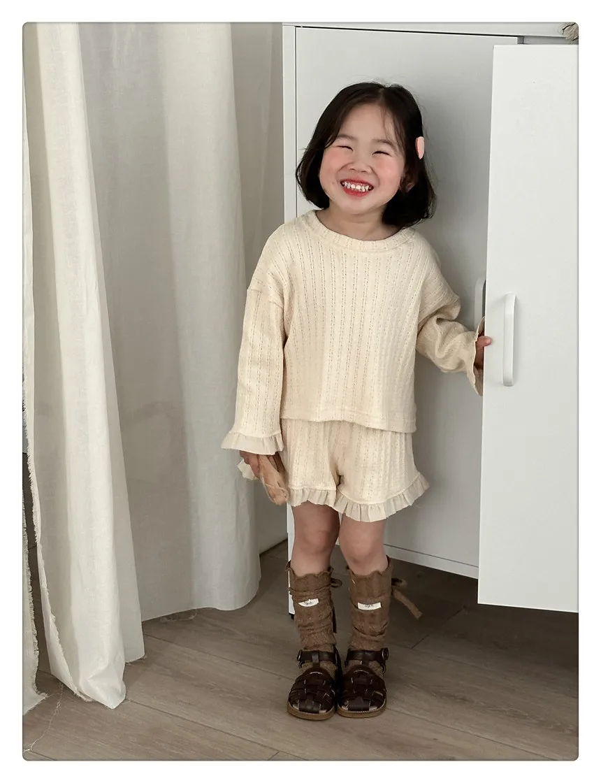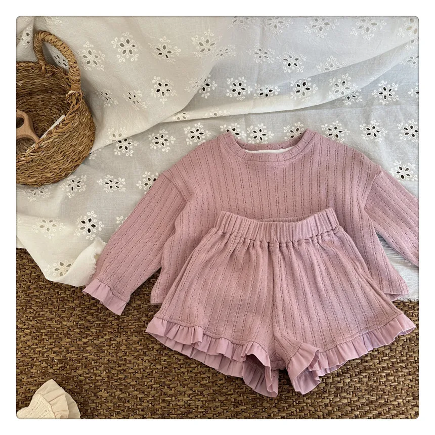 キッズセットアップ 2点セット 長袖Tシャツ ショートパンツ ラッフルフリル ライトパープル/ベージュ/2カラー