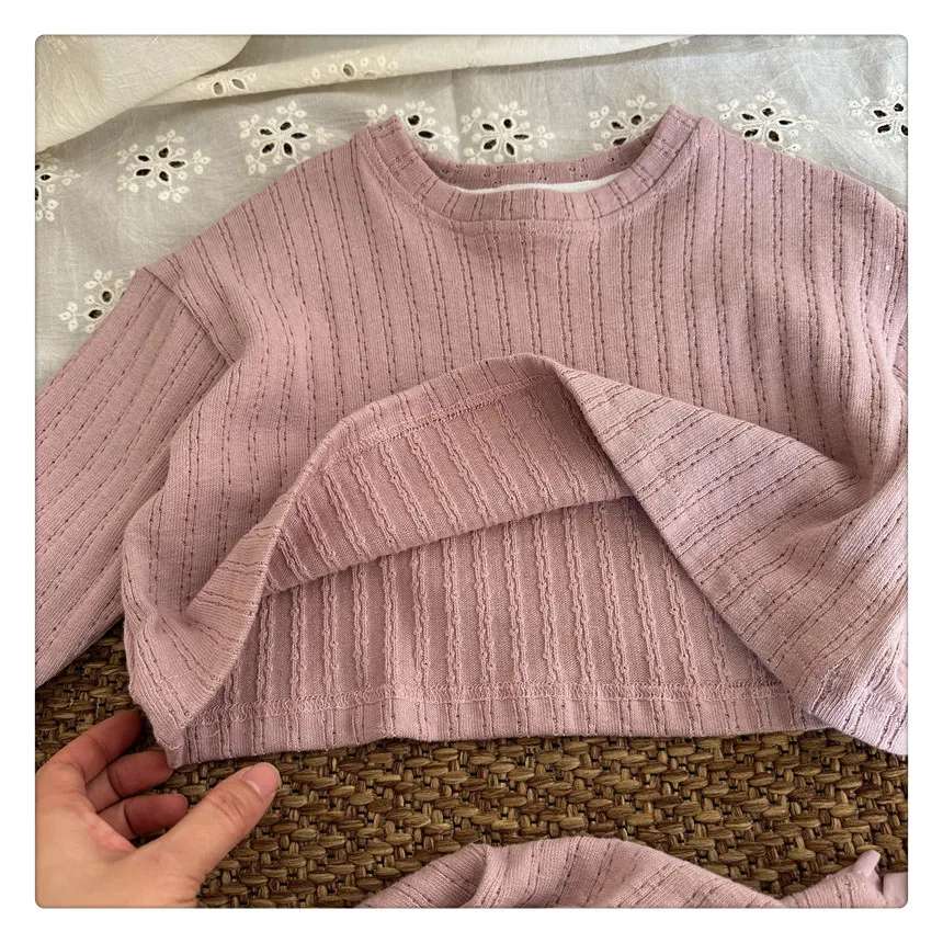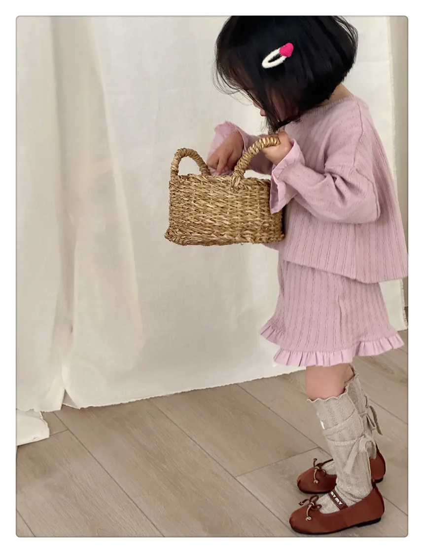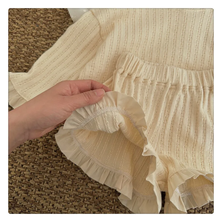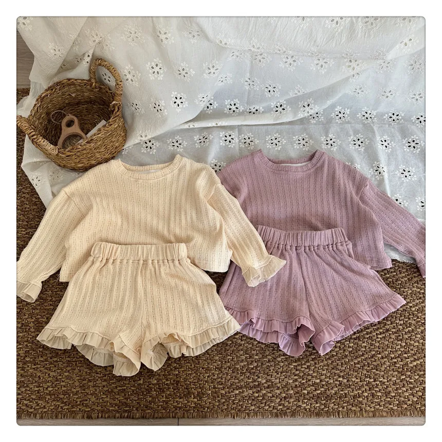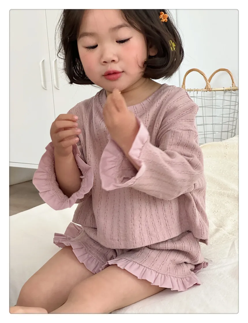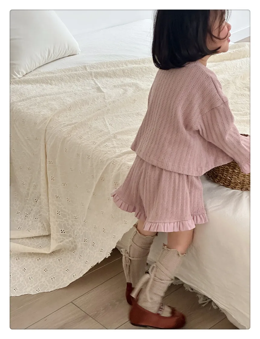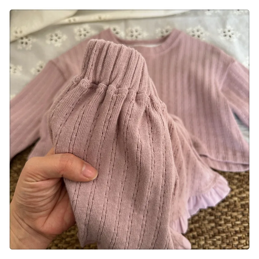 キッズセットアップ 2点セット 長袖Tシャツ ショートパンツ ラッフルフリル ライトパープル/ベージュ/2カラー