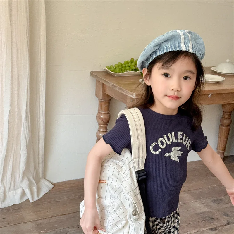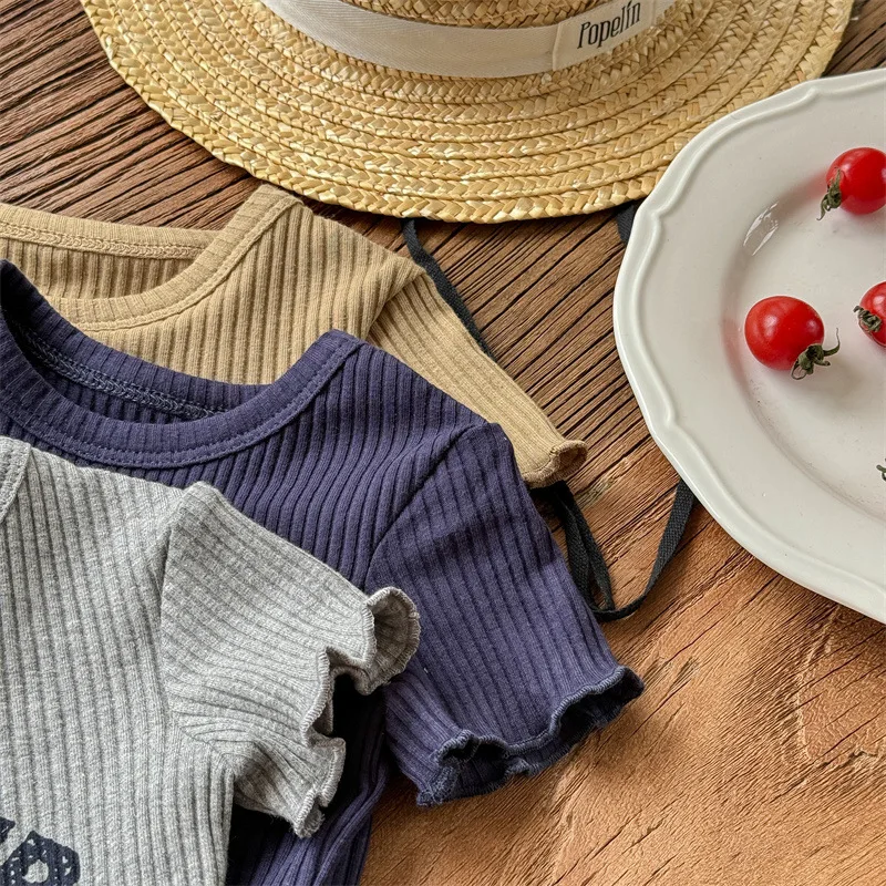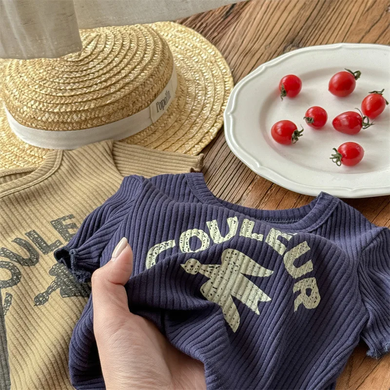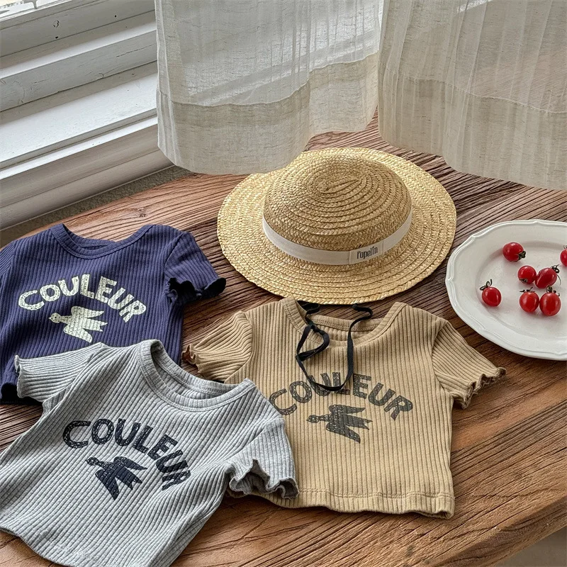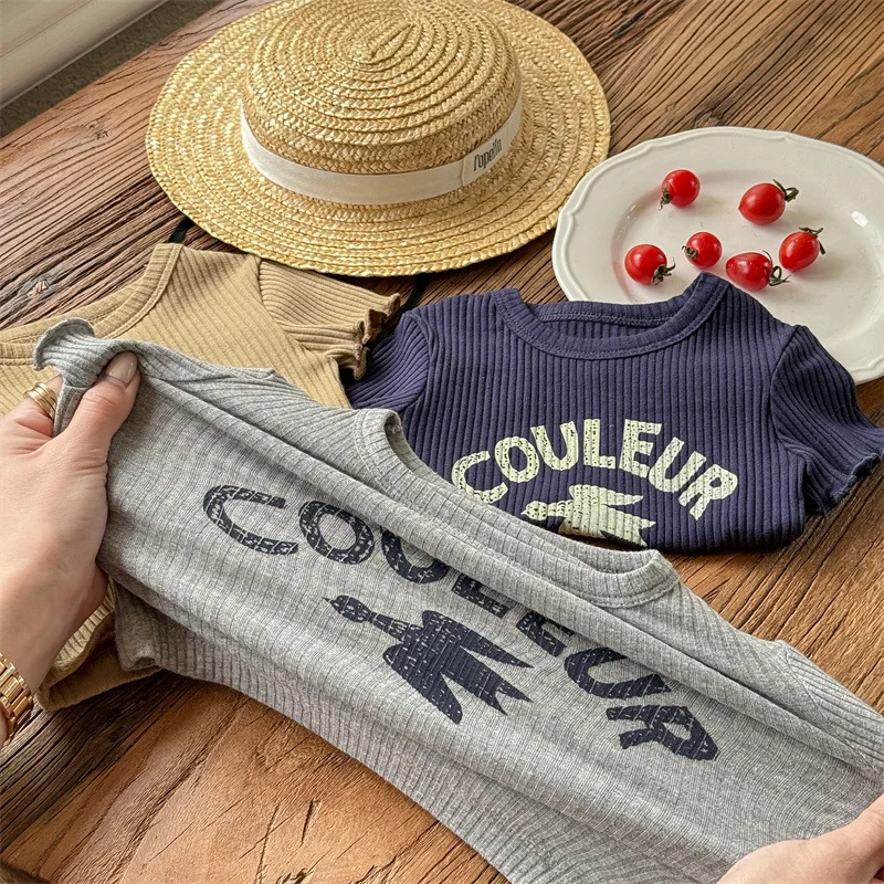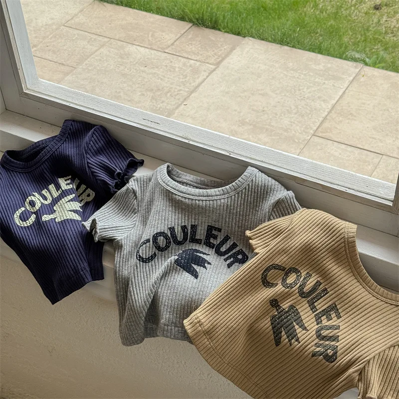 キッズトップス 半袖リブTシャツ レターロゴプリント 3カラー
