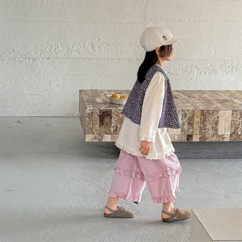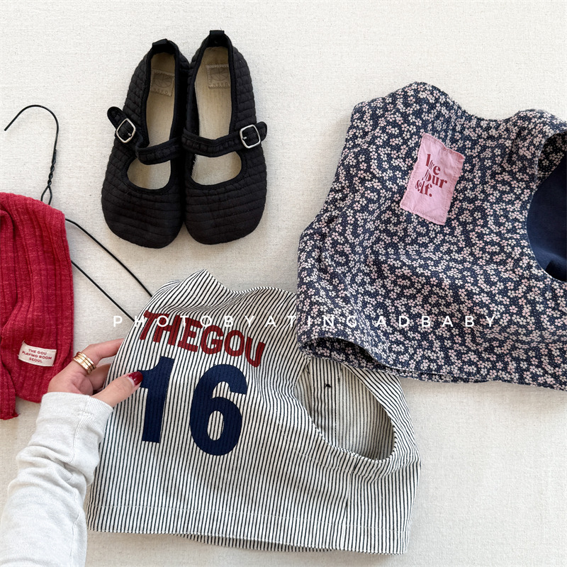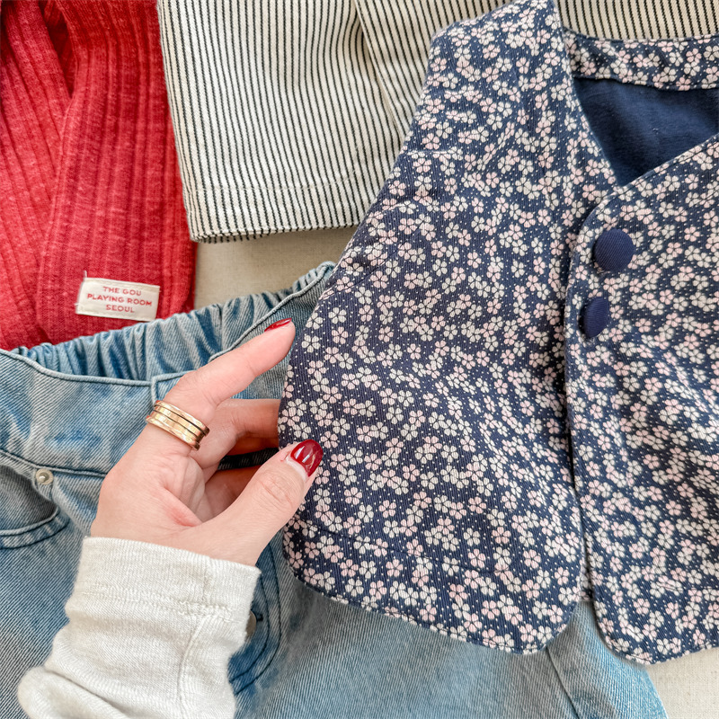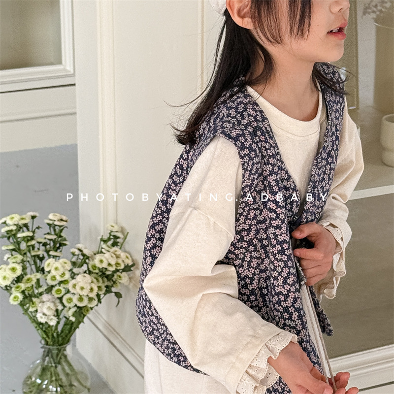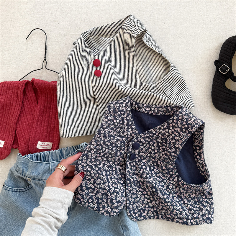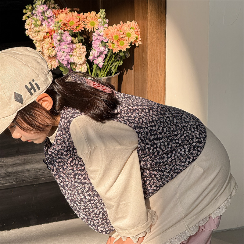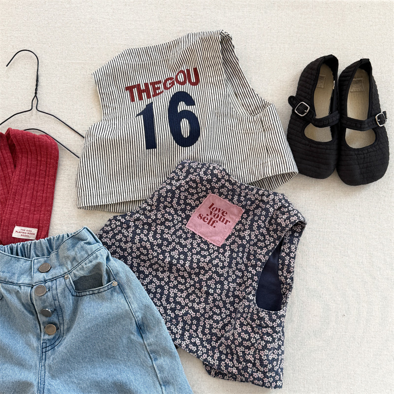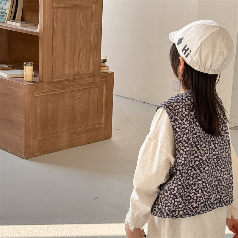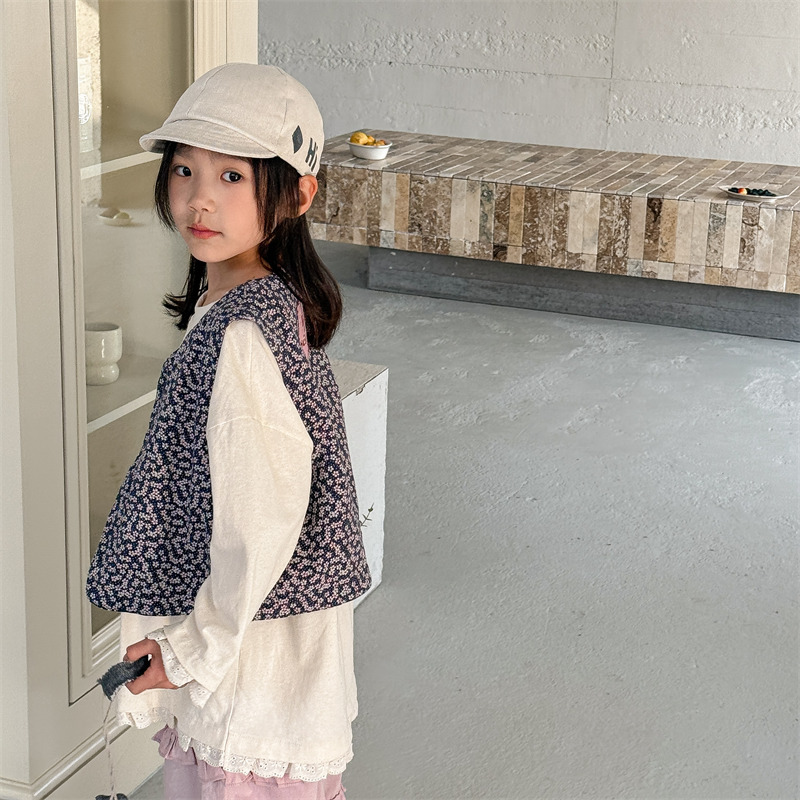 #キッズファッション #ジレベスト #レトロスタイル #ストライプ #フラワープリント #レイヤードコーデ