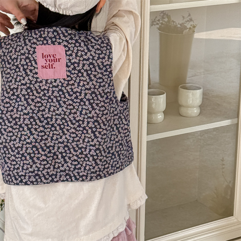 ストライプ柄またはフラワープリントが特徴的なジレベスト。バックにはロゴデザインが施され、レトロな雰囲気を演出します。シンプルなトップスやワンピースに重ねるだけで、コーディネートのアクセントに。季節の変わり目に便利なアイテムです。