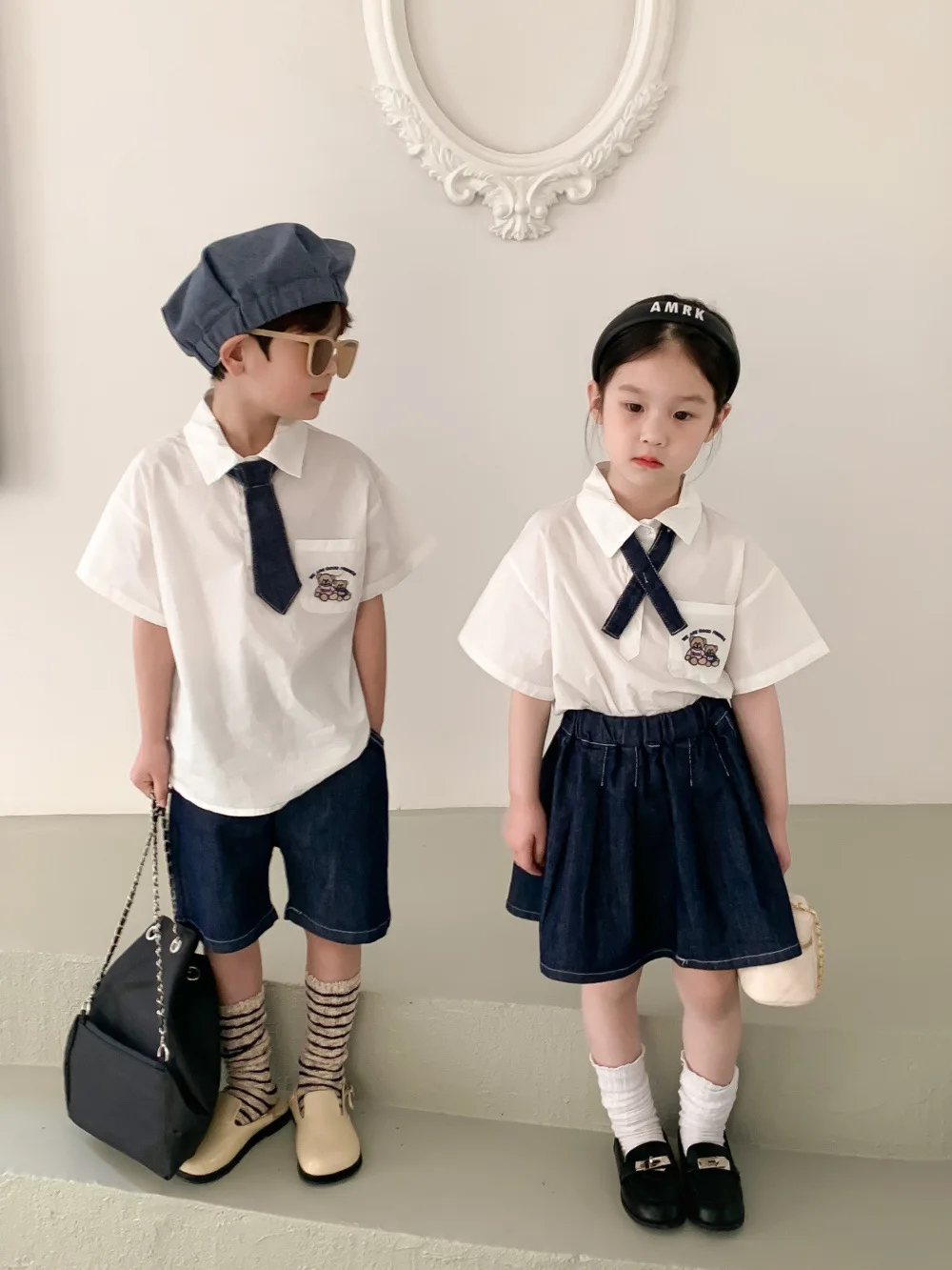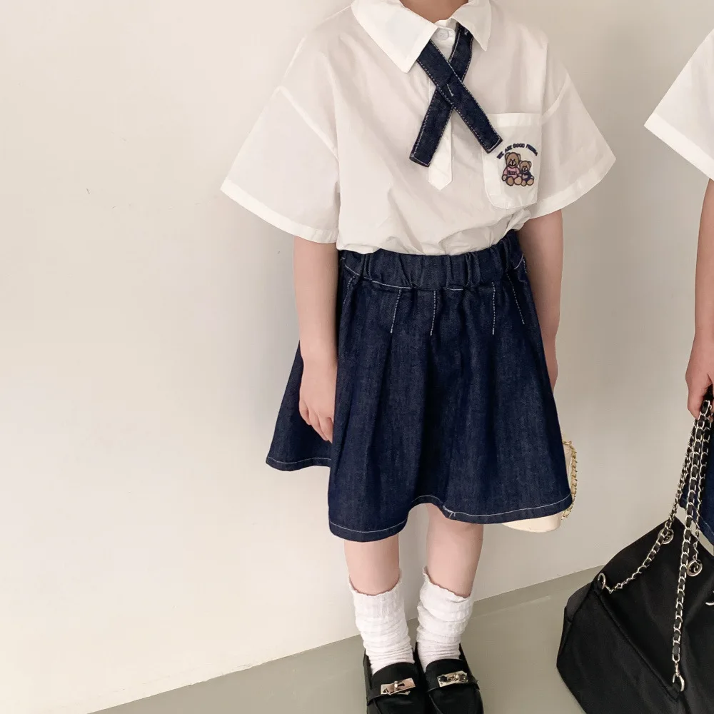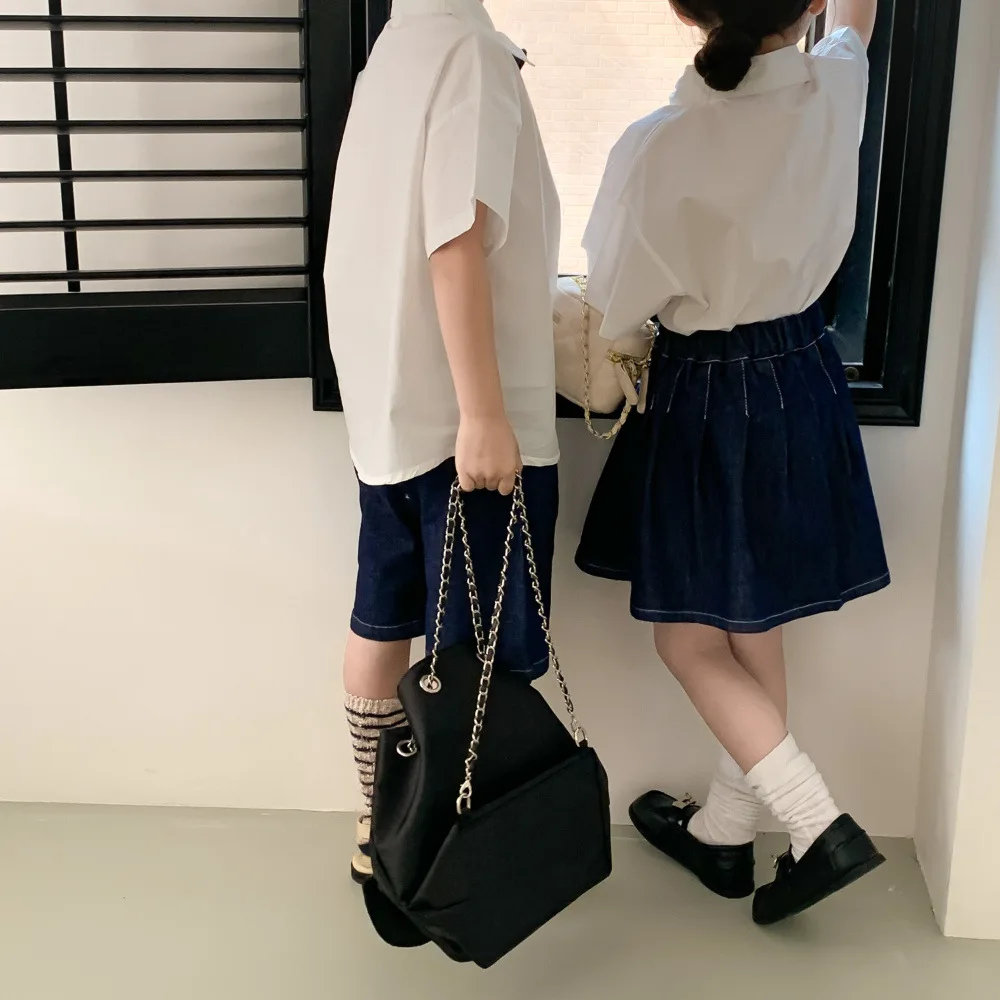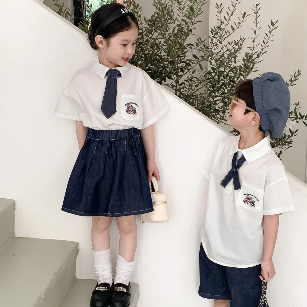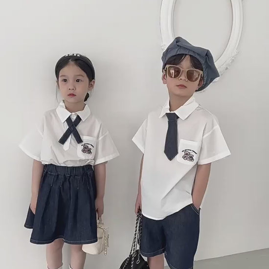 キッズ ユニフォーム 制服 セットアップ ガールズ ボーイズ セット 半袖 シャツ ブラウス デニム スカート ハーフパンツ リンクコーデ【mh0001756】