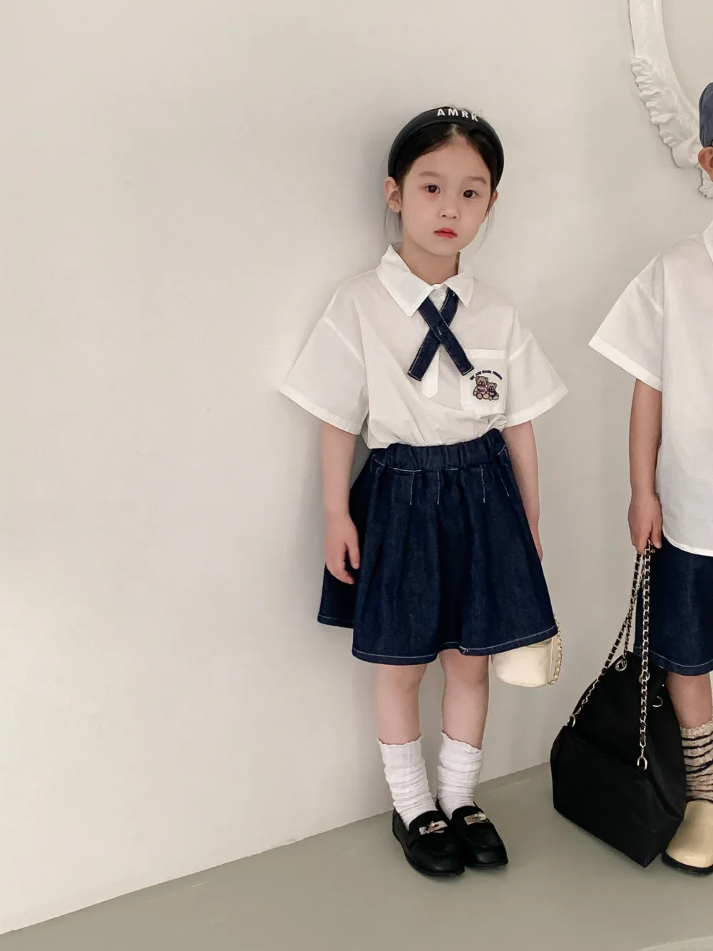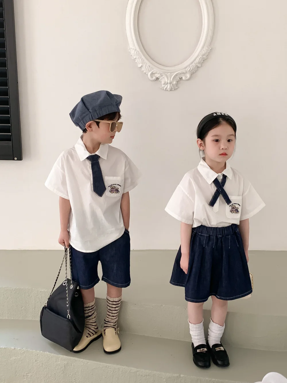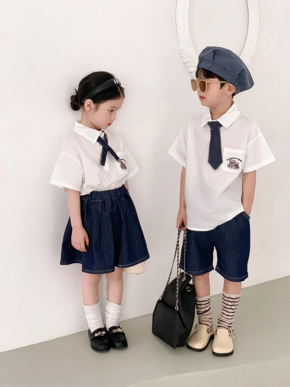 キッズ ユニフォーム 制服 セットアップ ガールズ ボーイズ セット 半袖 シャツ ブラウス デニム スカート ハーフパンツ リンクコーデ【mh0001756】